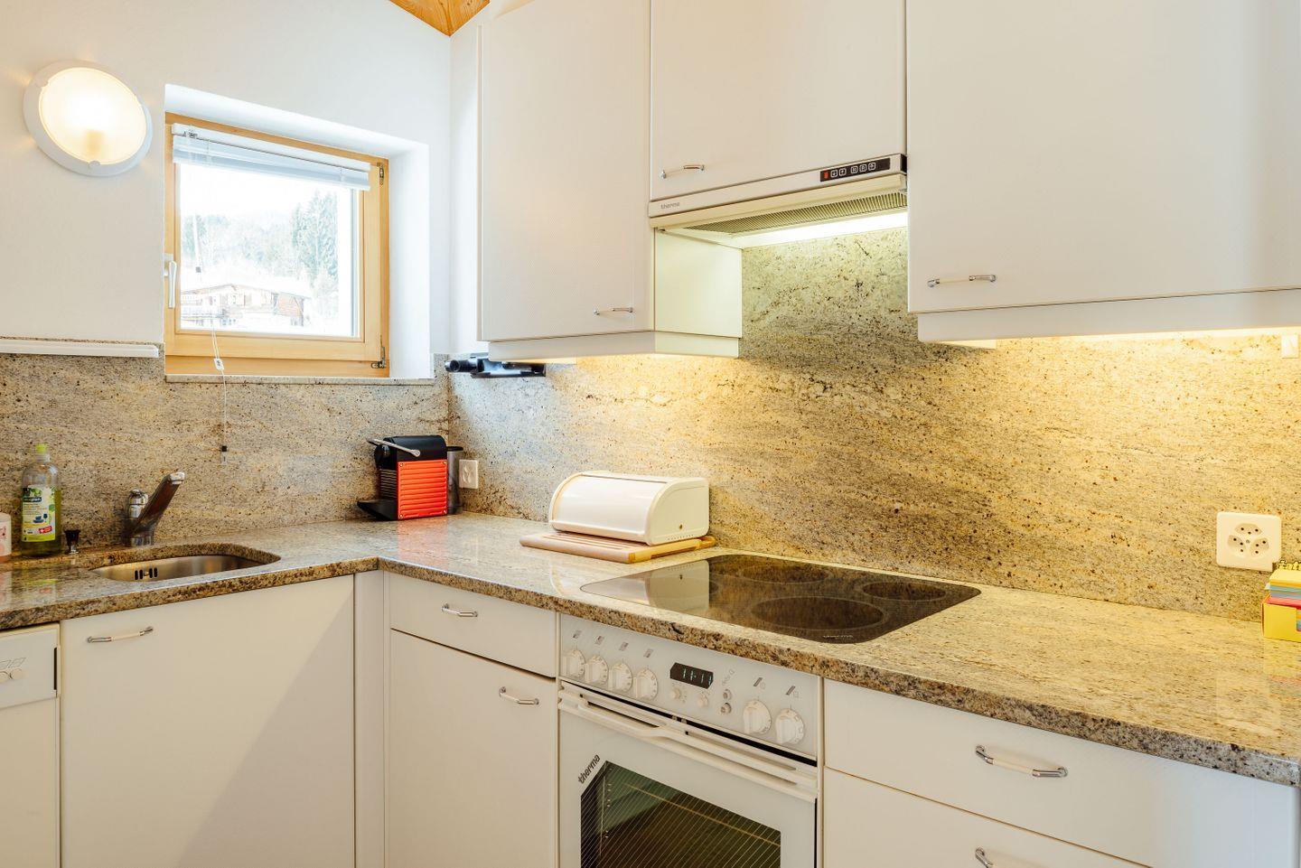 Die separate Küche ist gut ausgestattet mit Kochutensilien, Raclette- und Fondueset, Backofen und 4 Herdplatten. Zudem gibt es einen Kühlschrank mit Gefrierfach und einen Geschirrspüler.
