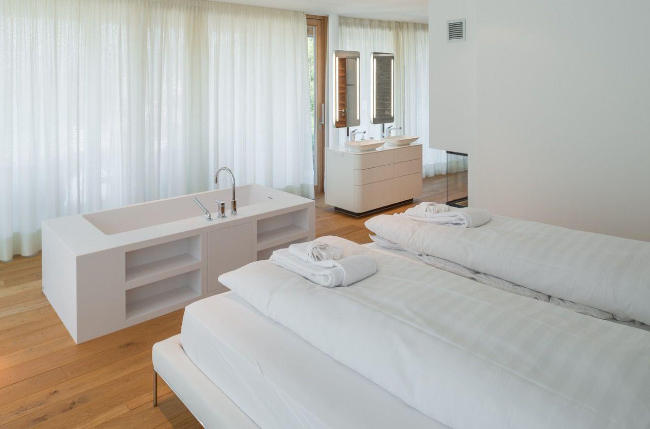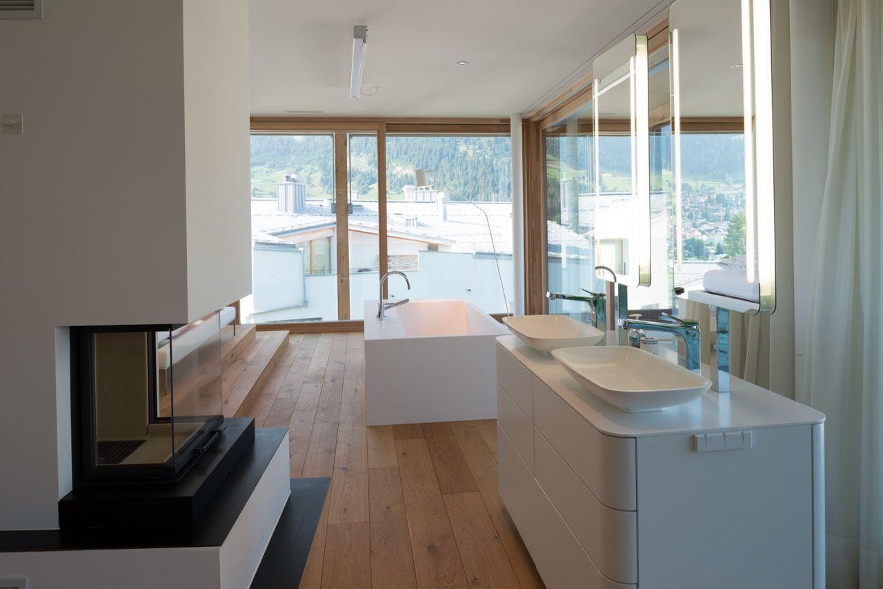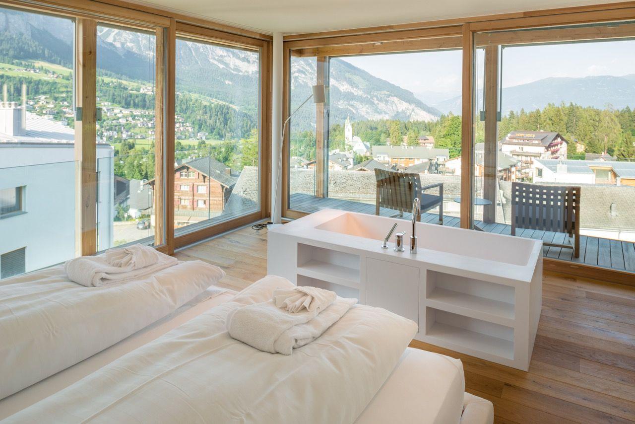 Luxuriöse 4.5 Zimmerwohnung, 3 Schlafzimmer mit TV und jeweils eigenem Badezimmer mit Badewanne (teilweise freistehend im Zimmer) oder Dusche, 240m2 Wohnfläche mit Fussbodenheizung in der Luxus-Ferienwohnungresidenz The Mountain Suites. Nur 10 Gehminuten von der Talstation Flims entfernt. Die Suite ist verfügbar für max. 6 Erwachsene und 2 Kinder. Die Wohnung befindet sich im Hauptteil und liegt im 4. Obergeschoss mit Blickrichtung Nordost und bietet fantastische Aussicht auf die umliegende Bergwelt (Crap Sogn Gion, Tschingelhörner und Flimserstein).