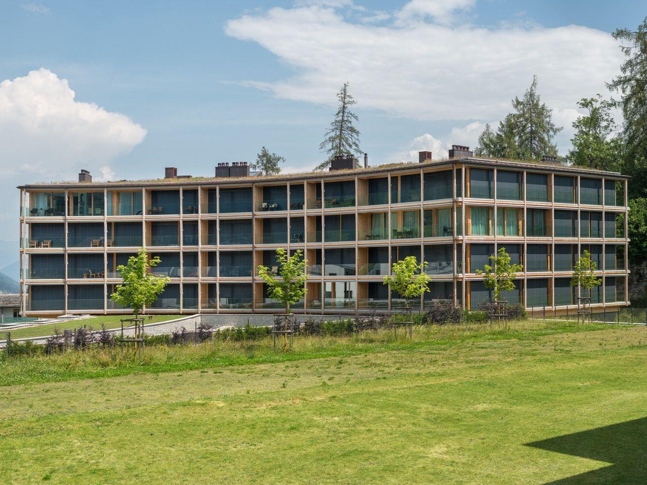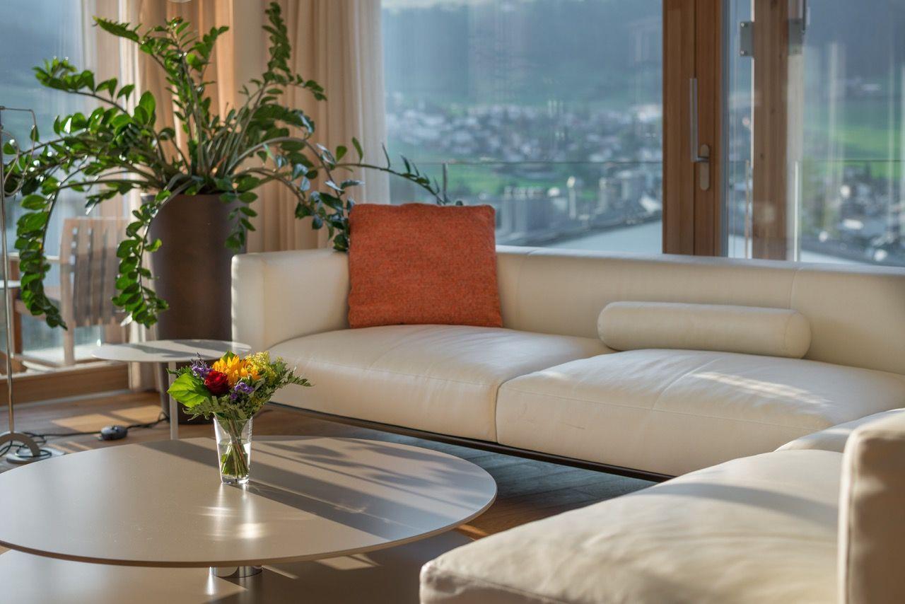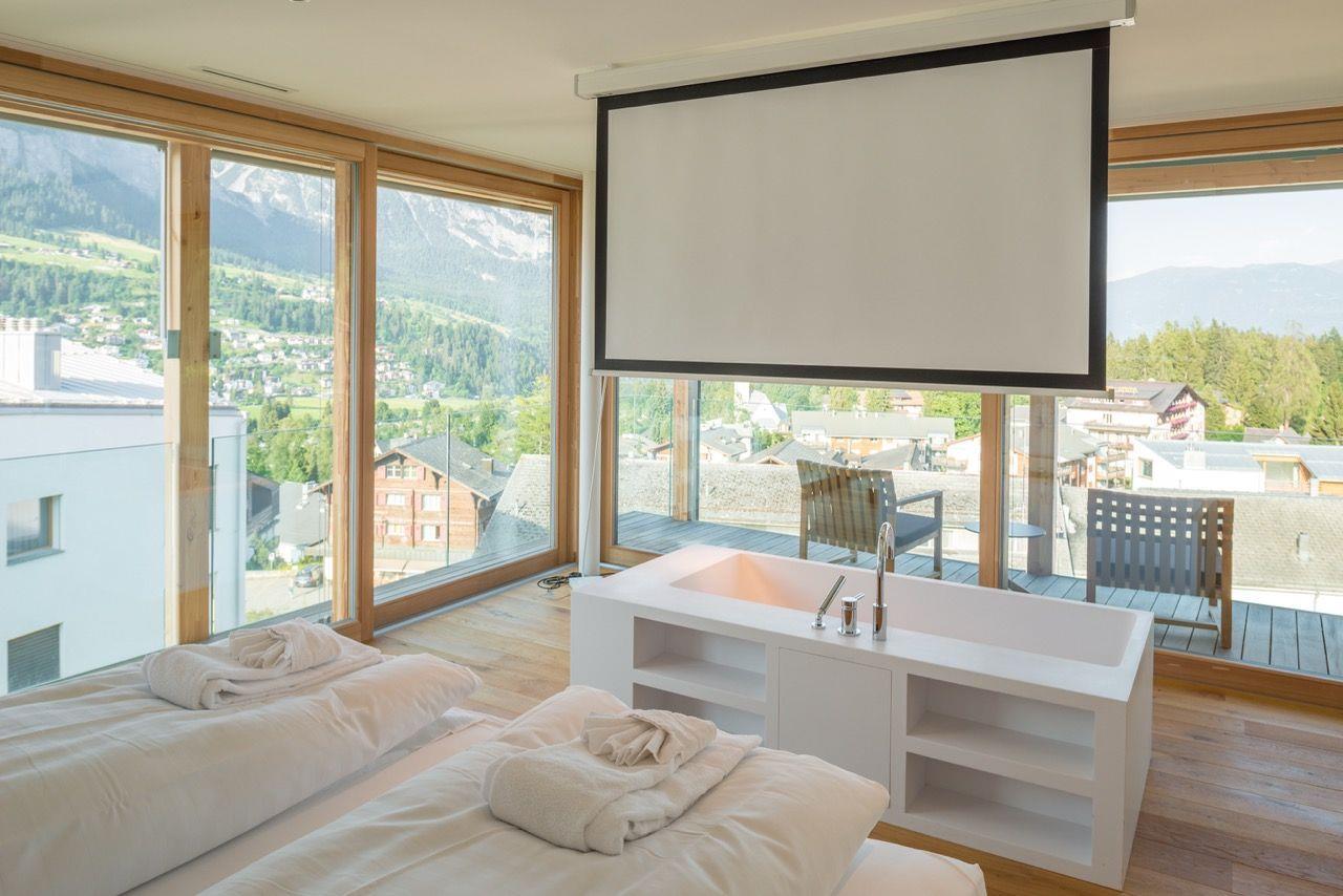 4.5 Zimmer- Suite mit 240qm Wohnfläche, verfügbar für max. 6 Erwachsene und 2 Kinder. Die Wohnung befindet sich im Hauptteil und liegt im 4. Obergeschoss mit Blickrichtung Nordost und bietet fantastische Aussicht auf die umliegende Bergwelt (Crap Sogn Gion, Tschingelhörner und Flimserstein).