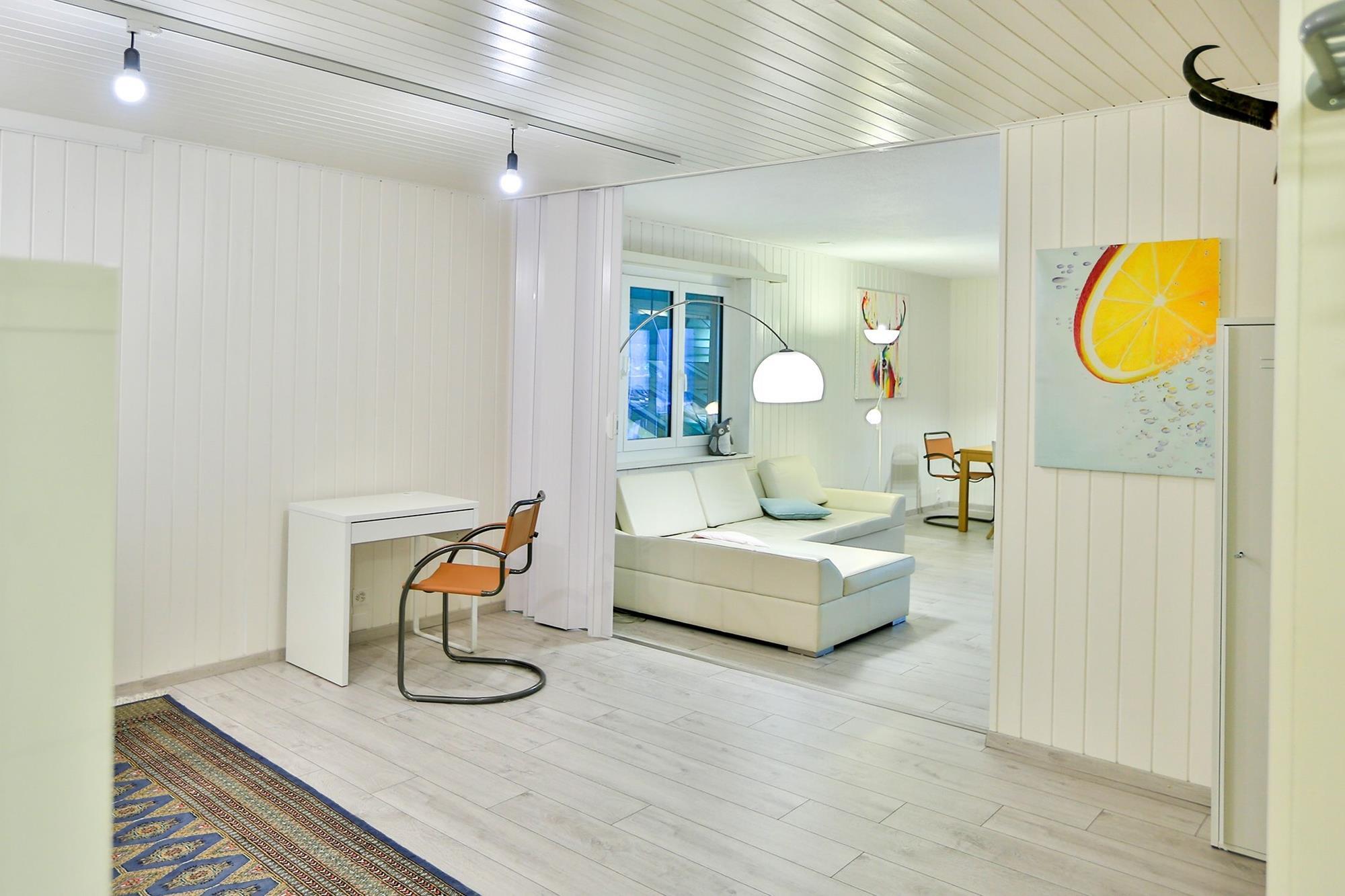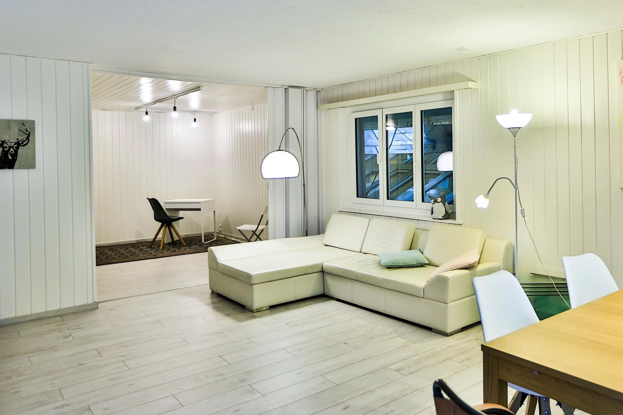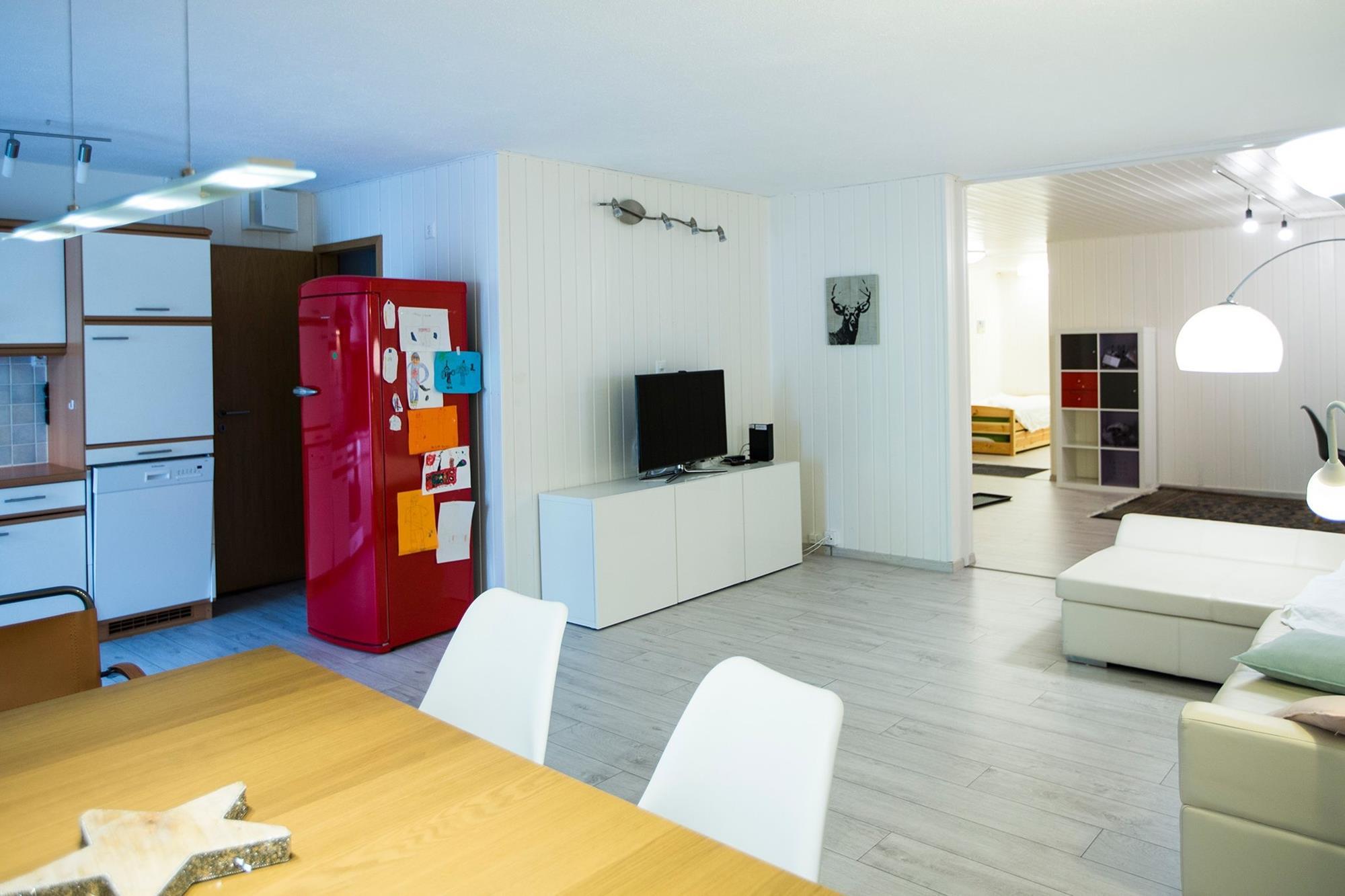 Die Wohnung ist sehr gross, gepflegt und möbliert. WLAN steht kostenfrei zur Verfügung. Ein Kabel-TV mit HD-Qualität inkl. digitales Radio, sowie DVD-Player ist vorhanden. Die Küche ist mit Kühlschrank, Backofen, Kochfeld, Geschirrspülmaschine sowie Kaffeemaschine (Delizio), Mikrowellengerät, Toaster, sowie Wasserkocher ausgestattet.
