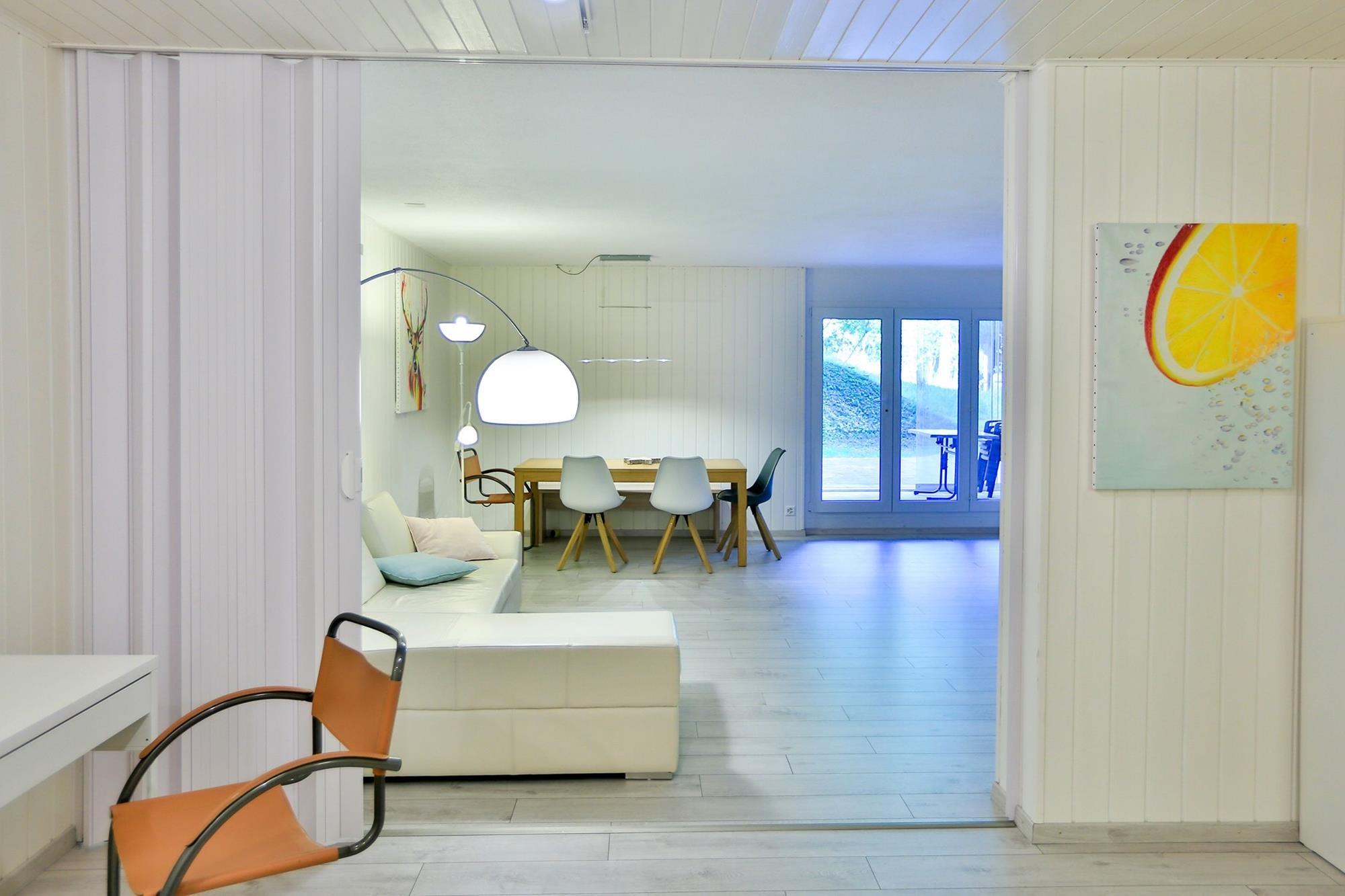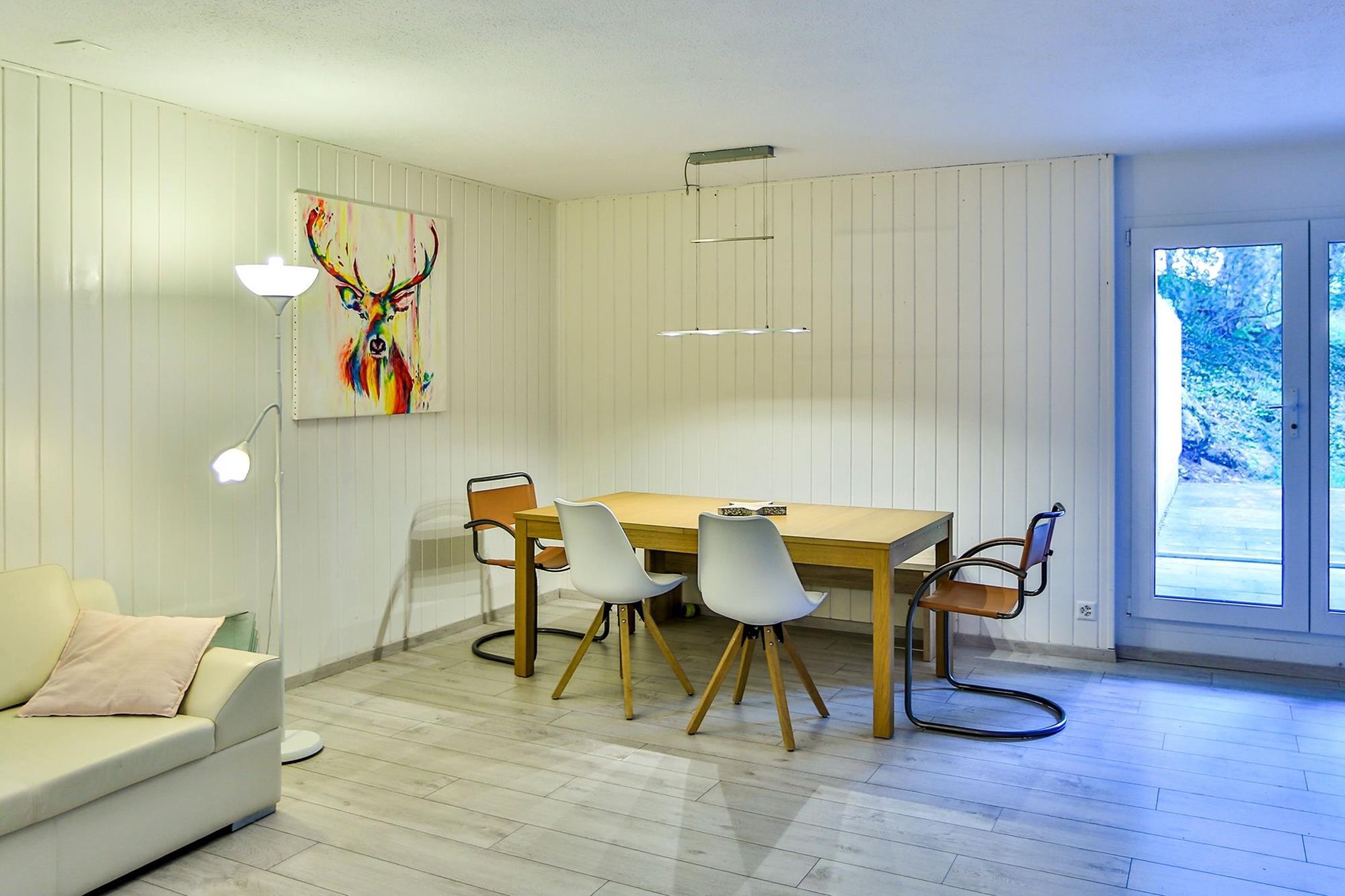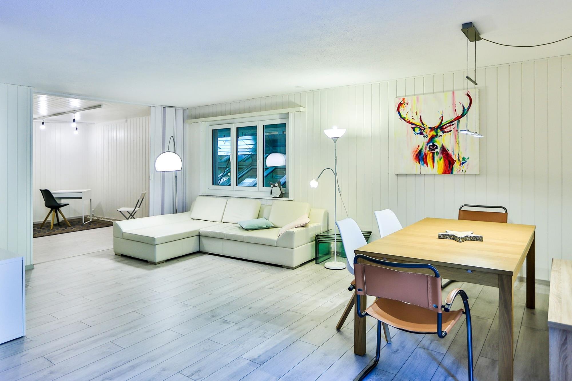 Die Wohnung ist sehr gross, gepflegt und möbliert. WLAN steht kostenfrei zur Verfügung. Ein Kabel-TV mit HD-Qualität inkl. digitales Radio, sowie DVD-Player ist vorhanden. Die Küche ist mit Kühlschrank, Backofen, Kochfeld, Geschirrspülmaschine sowie Kaffeemaschine (Delizio), Mikrowellengerät, Toaster, sowie Wasserkocher ausgestattet.