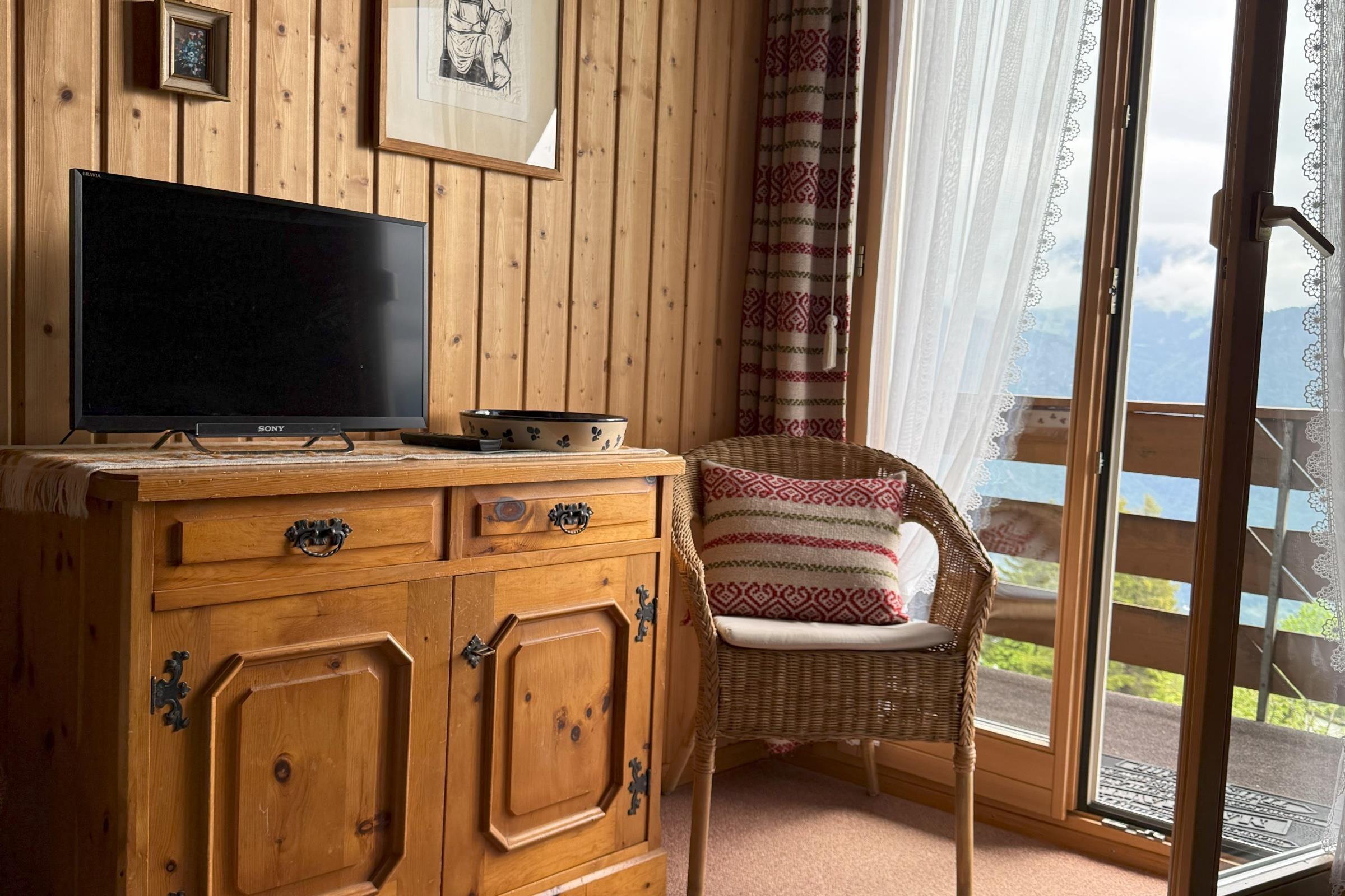 Die Ferienwohnung verfügt über ein Schlafzimmer mit Sofa und Etagenbett, sowie ein Schlaf-/Wohnzimmer mit zwei Einzelbetten ein Badezimmer mit Dusche/WC und Lavabo ein gemütliches Wohnzimmer ein Esszimmer mit einer gut ausgestatteten Küche zwei Balkone mit traumhafter Panoramaaussicht Inneneinrichtung & Technik