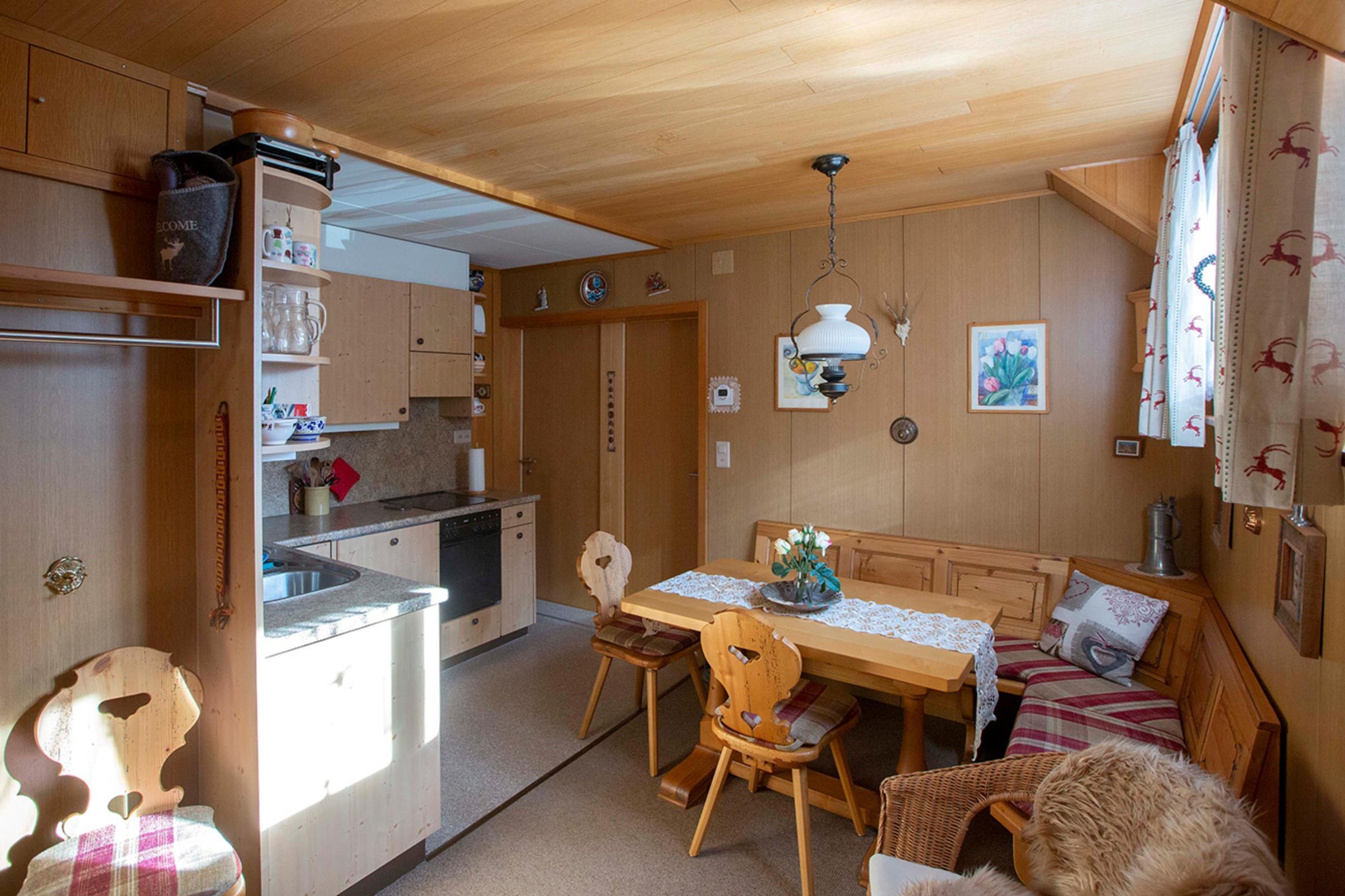 Gut ausgestattete Einbauküche mit Kühlschrank, Kochherd, Backofen, Wasserkocher, Filter-Kaffeemaschine und Toaster. Ebenfalls ist ein Fondue- und Racletteset vorhanden.