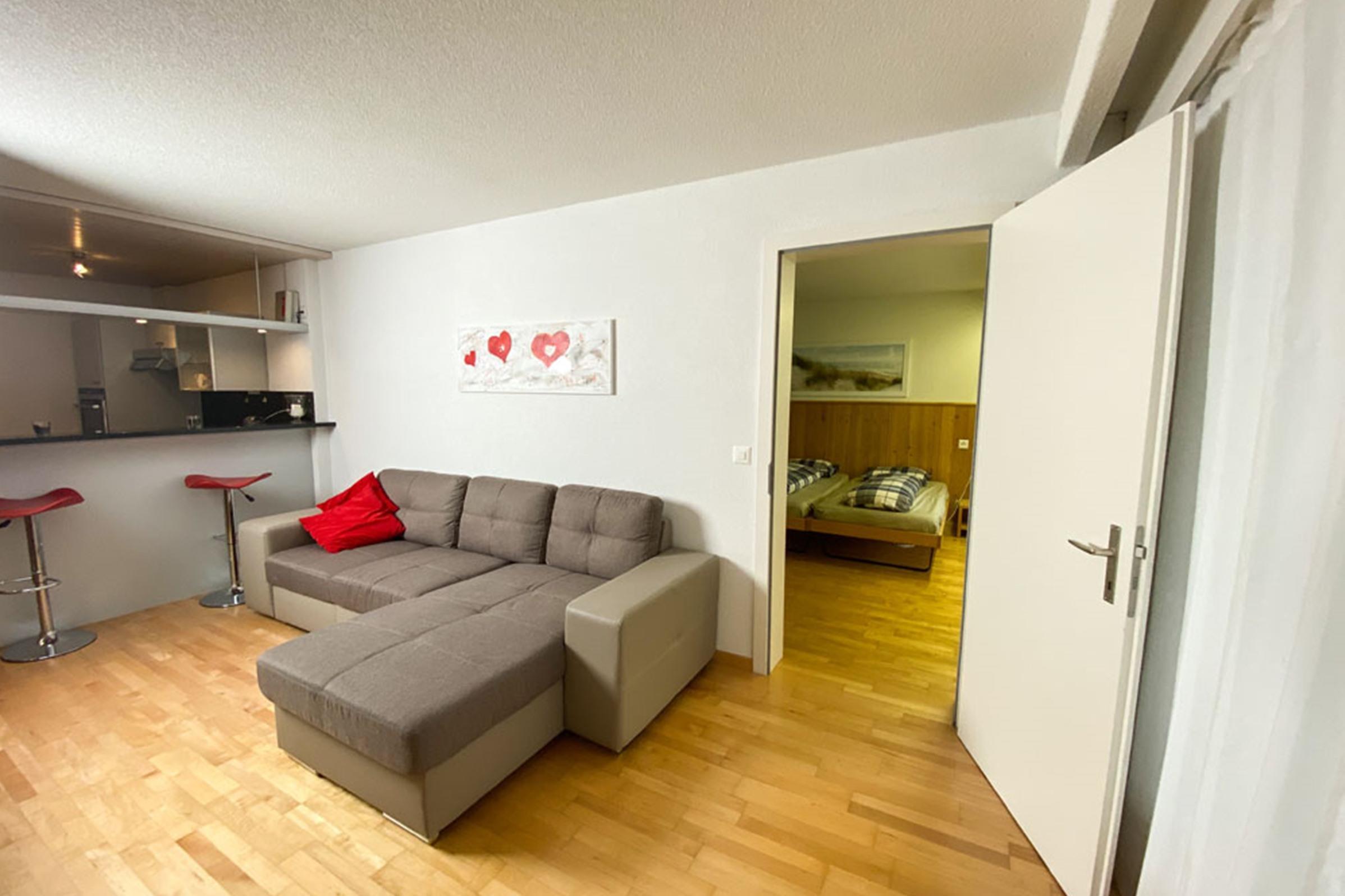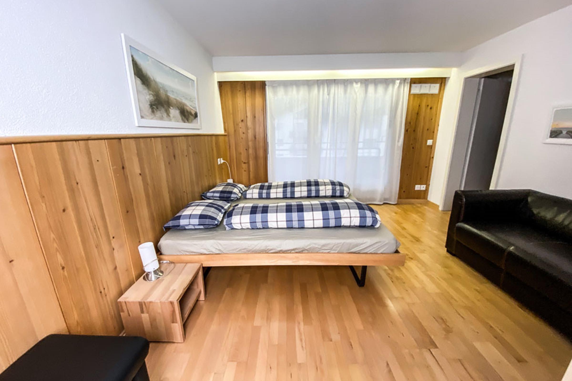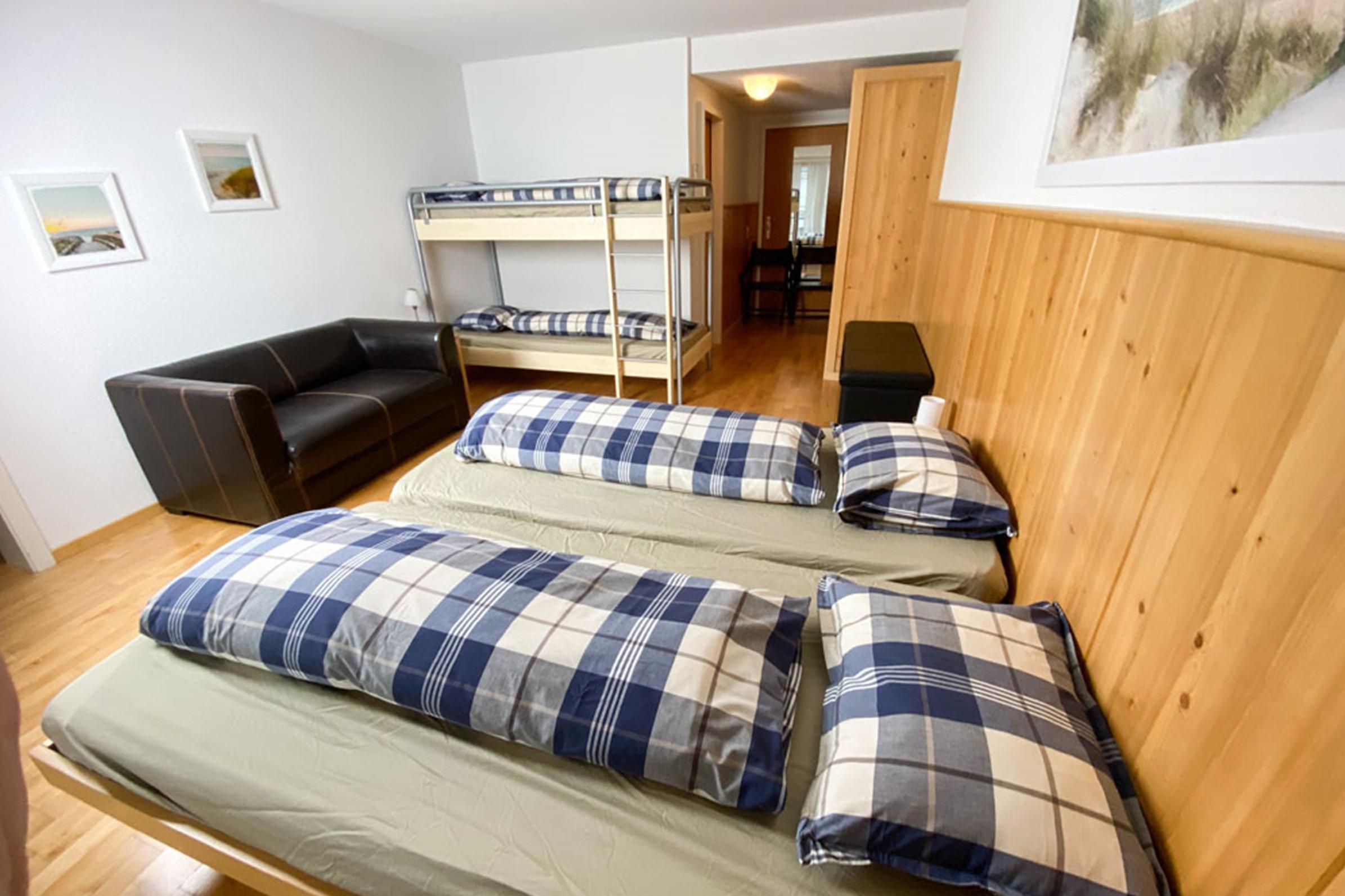 Die Wohnung verfügt über ein Schlafzimmer mit einem Doppelbett, einem Etagenbett und einem Sofabett ein Badezimmer mit Dusche/WC, Lavabo und Haarföhn ein Wohn-/Esszimmer eine voll ausgestattete Küche Inneneinrichtung & Technik