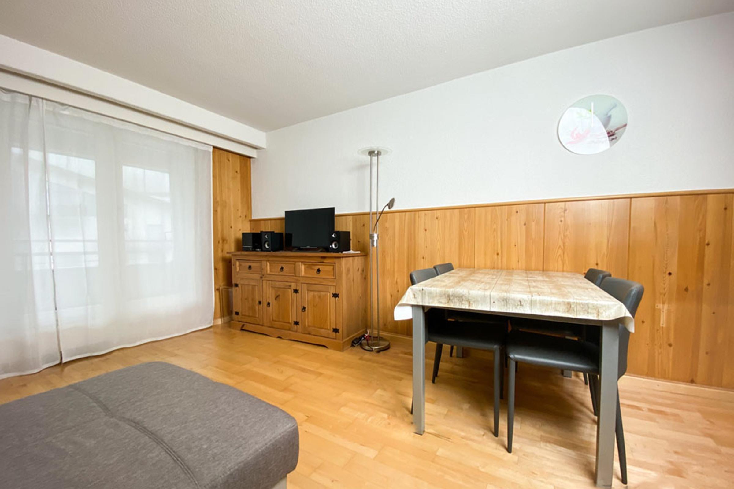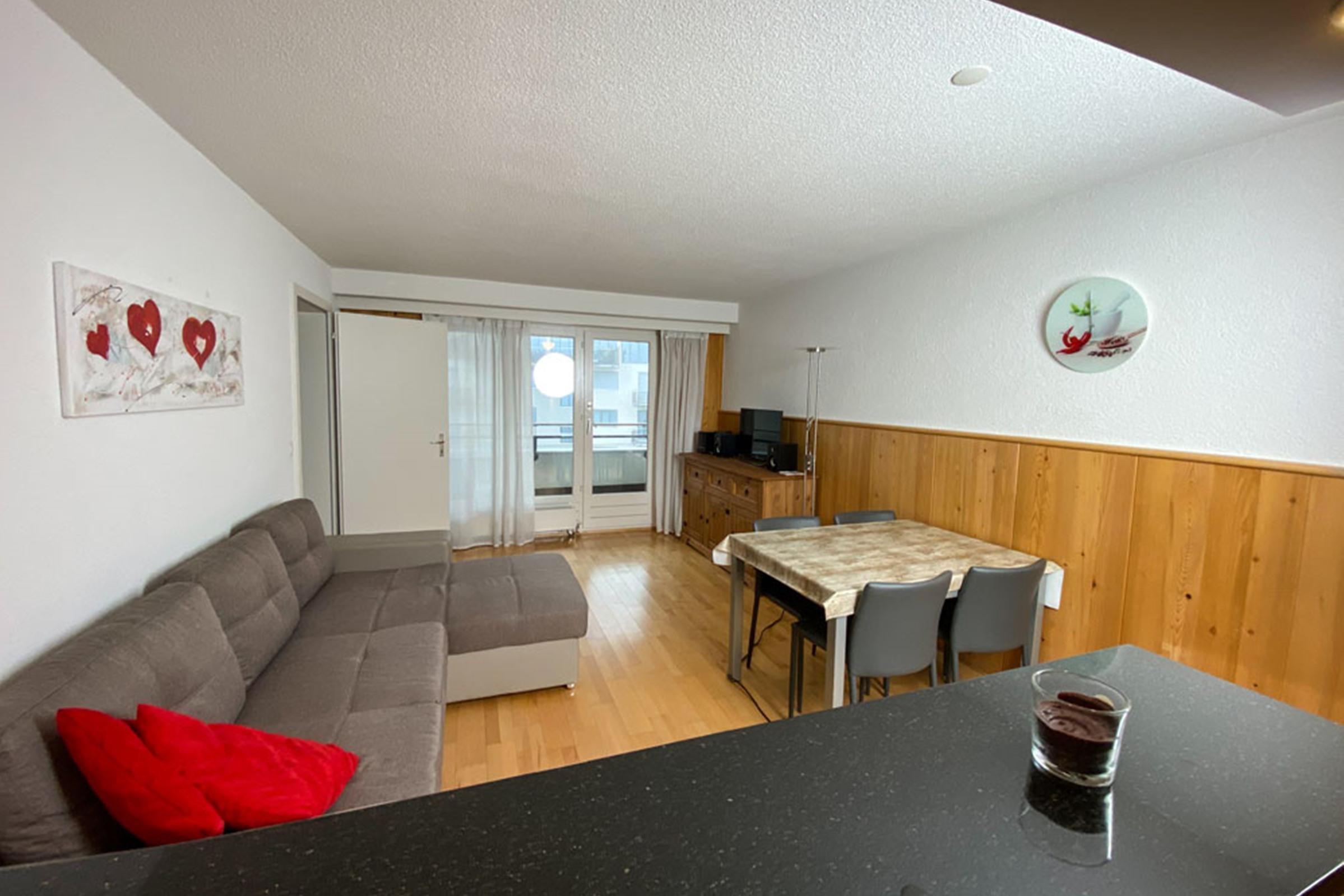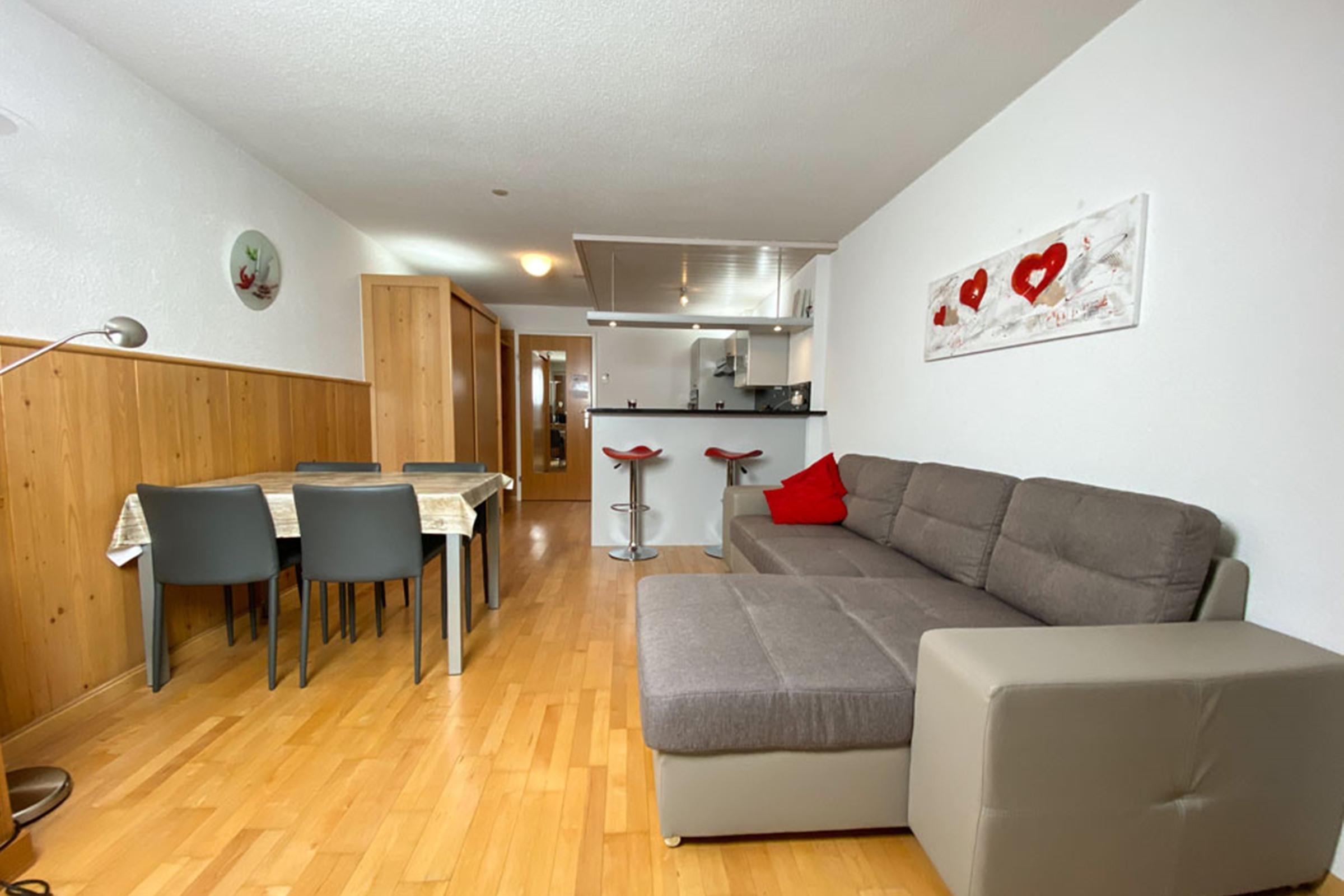 Die Wohnung verfügt über ein Schlafzimmer mit einem Doppelbett, einem Etagenbett und einem Sofabett ein Badezimmer mit Dusche/WC, Lavabo und Haarföhn ein Wohn-/Esszimmer eine voll ausgestattete Küche Inneneinrichtung & Technik