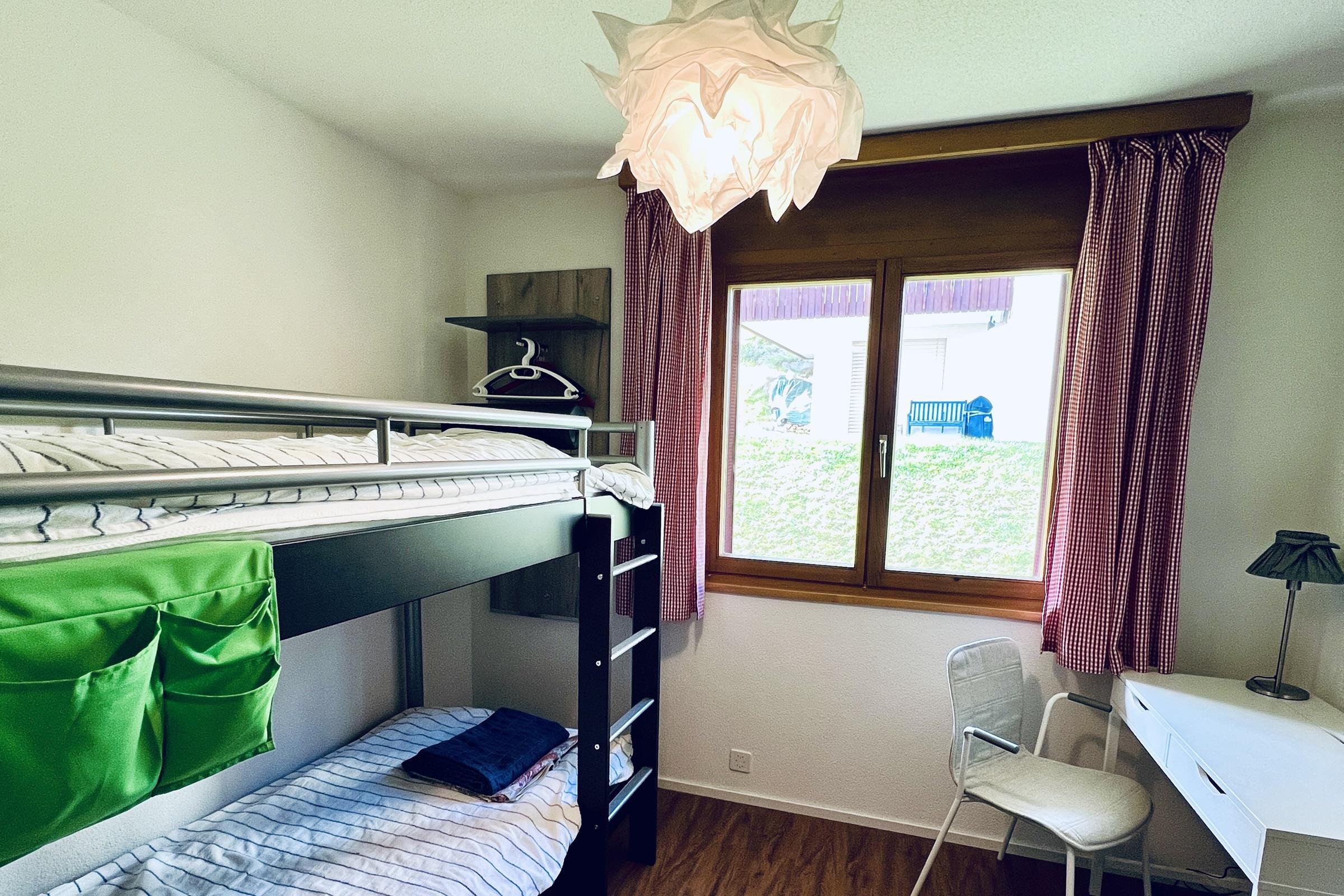 Die Ferienwohnung verfügt über zwei Schlafzimmer; ein Schlafzimmer mit Doppelbett und ein Schlafzimmer mit einem Stockbettein Badezimmer mit Badewanne, WC und Lavaboein offenes Wohn-/Esszimmereine voll ausgestattete KücheInneneinrichtung & Technik