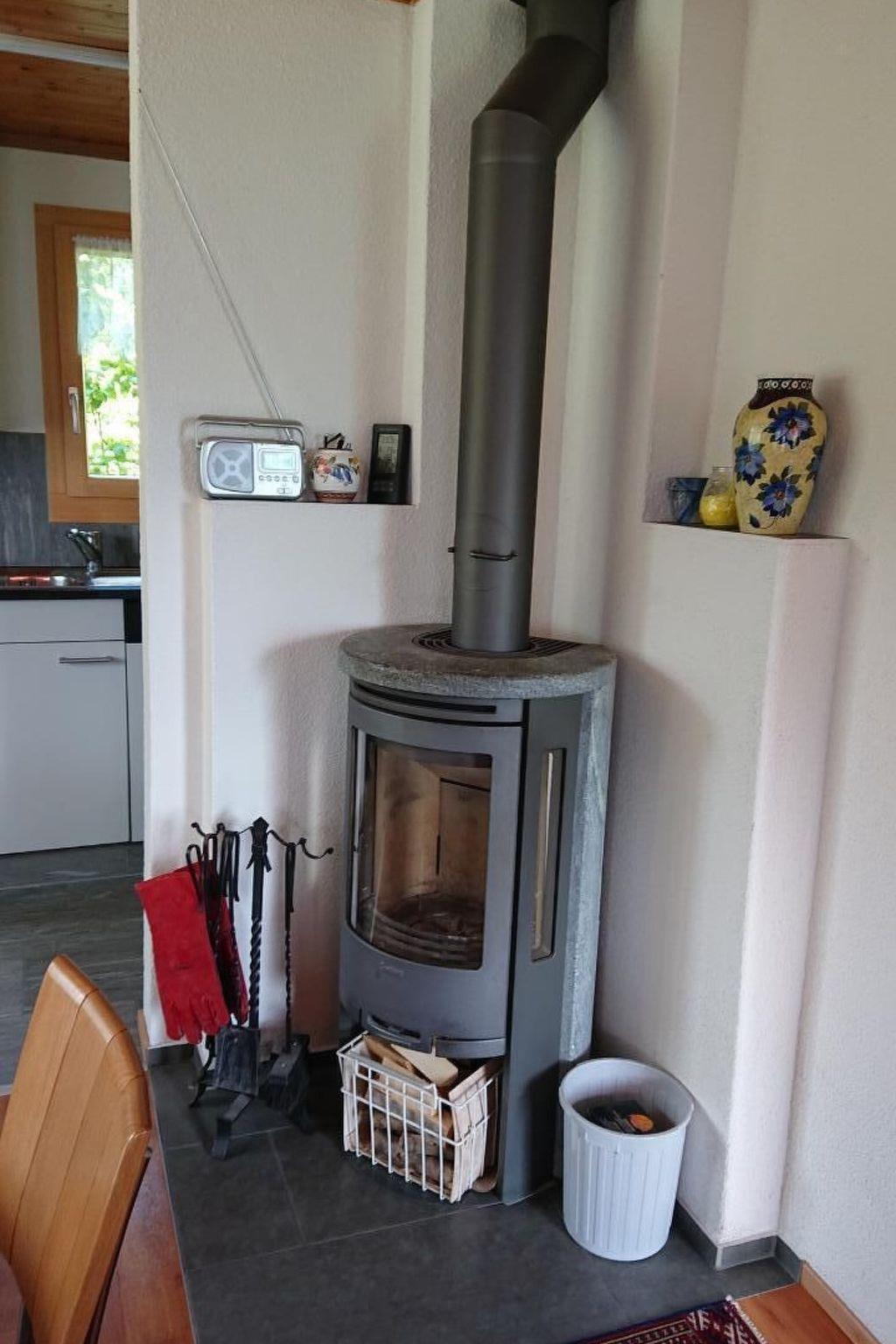 Im Eingangsbereich befindet sich ein Wohnraum mit grossem Esstisch und vollausgestatteter Küche sowie einem heimeligen Cheminéeofen.