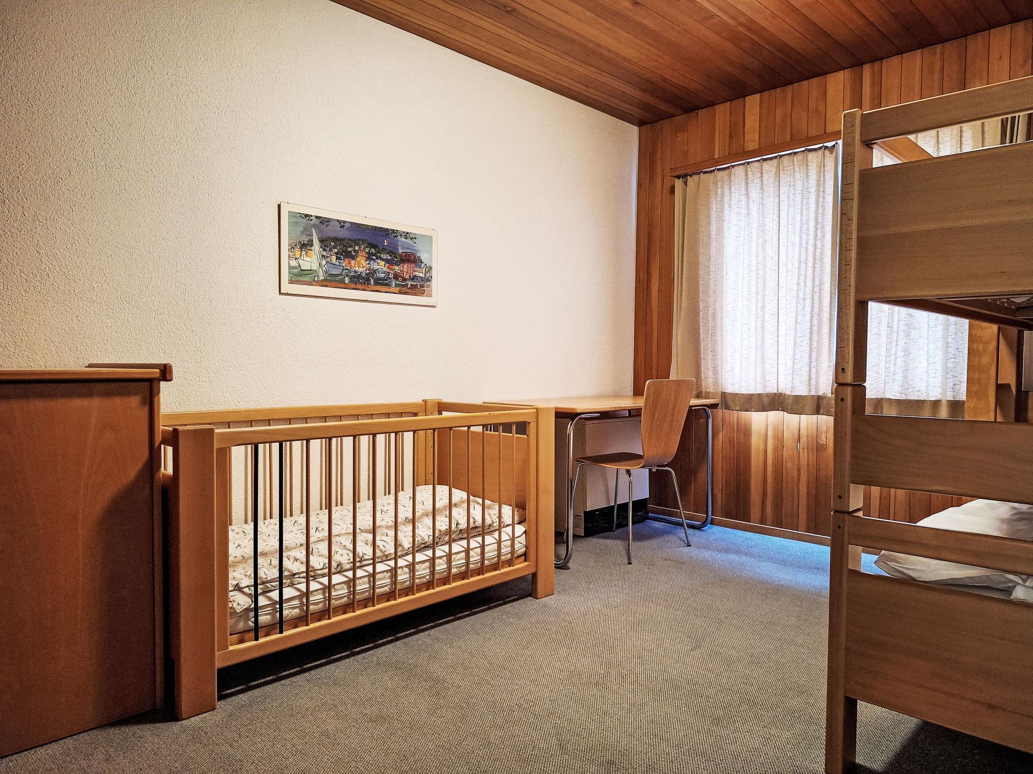"WOKA 1", 5-Zimmer-Doppelhaushälfte auf 2 Stockwerken. Geräumig und hell, zweckmässig und gemütlich eingerichtet: offenes Wohn-/Esszimmer mit Essecke, Radio und E-Heizofen. Ausgang zum Balkon. 1 Zimmer mit 1 Bett (90 cm, Länge 200 cm). Küche (3 Kochplatten, Backofen, Geschirrspüler, Toaster, Wasserkocher, elektrische Kaffeemaschine, Kapseln für die Kaffeemaschine (Delizio) extra, Racletteofen, Fondue Set (Käse)) mit Durchreiche. Sep. WC. E-Heizung. Obergeschoss: 1 Doppelzimmer mit 1 Doppelbett (180 cm, Länge 200 cm). Ausgang zum Balkon. 1 Kinderzimmer mit 1 x 2 Etagenbetten (90 cm, Länge 200 cm). 1 Zimmer mit 2 Betten (90 cm, Länge 200 cm). Bad/Dusche/WC, Doppelwaschbecken. E-Heizung. Grosser Balkon, Südlage und Westlage. Herrliche Panoramasicht auf die Berge und das Tal. Zur Verfügung: Kinderhochstuhl, Babybett (extra), Haartrockner, Wickelkommode. Internet (WLAN, gratis). Garage (2 Autos), Höhe 190 cm. Bitte beachten: geeignet für Familien. Nichtraucher-Unterkunft. Rauchmelder, Feuerlöscher.