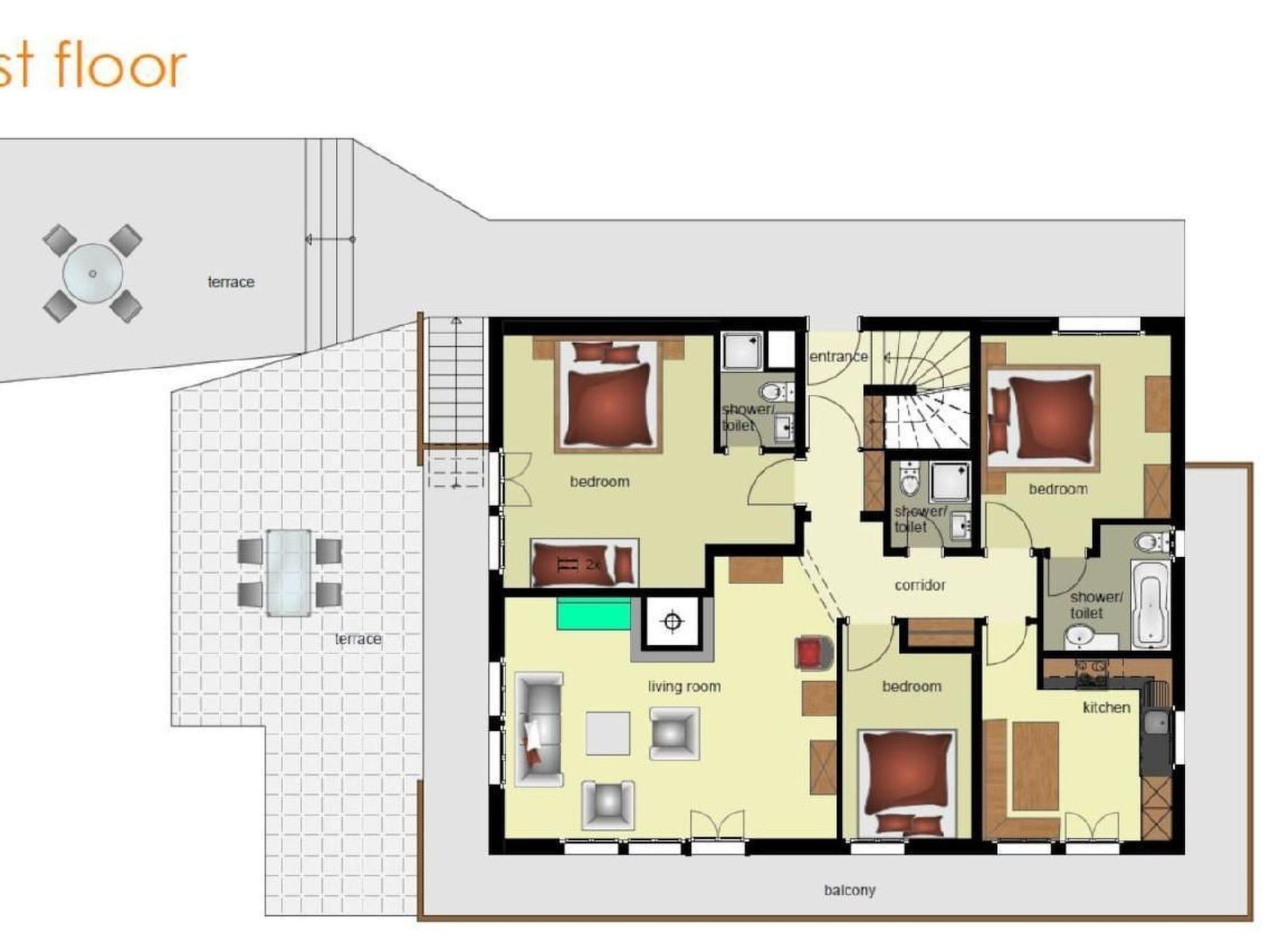 Raumaufteilung: 1 Doppelzimmer mit Badezimmer ensuite. 1 grosses Zimmer mit Doppelbett, Etagenbett und Badezimmer ensuite. 1 Doppelzimmer und separates Badezimmer. 1 Wohnzimmer mit Cheminée. 1 Küche mit Esstisch. Grosse Sonnenterrasse. Balkon. Garten mit Rasenfläche.