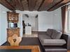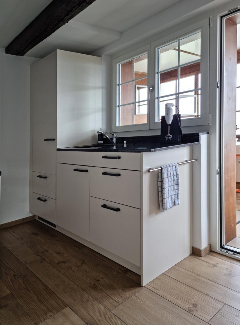 Die Wohnung wird durch eine Laube, mit direkten Zugang von aussen, erschlossen. Anschliessend folgt die Küche und das Ess- und Wohnzimmer, von welchem aus man direkt in den Schlafbereich kommt. Auf Wunsch kann ein zusätzliches Kinderbett aufgestellt werden.