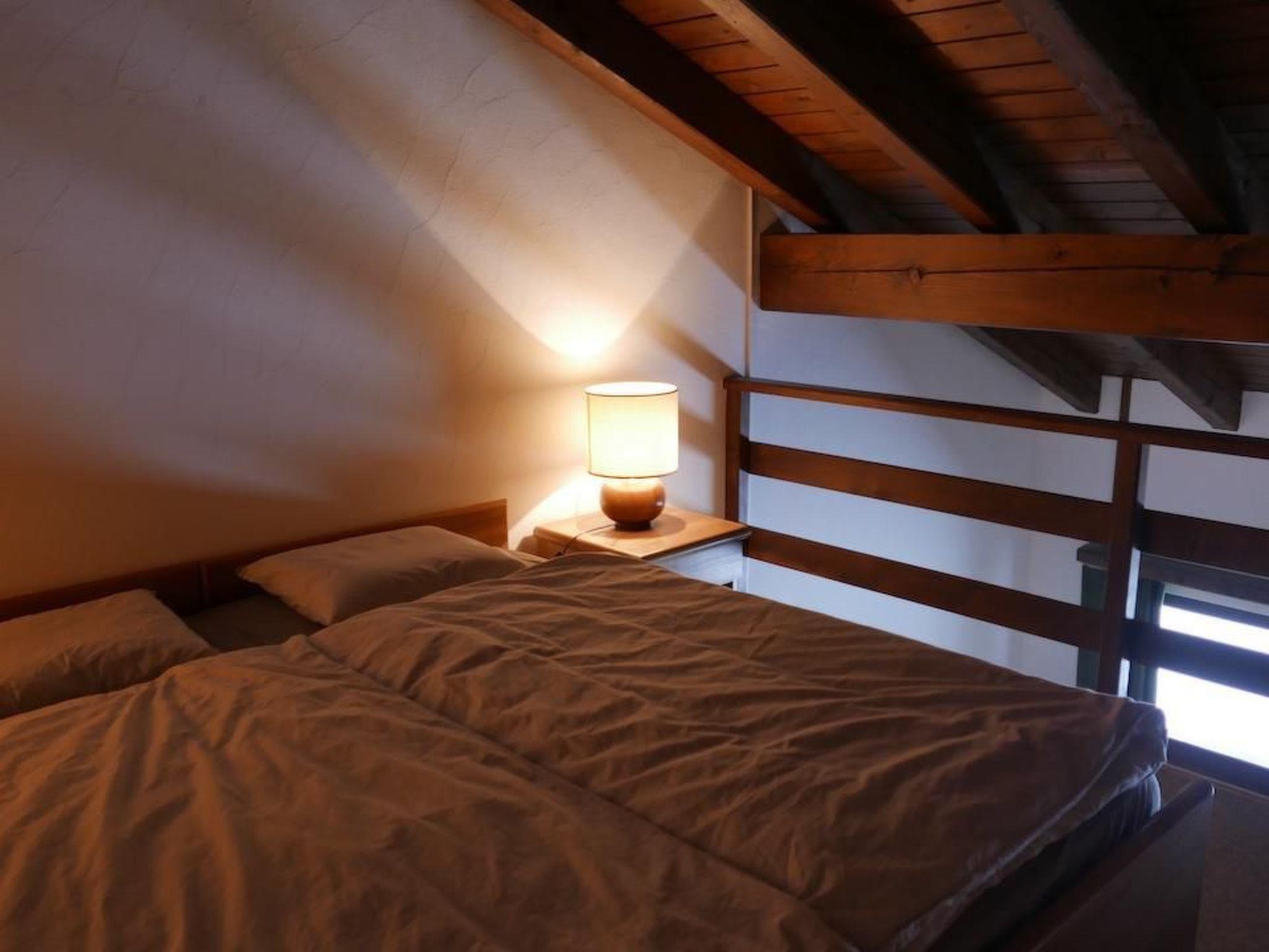 Eine Holztreppe führt zur offenen Galerie, welche mit einem Doppelbett und Schränken ausgestattet ist.