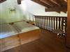 Eine Holztreppe führt zur offenen Galerie, welche mit einem Doppelbett und Schränken ausgestattet ist.