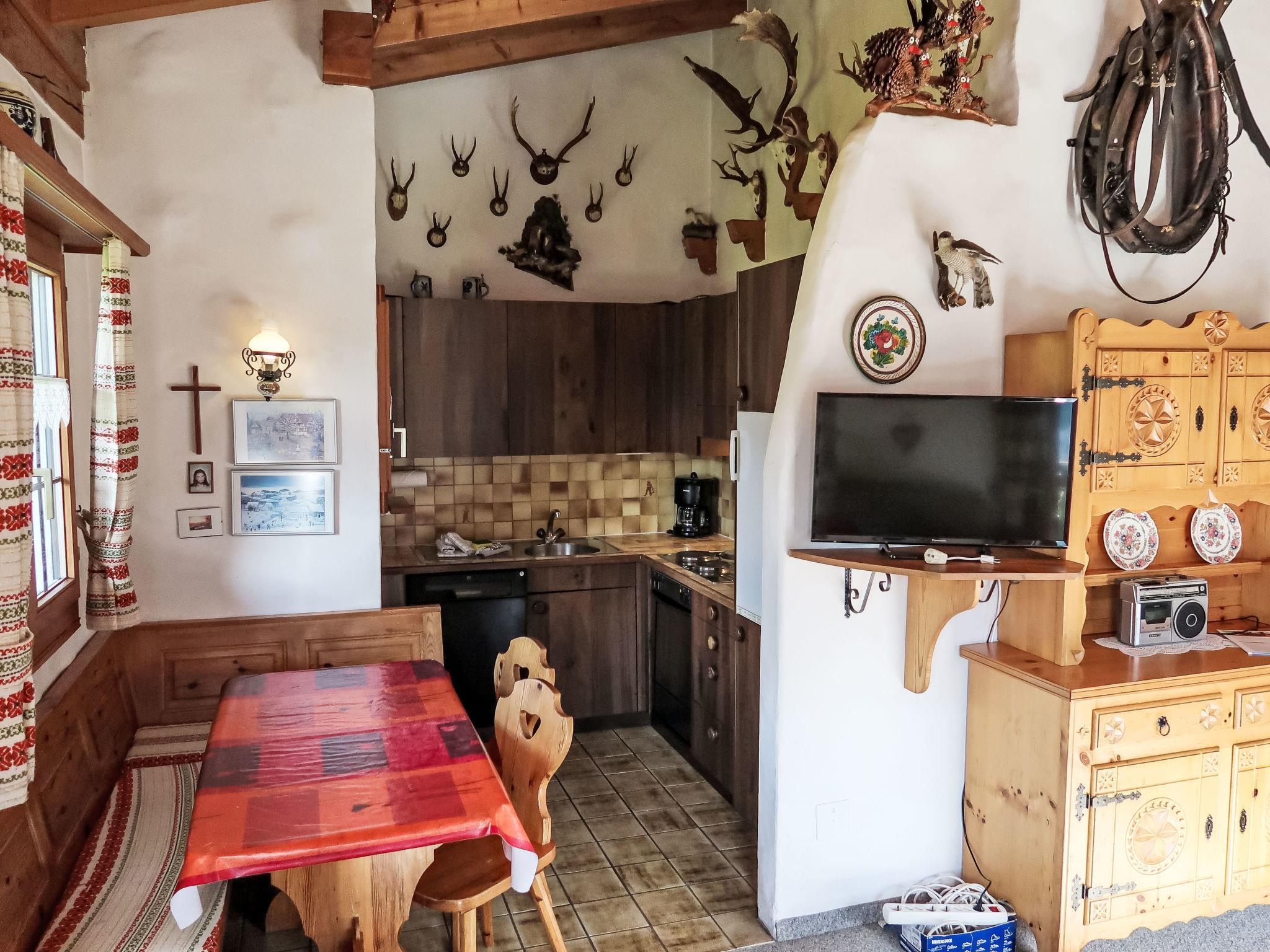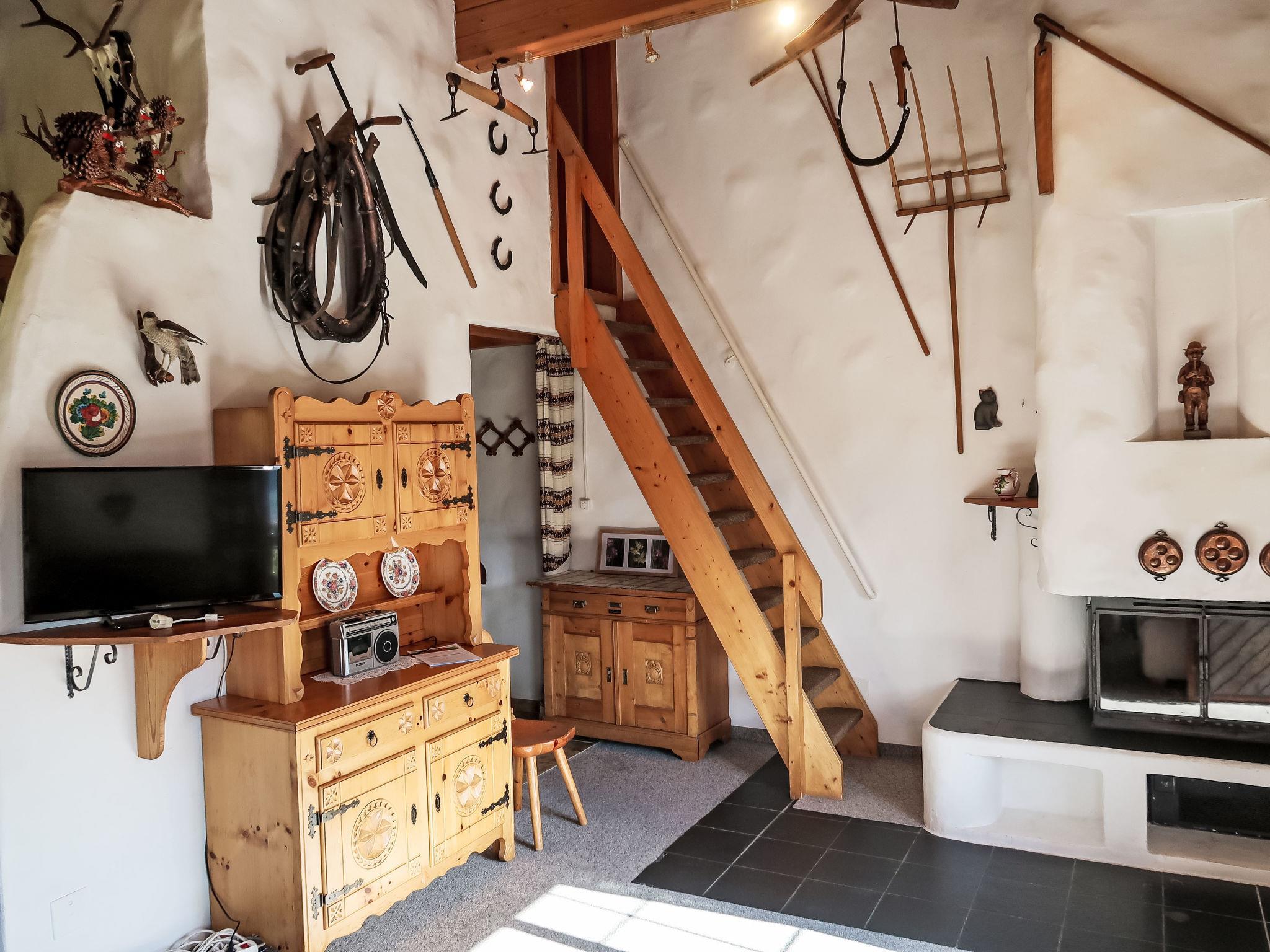 "Muotta Sulegl 4", 3-Zimmer-Wohnung 60 m2 auf 2 Stockwerken im 1. Stock, Südlage. Objekt geeignet für 2 Erwachsene + 2 Kinder. Rustikal und gemütlich eingerichtet: Wohn-/Esszimmer mit offenem Kamin (nur Deko), Essecke und Sat-TV (Flachbildschirm). Ausgang zum Balkon. 1 Doppelzimmer. Offene Küche (3 Kochplatten, Backofen, Geschirrspüler, Toaster, Wasserkocher). Dusche/WC. Obergeschoss: (steile Treppe) 1 abgeschrägtes Zimmer mit 2 Betten. Fussbodenheizung. Balkon 15 m2, Südlage. Balkonmöbel. Schöne Panoramasicht auf die Berge, das Tal und die Landschaft. Parkplatz beim Haus. Bitte beachten: Nichtraucher-Unterkunft.