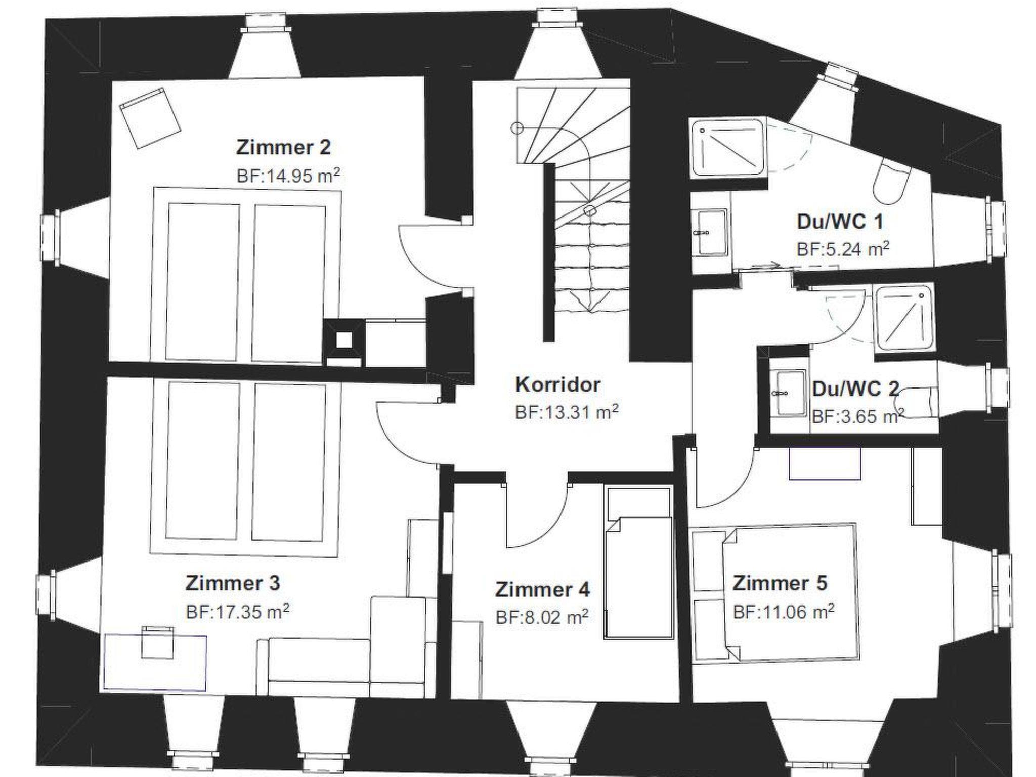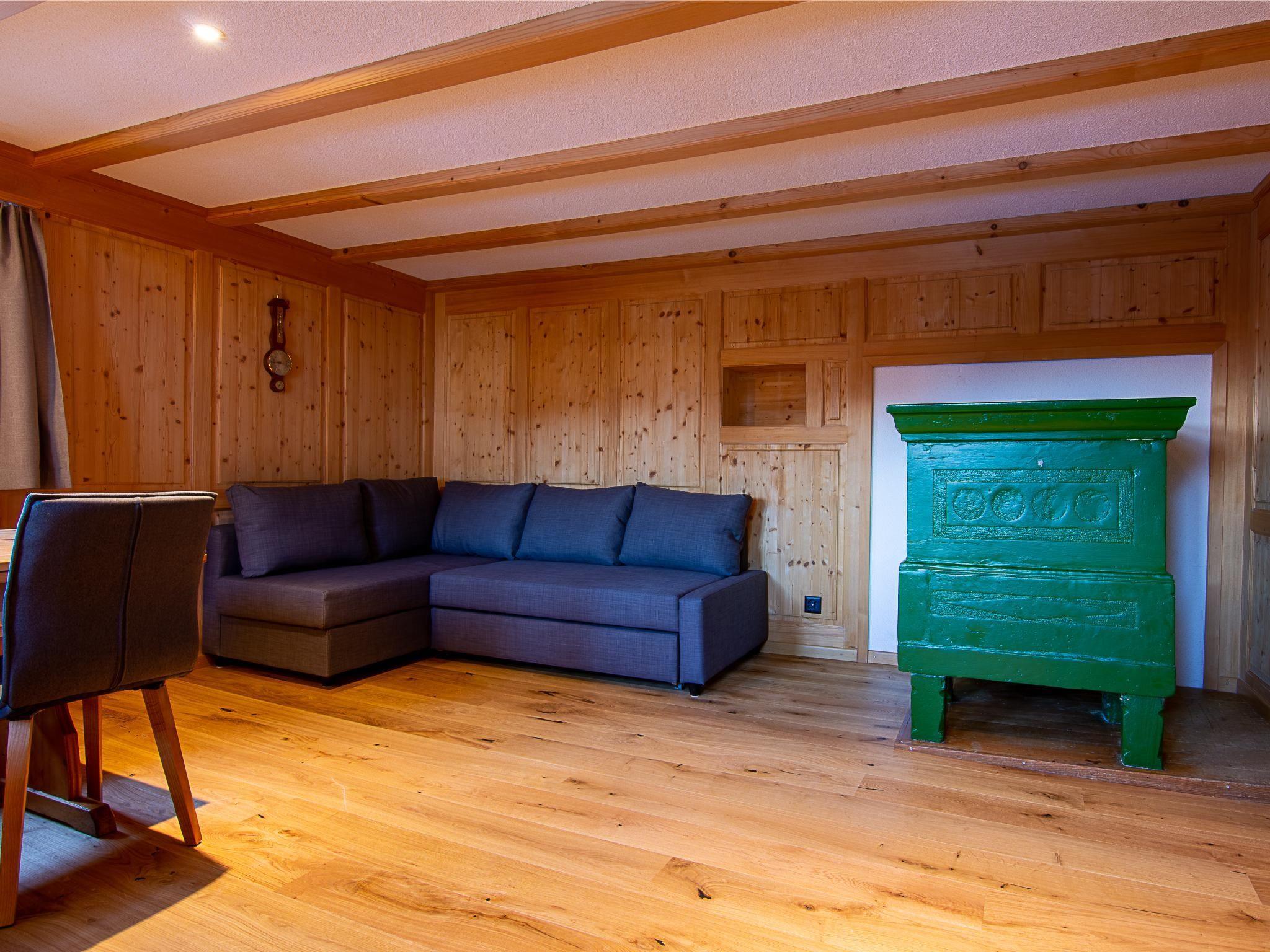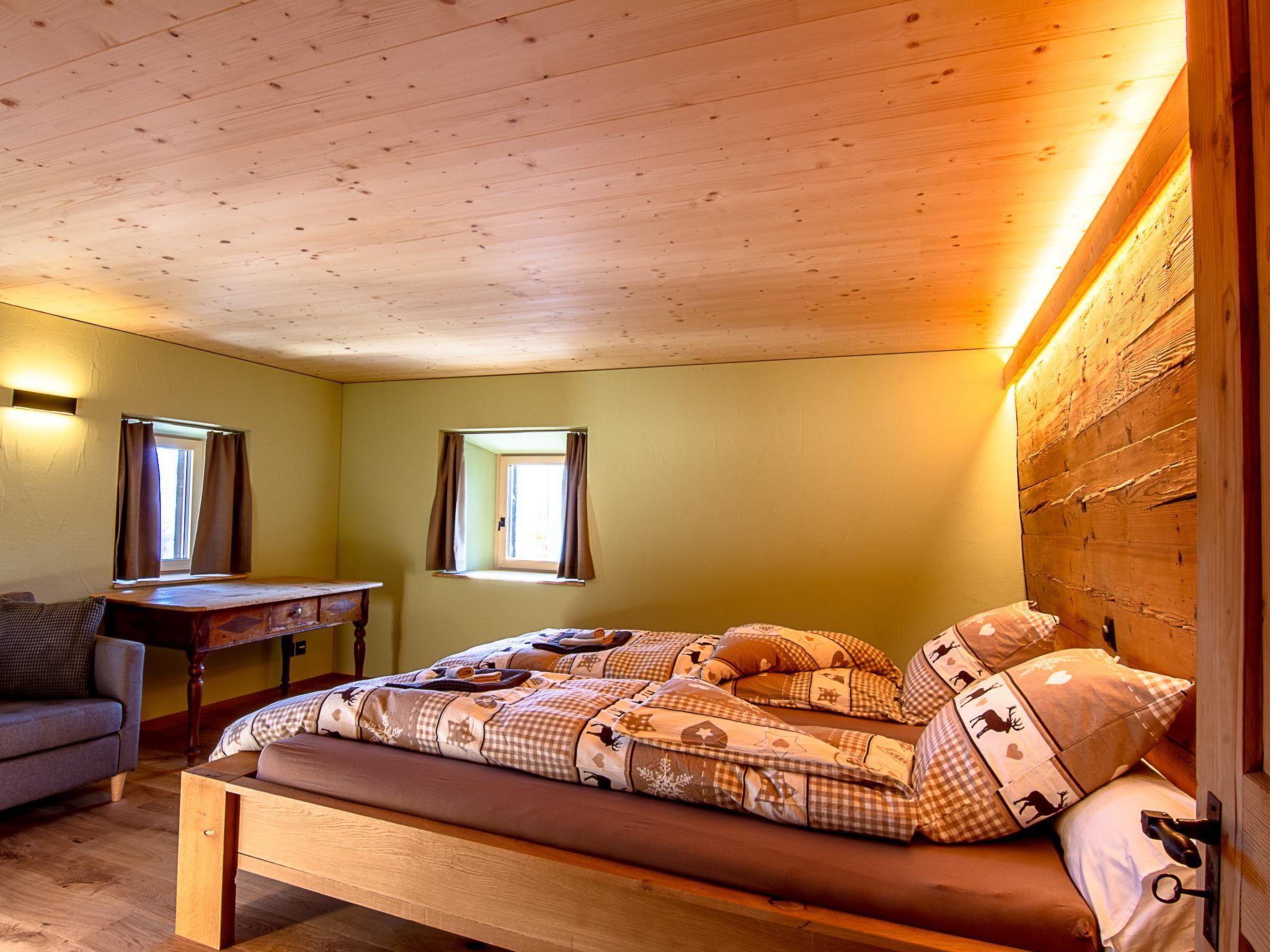 Im Erdgeschoss: ein Schlafzimmer mit Doppelkajütenbett, eine Nasszelle mit Bad/Dusch/WC, ein Spielzimmer mit Ausziehsofa sowie eine Waschküche mit Garderobe und grossem Skischuhtrockner. Obergeschoss: Schlafgeschoss mit 4 Schafzimmern, zwei Nasszellen mit jeweils einer Dusche/WC. Im neu ausgebauten Dachgeschoss: grosszügige moderne Küche mit Backofen, Mikrowelle, grossem Kühlschrank, Induktionskochherd. Die Küche ist mit Geschirr für 14 Personen ausgestattet. Der Essbereich verfügt über einen 3.60m grossen massiven Holztisch. Der Wohnbereich ist durch einen modernen Cheminéeofen vom Essbereich getrennt.