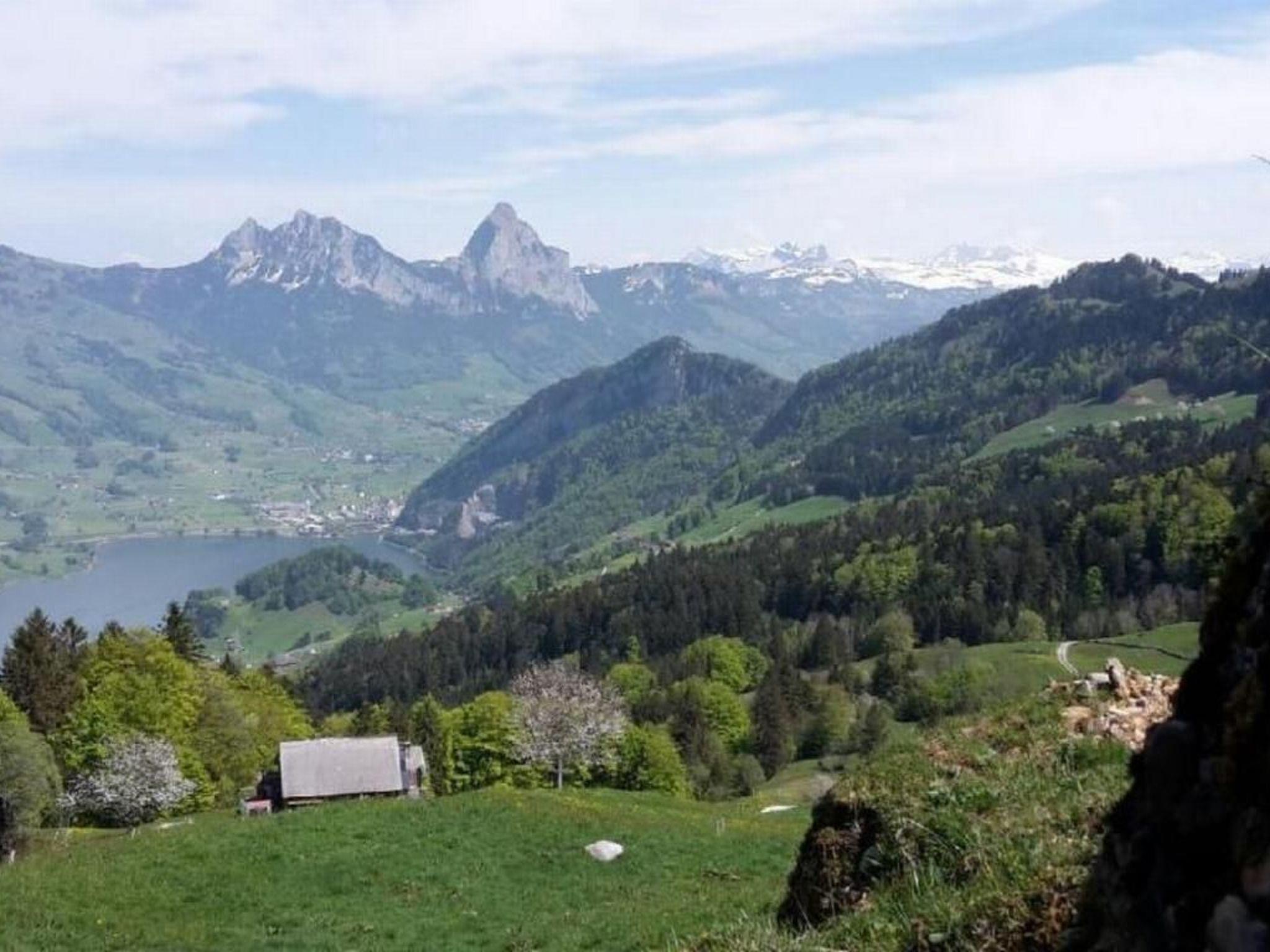 Heimelige 2 1/2 Zimmer Wohnung mit separatem Eingang, hoch über dem Lauerzersee an der Rigi-Nordlehne, auf 850 müM. Mit zwei Schlafzimmern, eins mit zwei Betten und eins mit drei Betten, Kinderbett wird auf Wunsch bereitgestellt. Wohnküche mit Sitzecke (Schlafsofa) und Fernseher. Dusche mit Lavabo und Waschmaschine. Separates WC. Gemütlicher Sitzplatz mit direktem Zugang zur Wohnung. Balkon mit herrlicher Aussicht auf die umliegenden Berge und den Lauerzersee. Haustiere nach Absprache.