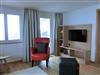Im geräumigen Wohnraum erwarten Sie ein bequemes Ledersofa und -sessel mit Hocker und ein HD-TV-Gerät mit Radioempfang. WLAN steht kostenfrei zur Verfügung. Von allen Zimmern geniessen Sie Panoramablick auf die Berge.