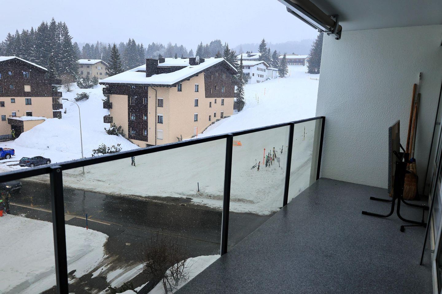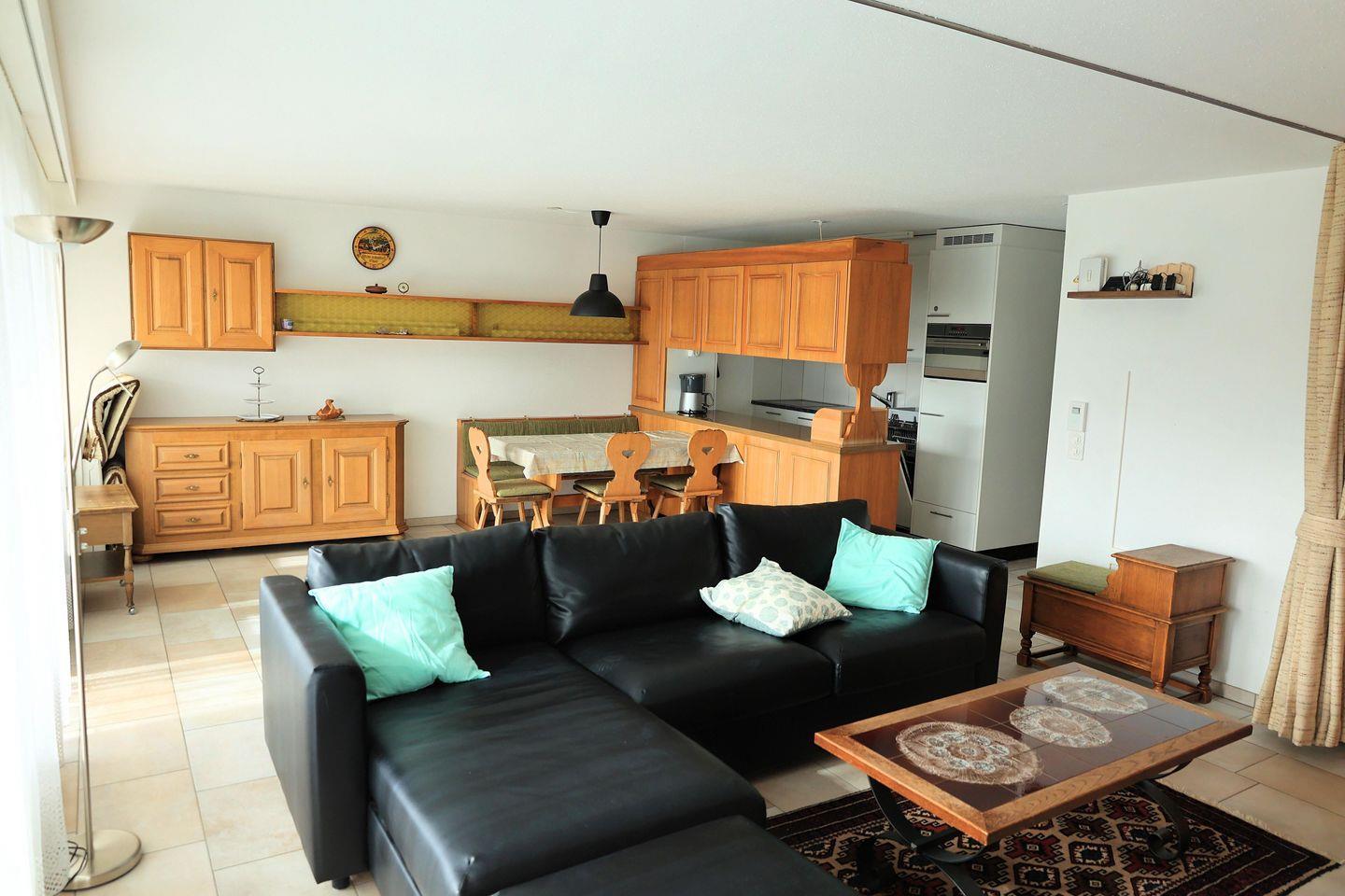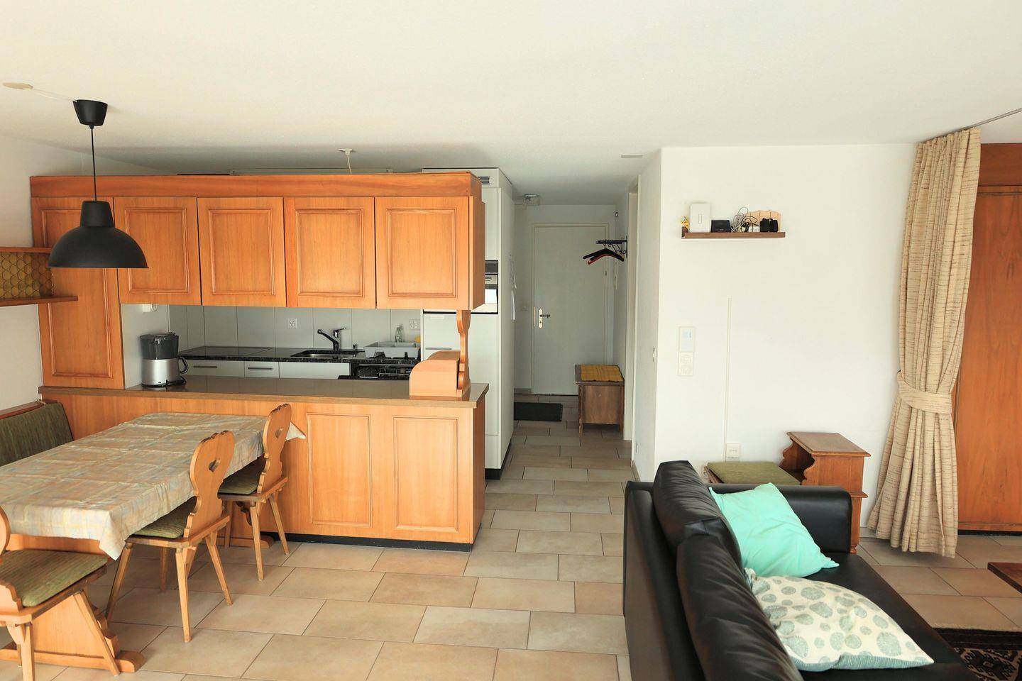 2-Zimmer-Wohnung mit Plattenboden im Wohnbereich im 5. Obergeschoss bestehend aus: Entrée mit Garderobe, Dusche / Lavabo, WC / Lavabo, im Wohnzimmer integrierte Küche mit 4-Platten-Glaskeramikherd, Geschirrspüler, Backofen, Kühlschrank und diversen Einbauschränken, Wohn- / Esszimmer mit TV/Radio, Sitzgruppe, Esstisch und 2 Wandklappbetten, Südbalkon, Doppelzimmer mit 2 Normalbetten, Gratis W-Lan, Garagenplatz Nr. 76 in der Tiefgarage, zur Mitbenützung: Personenaufzug, Skiraum sowie kostenpflichtige Waschmaschine und Tumbler, Wohnfläche ca. 68 m2, Nichtraucherwohnung / Keine Haustiere erlaubt! Garagenhöhe 1,80 m