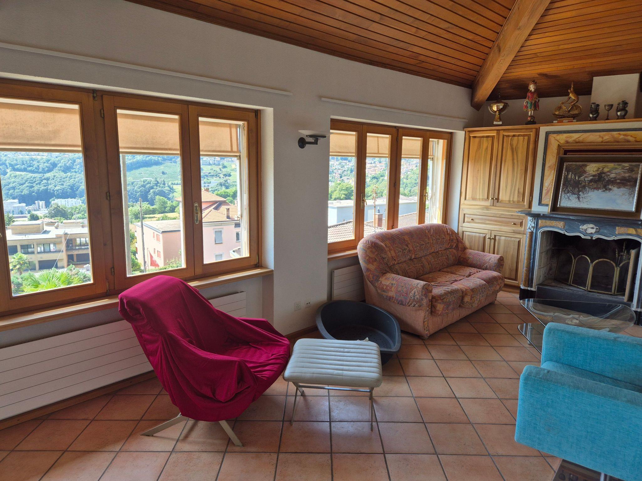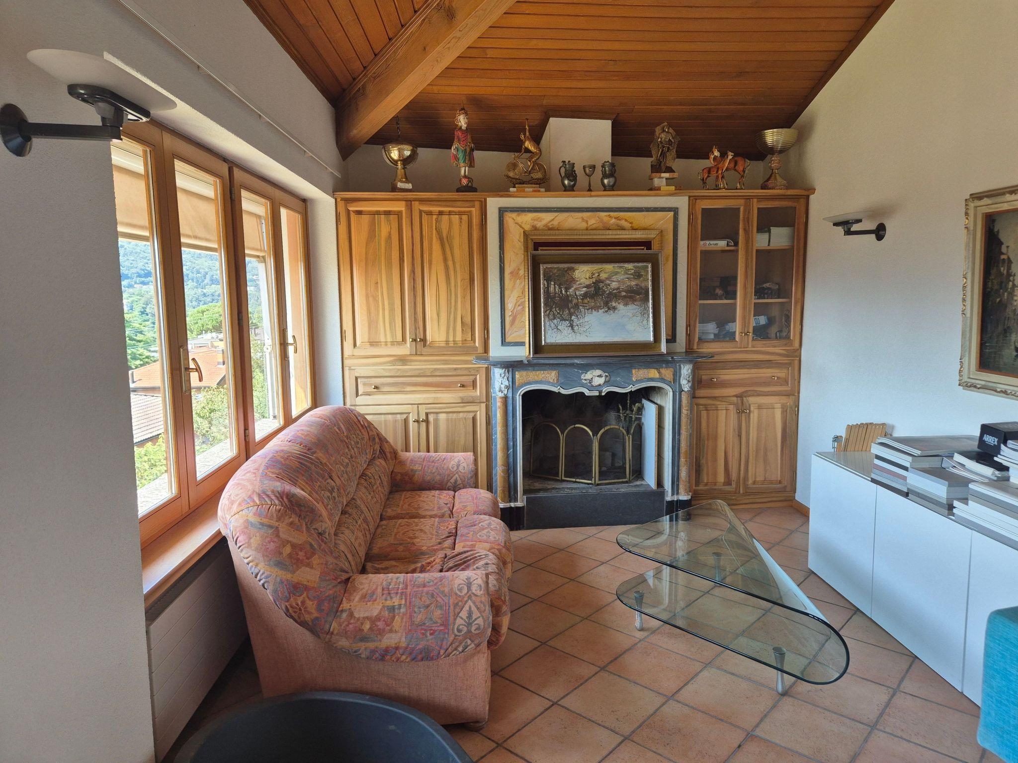 Großes Wohnzimmer mit Kamin und Schlafsofa für 2 Personen. Blick auf den See.