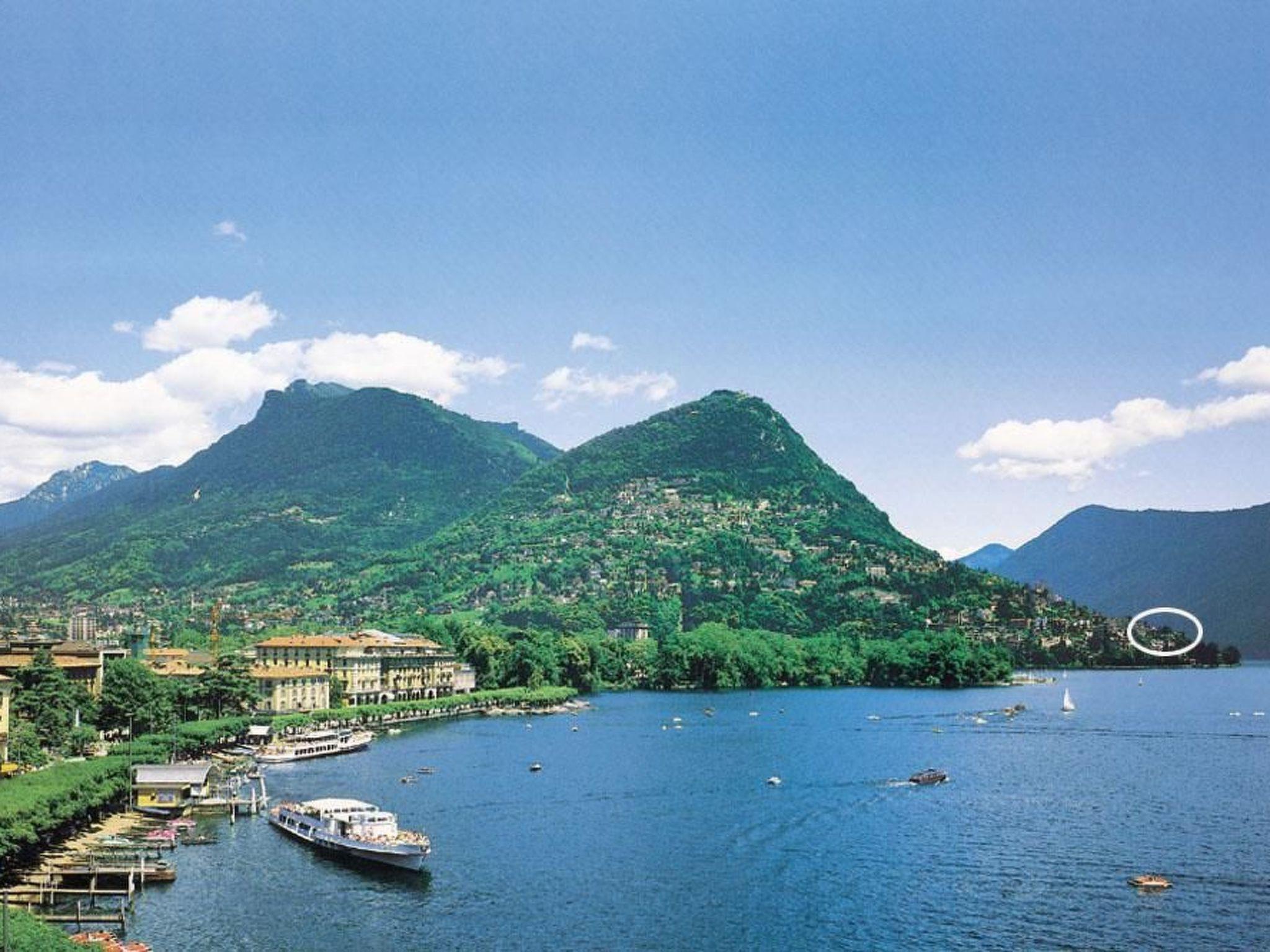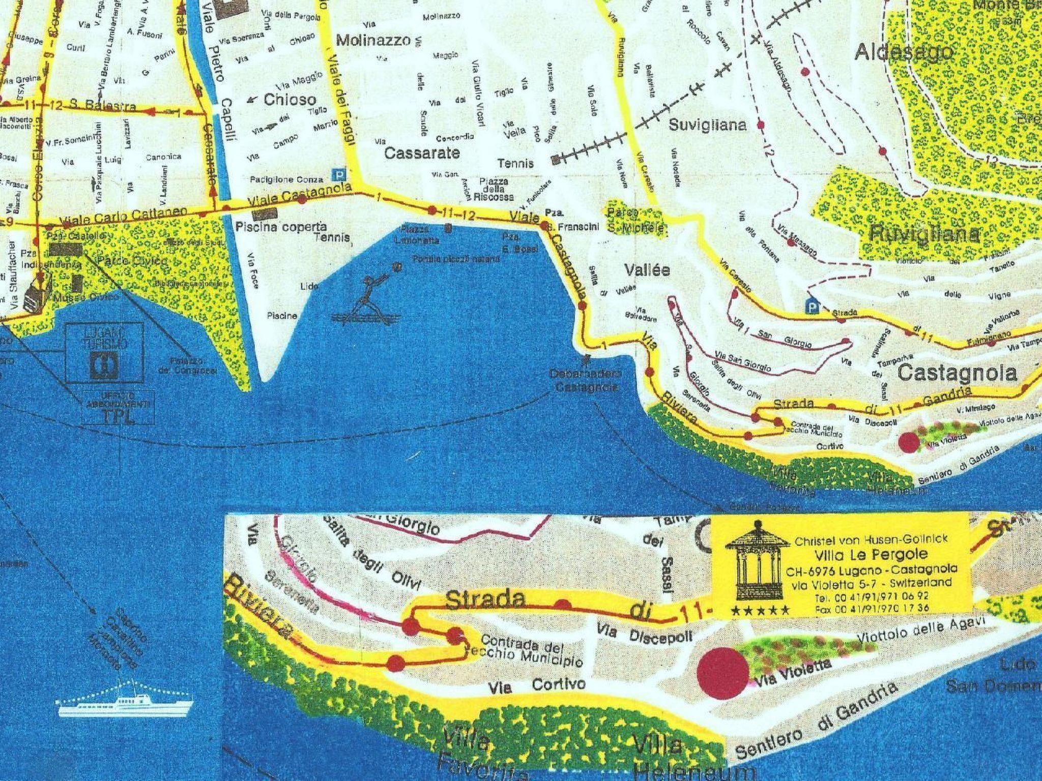 Zum: See mit Badesteg (für Erwachsene) und Bootssteg 130 m + Treppenstufen, Kursschiff beim Museum "Villa Heleneum" 250 m, Lido San Domenico 400 m, Bus 70-400 m, Restaurants 300 m, Lebensmittelgeschäfte, Lido Lugano, Tenniscourt, Fitness-Zentrum, Bergbahn zum Monte Brè 1,2 bis 1,5 km. Zentrum Lugano 2,5 km. Residenz vom Eigentümer geführt, der vor Ort wohnt.