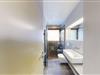 Schlafzimmer mit Doppelbett, Stauraum für Kleidung, Schreibtisch und Fenster zum Gang.