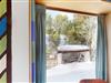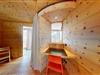 Schlafzimmer mit Etagenbett, Stauraum für Kleidung, Schreibtisch, Ausgang zum Garten und Fenster zum Gang.