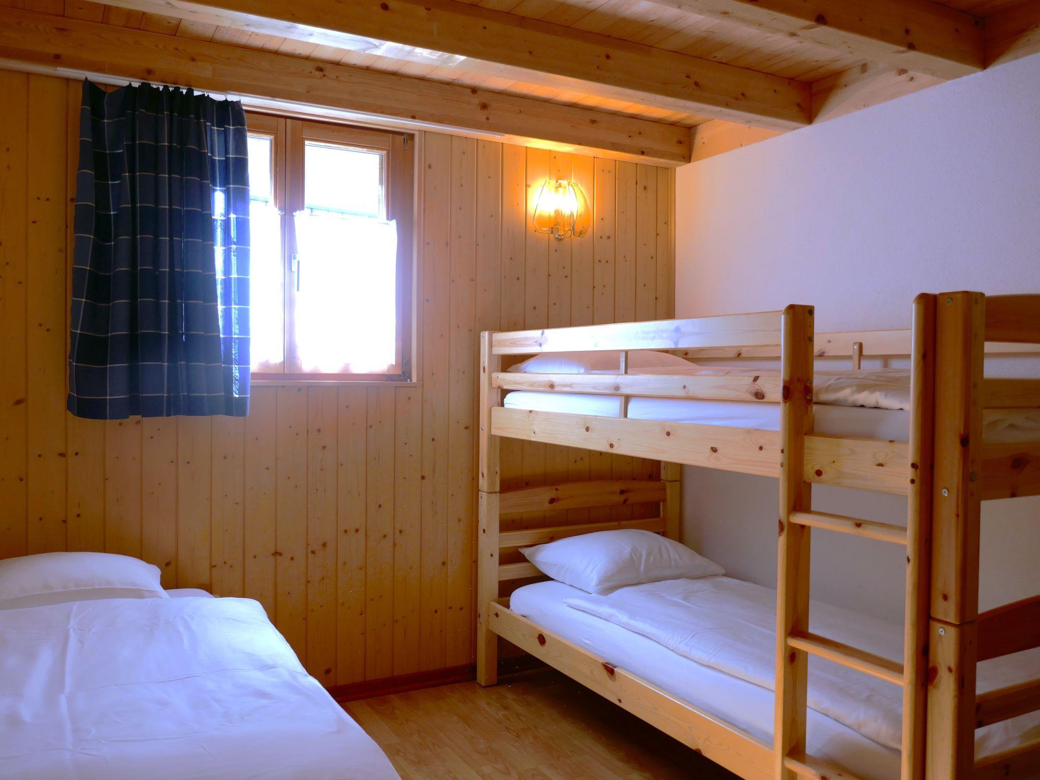 "Rustico Fortuna", 3-Zimmer-Chalet 80 m2 auf 3 Stockwerken. Teilweise abgeschrägt, einfach und rustikal eingerichtet: offenes Wohn-/Esszimmer mit offenem Kamin, Esstisch und Radio. Ausgang zum Balkon. 1 Zimmer mit 1 x 2 Etagenbetten (90 cm, Länge 200 cm). Offene Küche (Backofen, Gasherd, 4 Flammen, Fondue Set (Käse)). Ausgang zum Balkon. Dusche/WC. G-Heizung, Holzheizung. Solarstrom. Obergeschoss: abgeschrägte, offene Galerie mit 1 Doppelbett (1 x 160 cm, Länge 200 cm). Gartensitzplatz. Terrassenmöbel, Gartengrill, Liegestühle (2), Sitzplatz. Schöne Sicht auf die Berge. Zur Verfügung: Kinderhochstuhl, Babybett bis 2 Jahre (extra). Bitte beachten: geeignet für Familien. Nichtraucher-Haus. NL-00003913
