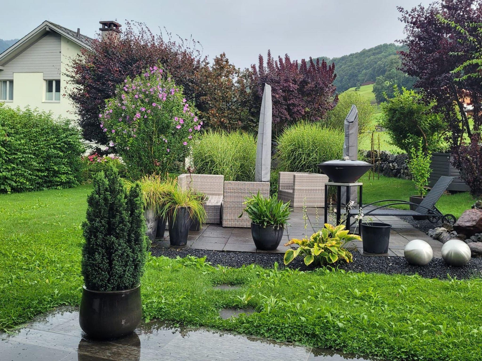 Der Außenbereich des „Vreneli“ ist eine Oase der Ruhe, die mit einem englischen Garten samt Sitzecke und einem Hauptgarten mit sonniger Terrasse zum Entspannen einlädt. Inmitten duftender Kräuter und mit Blick auf das malerische Vrenelis Gärtli finden Sie hier Ihren persönlichen Ruhepol. Ob Sie den Tag mit einem Kaffee begrüßen oder die Abendsonne genießen – unser Garten bietet Ihnen den perfekten Rahmen.