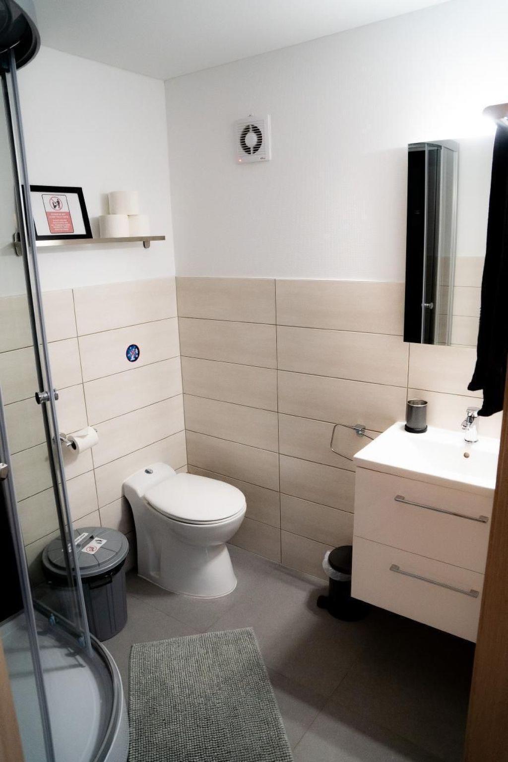 Im Inneren finden Sie zwei separate Zimmer mit bequemen Boxspringbetten, die Platz für insgesamt vier Gäste (2 Erwachsene und 2 Kinder) bieten. Das größere Zimmer ist mit einer offenen Küchenzeile und einem kompakten Badezimmer mit Dusche, Waschbecken und Toilette ausgestattet (Die Toilette ist ein sanibroyeur hier sollte kein Toilettenpapier oder Toilettenartikel weggespült werden)