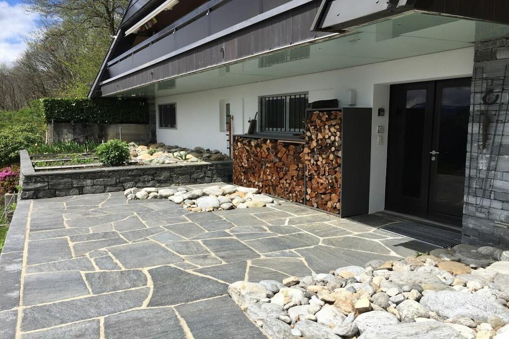 • 5.5 Zimmer Ferienhaus, alleinstehend, auf 2 Etagen • Wohnfläche ca. 190 m2, Aussenbereich ca. 530 m2 • 6 Personen • Sonnige Hanglage auf ca. 965 m Seehöhe • Panoramasicht auf den See und Tessiner Täler • moderne Innenausstattung . Erdgeschoss • Grosszügiger Eingangsbereich, Treppenhaus • 1 Doppelschlafzimmer, 2 Matratzen • 1 Schlafzimmer mit französischem Bett 120 cm • Badezimmer mit Hydromassage-Badewanne, Lavabo, WC . Oberer Wohnbereich • Komplett eingerichtete moderne Küche zum Wohnzimmer offen • Ceranfeld Kochherd, Backofen • Geschirrspüler • Kühlschrank mit Gefrierschrank • Kolben-Espressomaschine (Kaffeepulver) • Filterkaffeemaschine • Wasserkocher, Toaster • Geräumiges Wohn-, Esszimmer mit Esstisch, 6 Stühle • Wohnlandschaft mit Salontisch, offener Kamin • Ausgang zum Balkon 18 m2 mit Esstisch, 6 Stühle • Flachbildschirm TV, Wlan • 1 Doppelschlafzimmer, 2 Matratzen, Ausgang zum Balkon • 1 Schlafzimmer mit französischem Bett 120 cm, Ausgang zum Balkon • Badezimmer mit Dusche, zwei Lavabos, WC . Aussenbereich • Privater Garten mit Pergola und Esstisch, Liegestühle • Grillplatz (wegen der Waldnähe nur erlaubt, wenn im Tessin kein Verbot herrscht) . • Haustiere nicht erlaubt • 2 private Parkplätze längs der Strasse • Zugang zum Haus über eine Treppe (ca. 70 Stufen) • Waschmaschine, Tumbler • Nichtraucher, bitte nur im Aussenbereich rauchen • Kaution: CHF 800.-- über Angabe der Kreditkarten Nummer