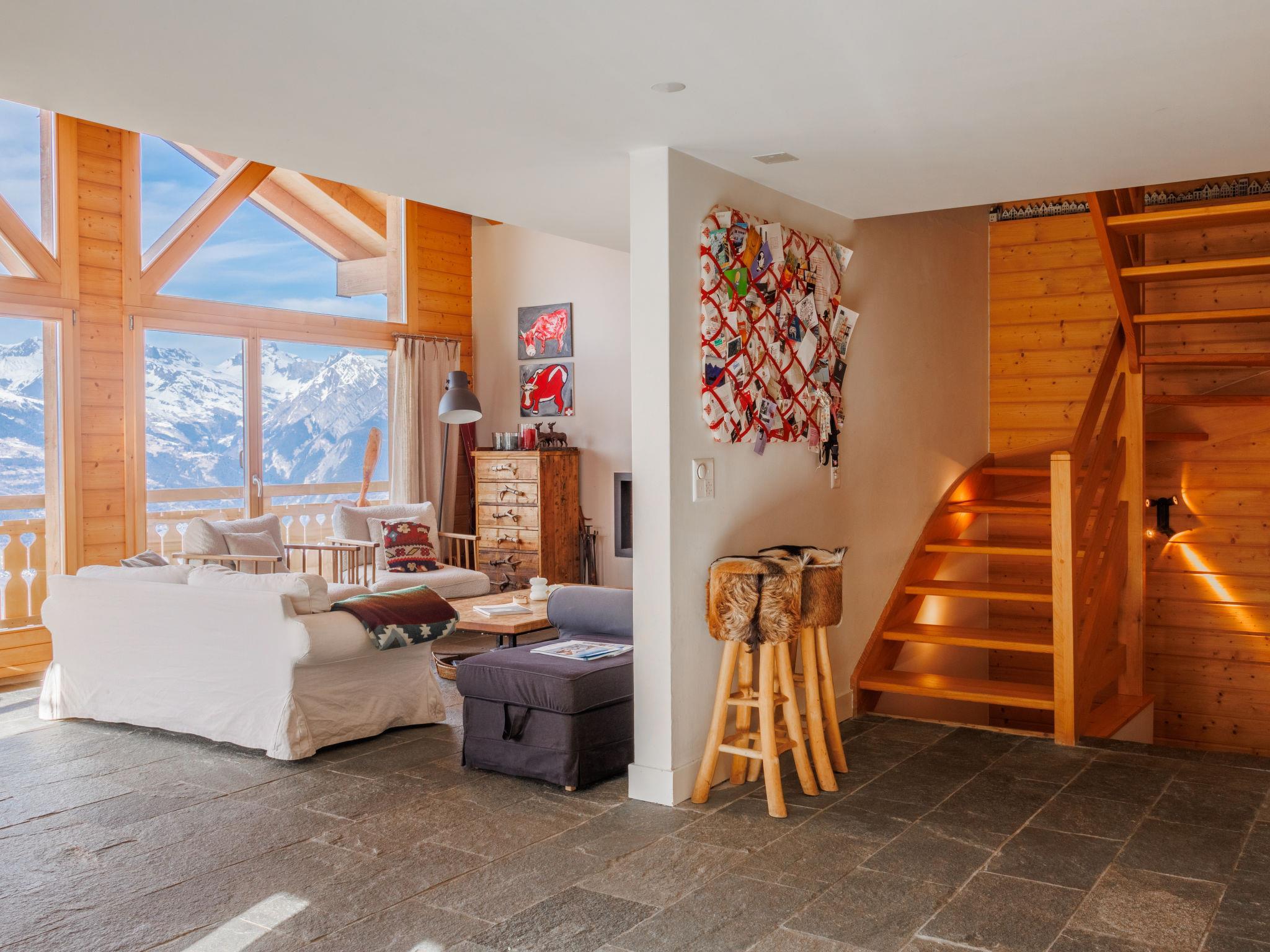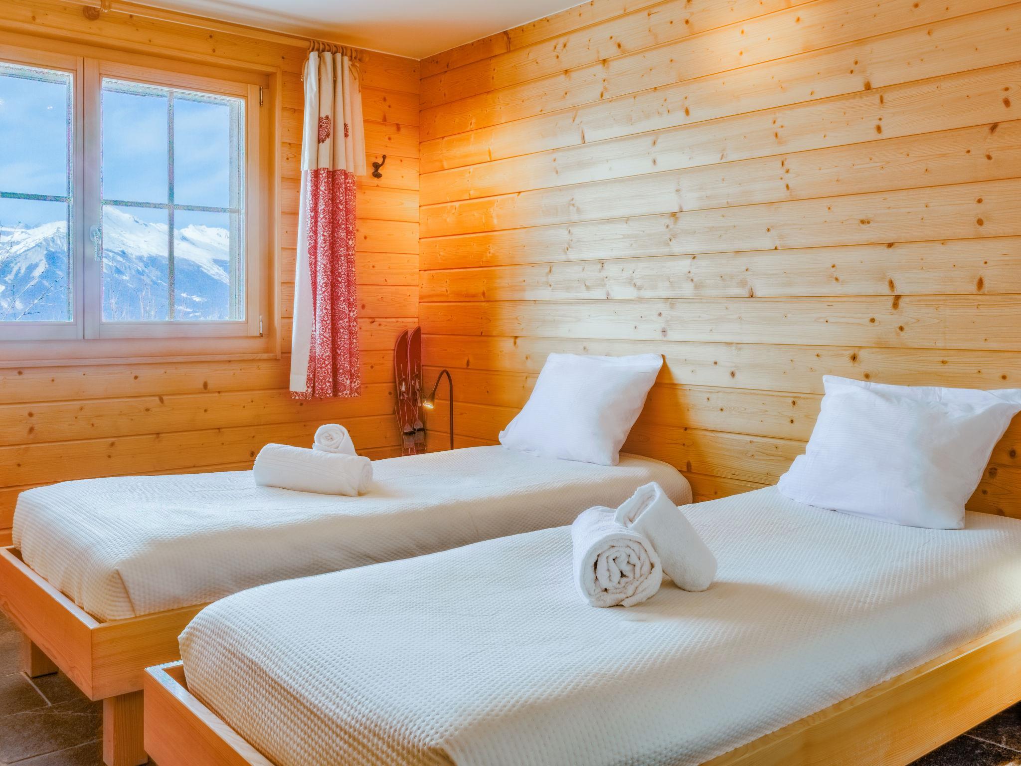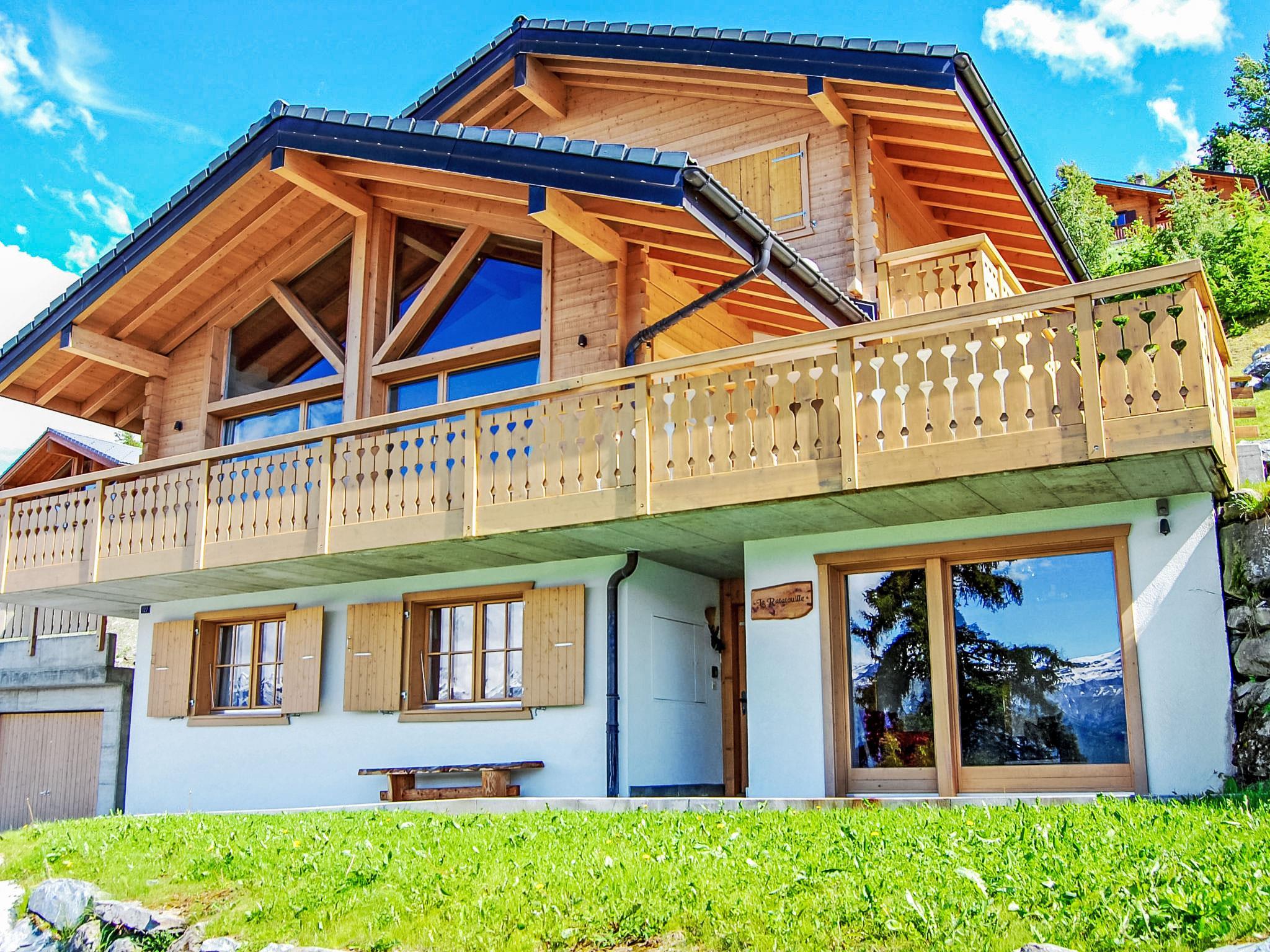 "Ratatouille", 5-Zimmer-Chalet 210 m2 auf 3 Stockwerken. Schön und geschmackvoll eingerichtet: Wohn-/Esszimmer mit offenem Kamin und Sat-TV. Offene Küche (Backofen, Geschirrspüler, 5 Glaskeramikplatten, Toaster, Wasserkocher, Mikrowelle, elektrische Kaffeemaschine, Kapseln für die Kaffeemaschine (Nespresso) extra, Racletteofen, Fondue Set (Käse)) mit Bar. E-Heizung. Unteres Geschoss: 1 Zimmer mit 1 franz. Bett. 2 Zimmer, jedes Zimmer mit 2 Betten (90 cm, Länge 200 cm). Bad/WC, Dusche, sep. WC. Obergeschoss: 1 Zimmer mit 2 Betten (90 cm, Länge 200 cm). Dusche/WC. Natursteinboden. Grosser Balkon, Nordlage und Westlage, kleiner Balkon, Ostlage Terrasse, Westlage. Terrassenmöbel, Gartengrill, Liegestühle. Sehr schöne Sicht auf die Berge und das Tal. Zur Verfügung: Waschmaschine, Wäschetrockner, Kinderhochstuhl, Babybett, Haartrockner. Internet (WLAN, gratis). Garage (2 Autos), Höhe 195 cm, Breite 275 cm. Bitte beachten: Nichtraucher-Haus. Maximal 1 Haustier/Hund erlaubt.