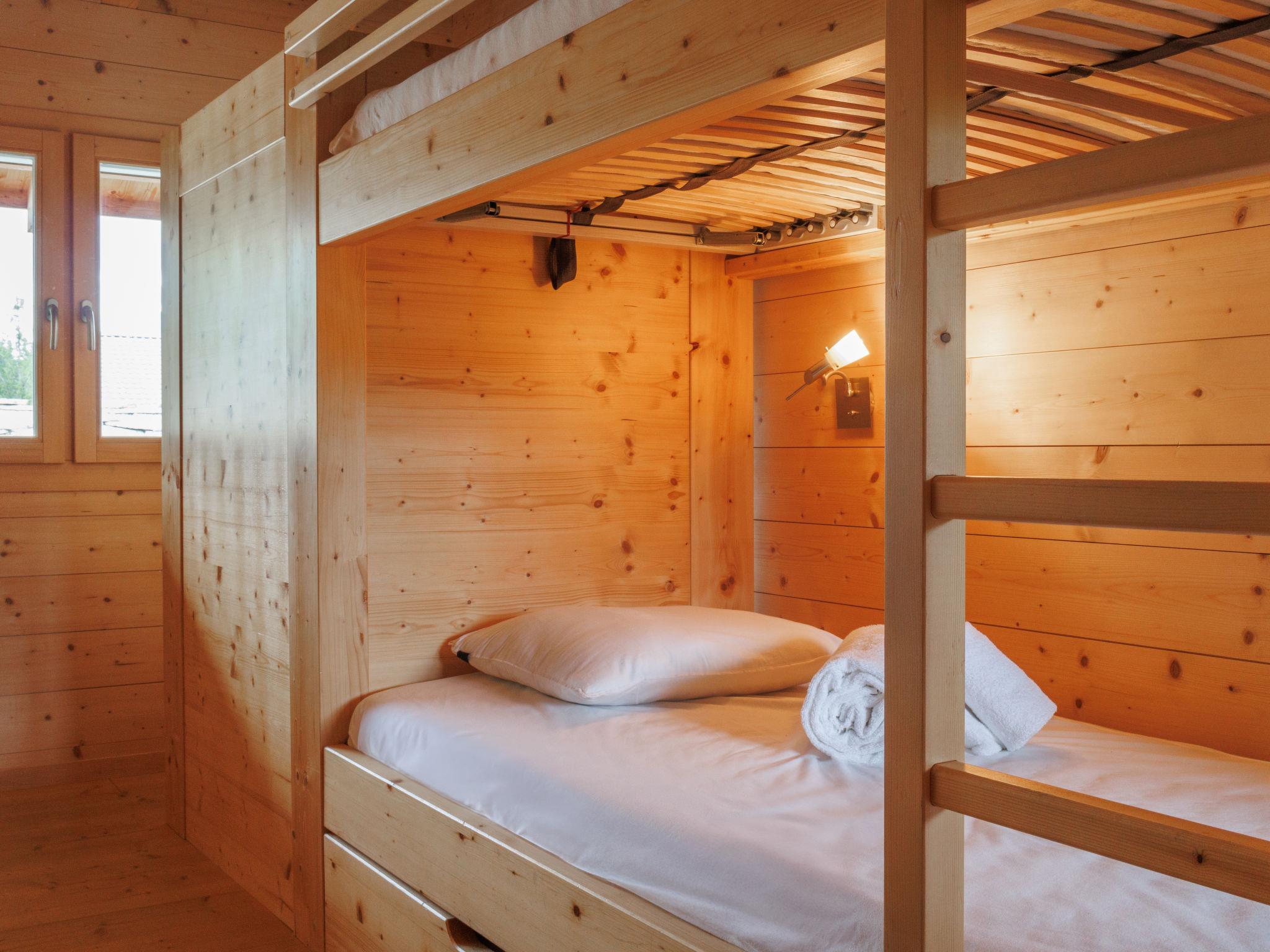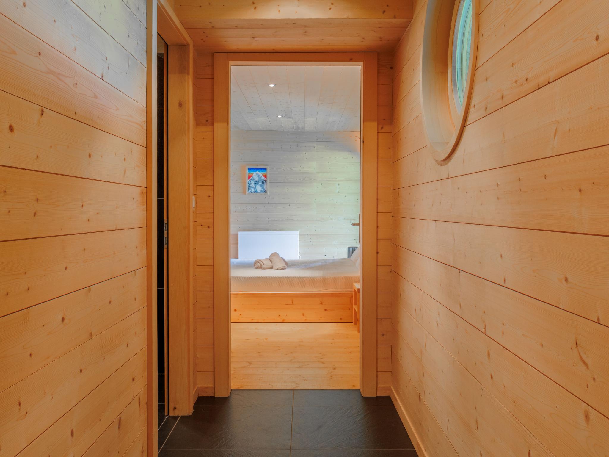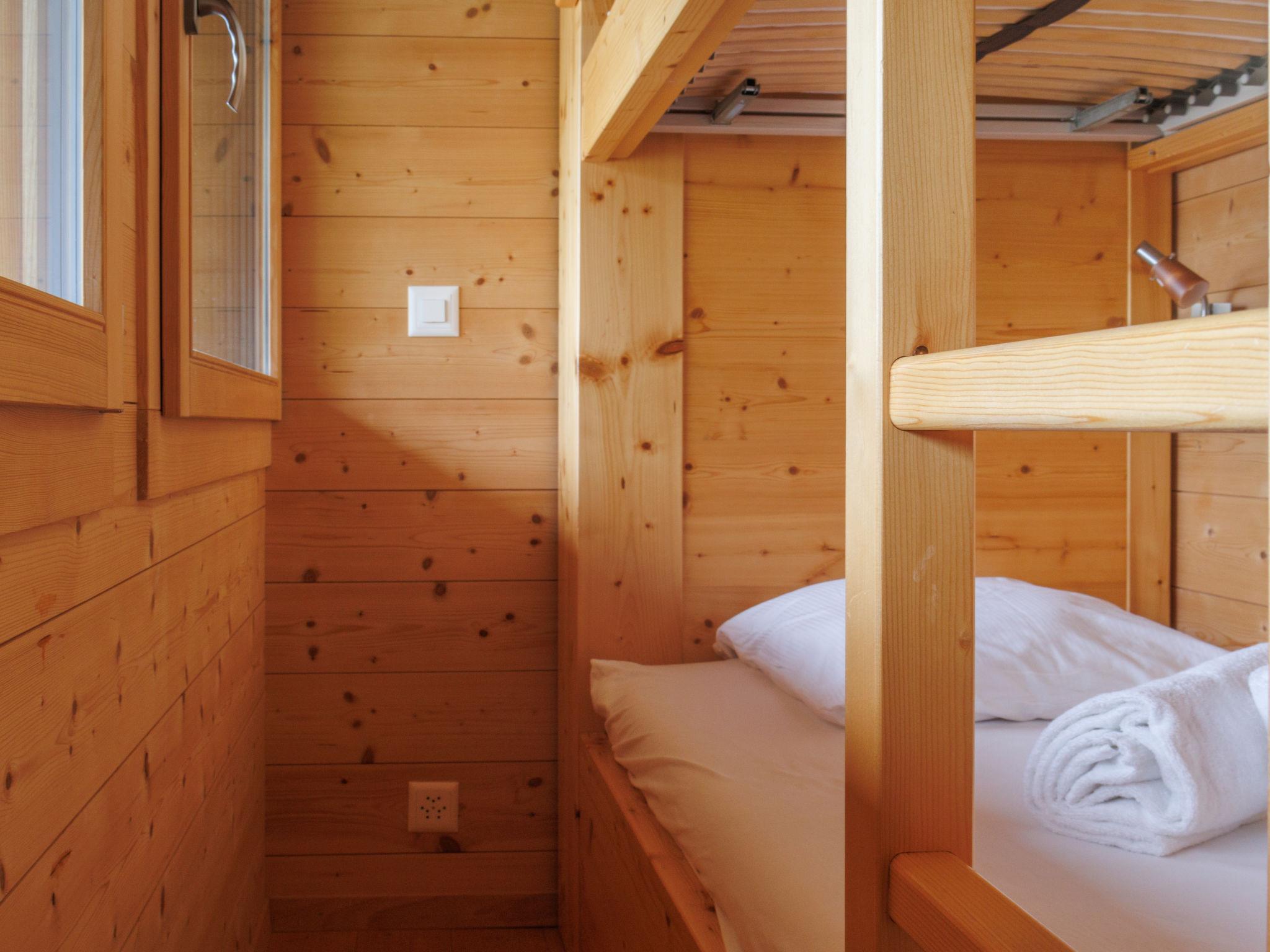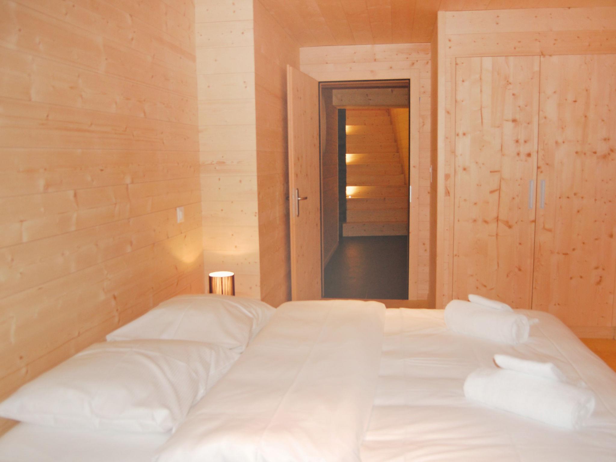 "Woovim 14", 6-Zimmer-Chalet 250 m2. Luxuriös und mit viel Holz eingerichtet: grosses Wohn-/Esszimmer mit Panoramafenster Richtung Norden mit Schwedenofen, Kabel-TV und DVD. Ausgang zur Terrasse. 1 grosses Zimmer mit 1 franz. Bett (180 cm, Länge 200 cm). Offene Küche (Backofen, Geschirrspüler, 4 Induktionskochplatten, Toaster, Wasserkocher, Mikrowelle, elektrische Kaffeemaschine, Kapseln für die Kaffeemaschine (nespresso) extra, Racletteofen, Fondue Set (Käse)) mit Bar. Dusche/WC. Heizung. Unteres Geschoss: 1 grosses Zimmer mit 1 franz. Bett (160 cm, Länge 200 cm), Kabel-TV. 1 grosses Zimmer 28 m2 mit 3 Betten (80 cm, Länge 190 cm), 1 franz. Bett (160 cm, Länge 200 cm), Kabel-TV. Dusche, sep. WC, Bad/Dusche/WC, Doppelwaschbecken, Sauna. Obergeschoss: 1 Zimmer mit 2 x 2 Etagenbetten (90 cm, Länge 190 cm), Dusche, Doppelwaschbecken und Kabel-TV. 1 Zimmer mit 1 franz. Bett (160 cm, Länge 200 cm), Dusche und Doppelwaschbecken. Sep. WC. Terrasse 80 m2, Nordlage und Westlage. Terrassenmöbel. Sehr schöne Panoramasicht auf die Berge und das Tal. Zur Verfügung: Sauna, Kinderhochstuhl, Babybett bis 2 Jahre, Haartrockner. Internet (WLAN, gratis). Parkplatz (3 Autos), Garage, Höhe 200 cm, Breite 220 cm. Bitte beachten: Nichtraucher-Unterkunft.
