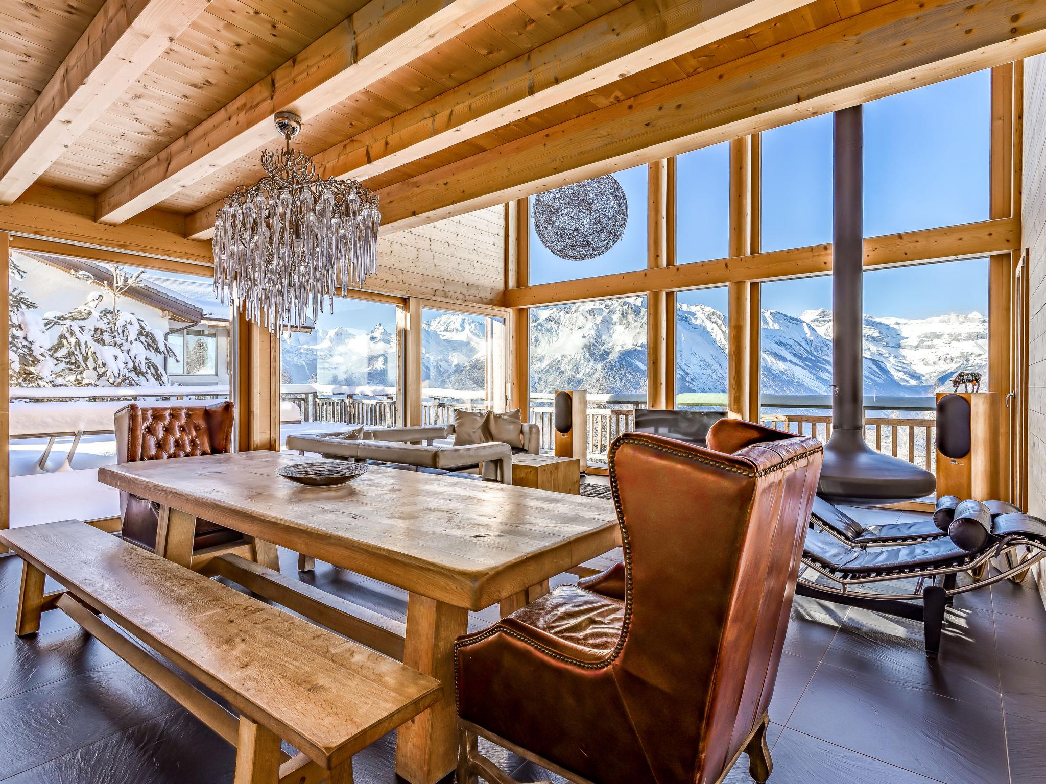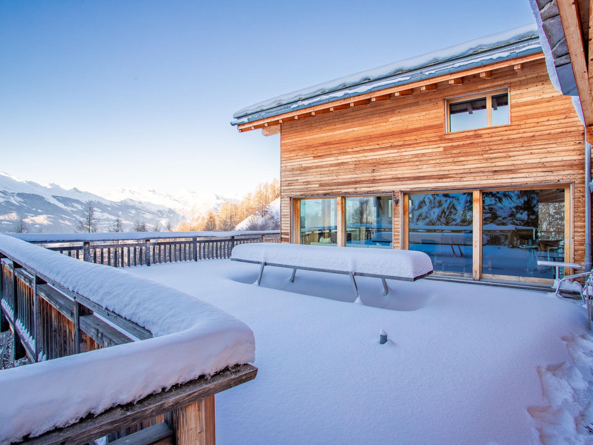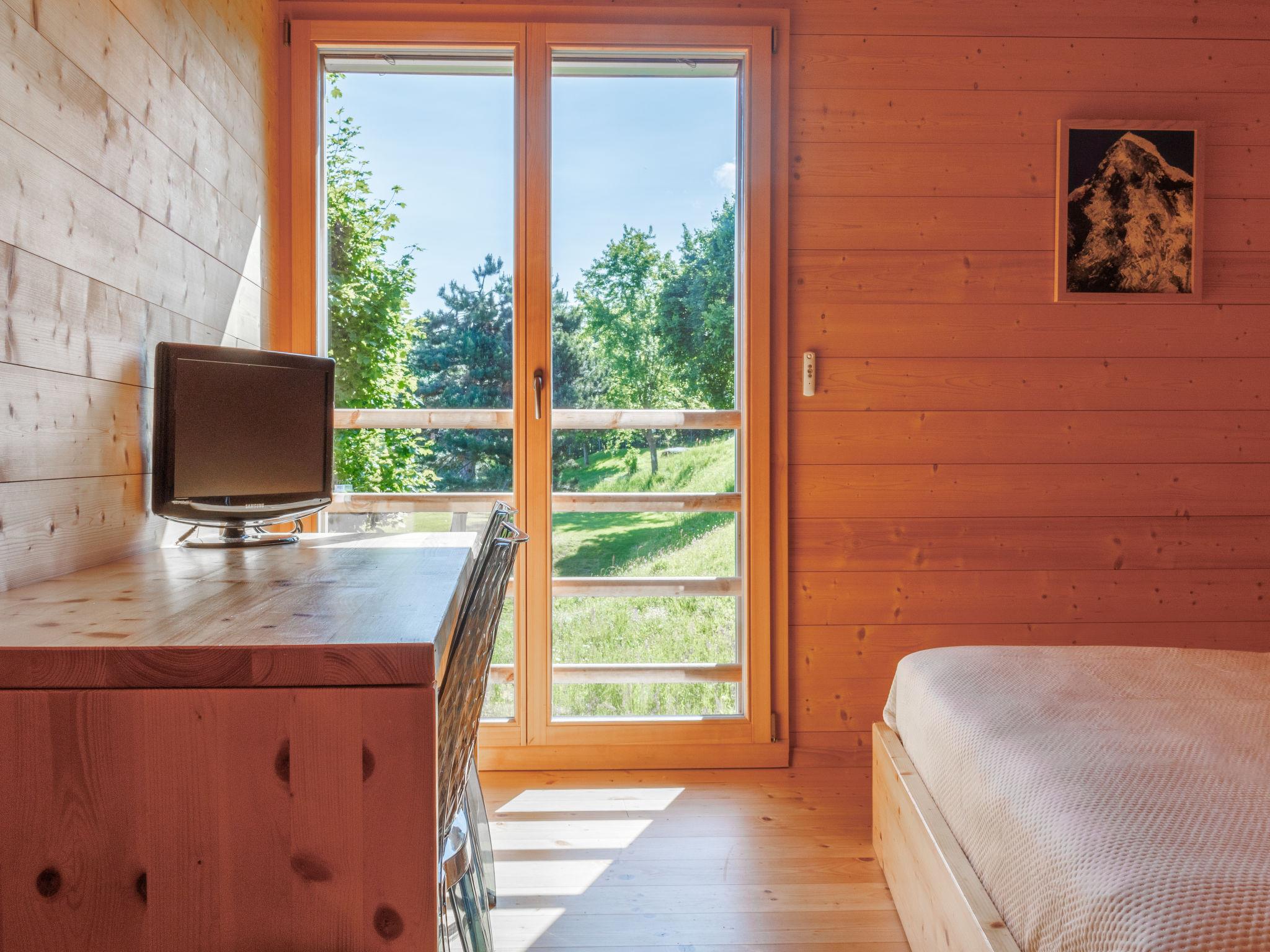 "Woovim 14", 6-Zimmer-Chalet 250 m2. Luxuriös und mit viel Holz eingerichtet: grosses Wohn-/Esszimmer mit Panoramafenster Richtung Norden mit Schwedenofen, Kabel-TV und DVD. Ausgang zur Terrasse. 1 grosses Zimmer mit 1 franz. Bett (180 cm, Länge 200 cm). Offene Küche (Backofen, Geschirrspüler, 4 Induktionskochplatten, Toaster, Wasserkocher, Mikrowelle, elektrische Kaffeemaschine, Kapseln für die Kaffeemaschine (nespresso) extra, Racletteofen, Fondue Set (Käse)) mit Bar. Dusche/WC. Heizung. Unteres Geschoss: 1 grosses Zimmer mit 1 franz. Bett (160 cm, Länge 200 cm), Kabel-TV. 1 grosses Zimmer 28 m2 mit 3 Betten (80 cm, Länge 190 cm), 1 franz. Bett (160 cm, Länge 200 cm), Kabel-TV. Dusche, sep. WC, Bad/Dusche/WC, Doppelwaschbecken, Sauna. Obergeschoss: 1 Zimmer mit 2 x 2 Etagenbetten (90 cm, Länge 190 cm), Dusche, Doppelwaschbecken und Kabel-TV. 1 Zimmer mit 1 franz. Bett (160 cm, Länge 200 cm), Dusche und Doppelwaschbecken. Sep. WC. Terrasse 80 m2, Nordlage und Westlage. Terrassenmöbel. Sehr schöne Panoramasicht auf die Berge und das Tal. Zur Verfügung: Sauna, Kinderhochstuhl, Babybett bis 2 Jahre, Haartrockner. Internet (WLAN, gratis). Parkplatz (3 Autos), Garage, Höhe 200 cm, Breite 220 cm. Bitte beachten: Nichtraucher-Unterkunft.
