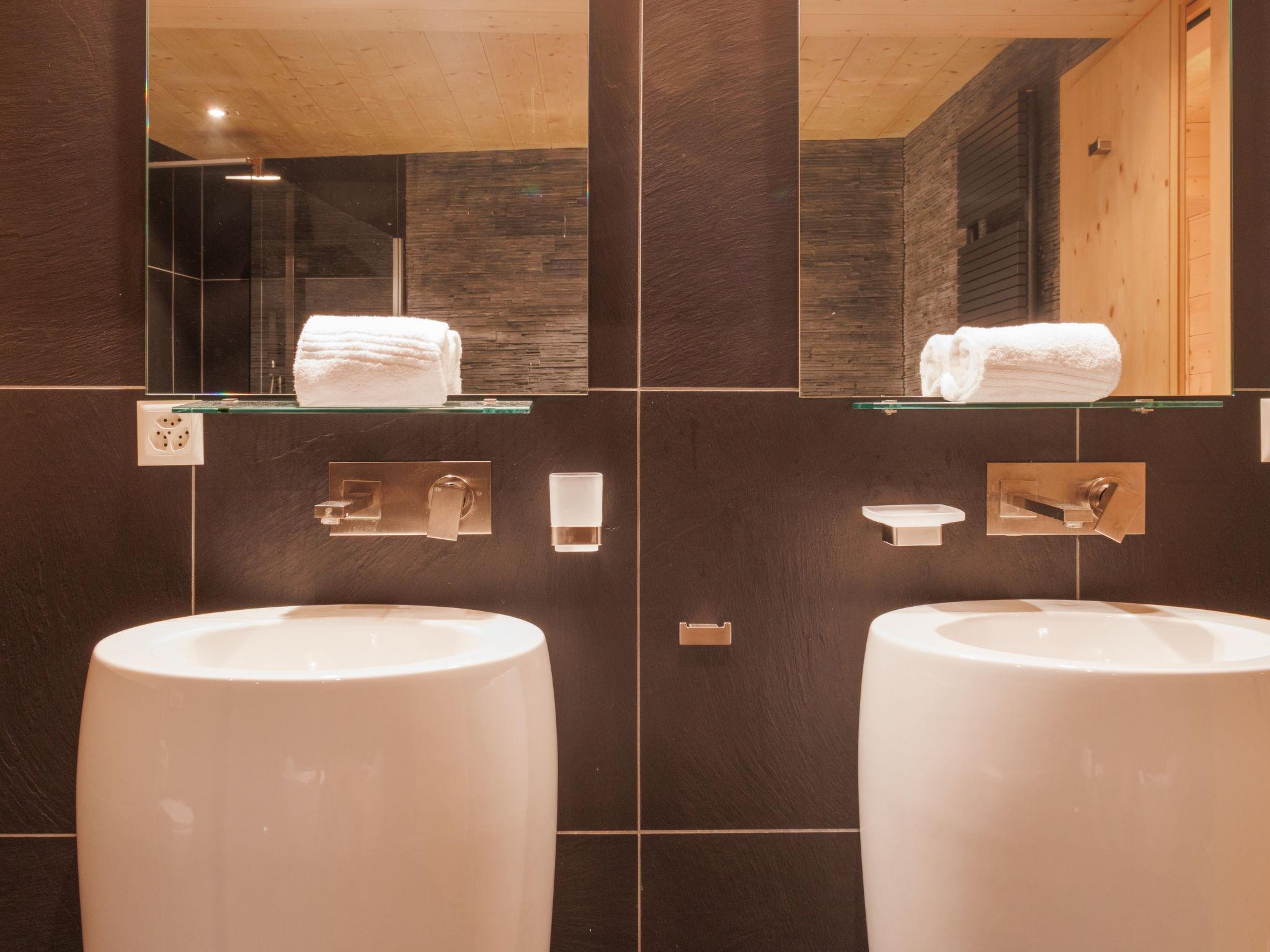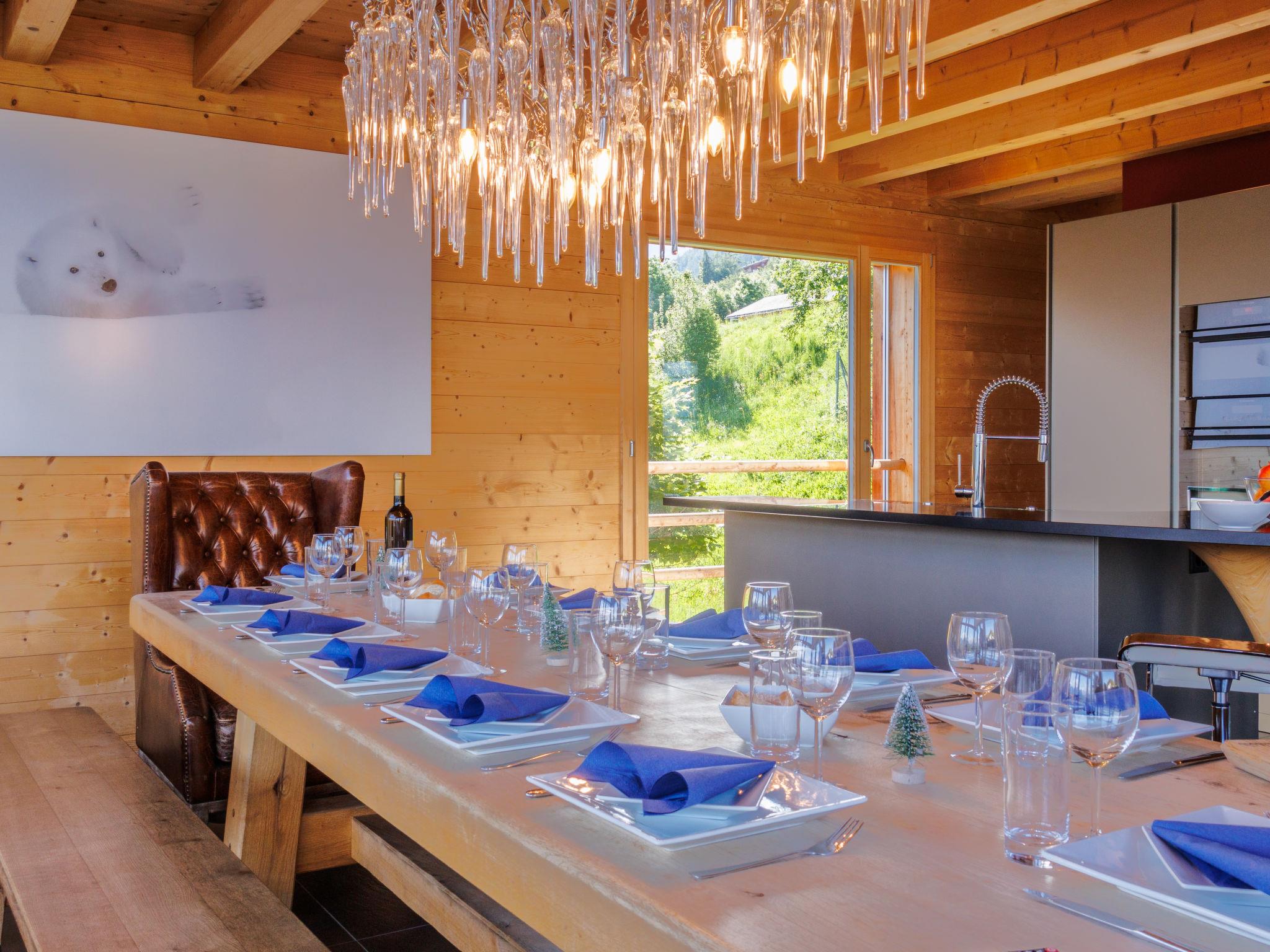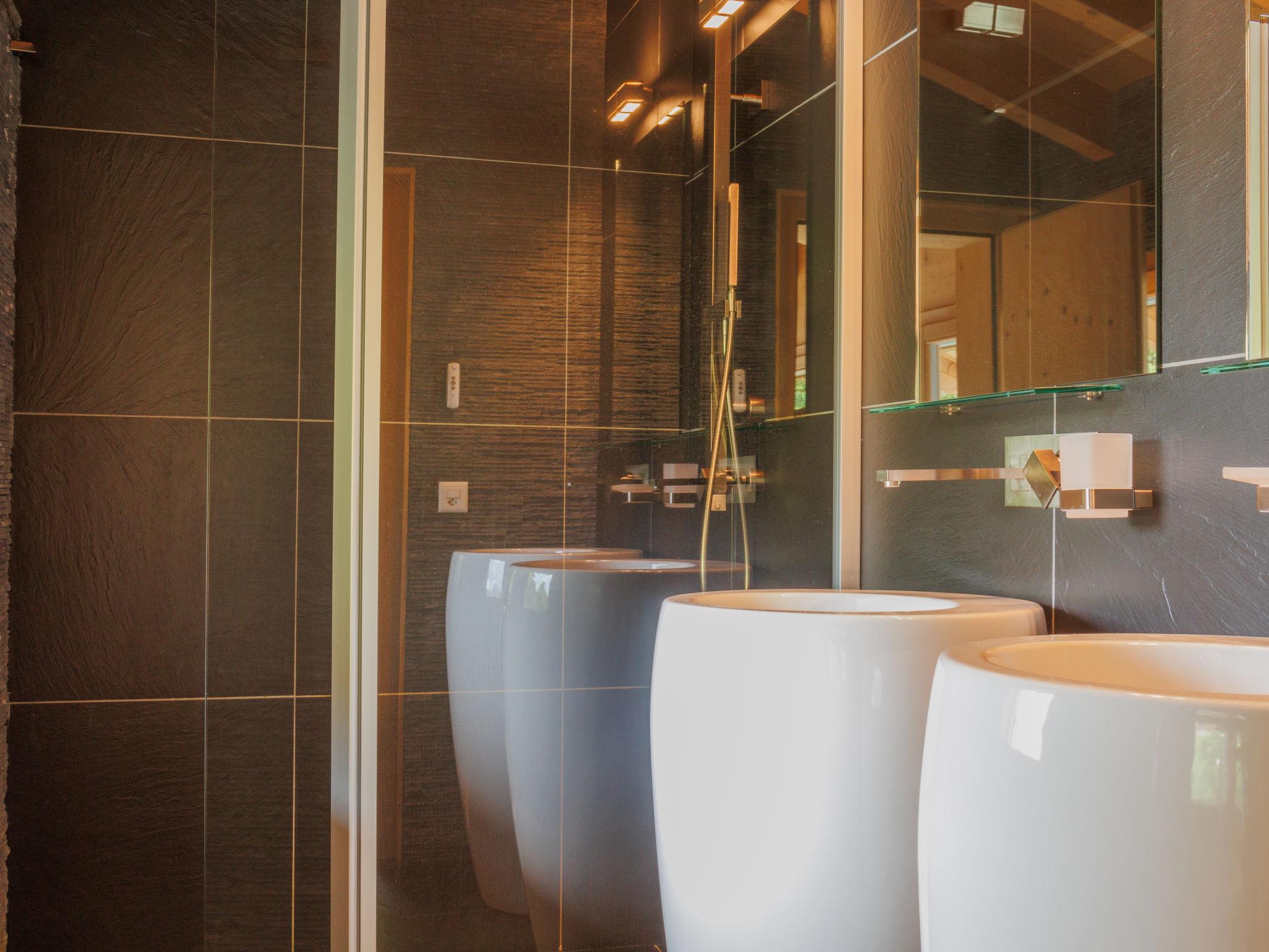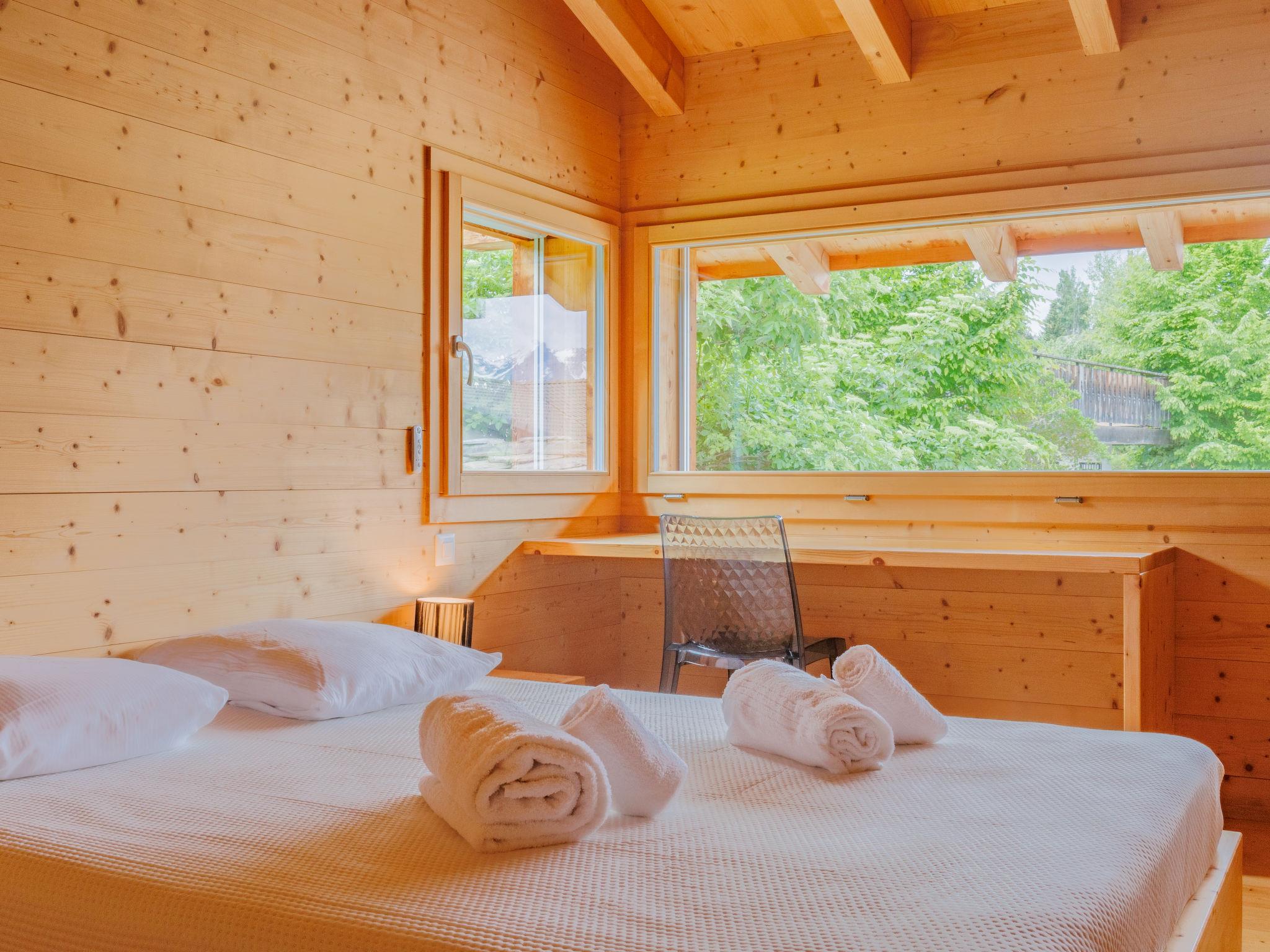 "Woovim 14", 6-Zimmer-Chalet 250 m2. Luxuriös und mit viel Holz eingerichtet: grosses Wohn-/Esszimmer mit Panoramafenster Richtung Norden mit Schwedenofen, Kabel-TV und DVD. Ausgang zur Terrasse. 1 grosses Zimmer mit 1 franz. Bett (180 cm, Länge 200 cm). Offene Küche (Backofen, Geschirrspüler, 4 Induktionskochplatten, Toaster, Wasserkocher, Mikrowelle, elektrische Kaffeemaschine, Kapseln für die Kaffeemaschine (nespresso) extra, Racletteofen, Fondue Set (Käse)) mit Bar. Dusche/WC. Heizung. Unteres Geschoss: 1 grosses Zimmer mit 1 franz. Bett (160 cm, Länge 200 cm), Kabel-TV. 1 grosses Zimmer 28 m2 mit 3 Betten (80 cm, Länge 190 cm), 1 franz. Bett (160 cm, Länge 200 cm), Kabel-TV. Dusche, sep. WC, Bad/Dusche/WC, Doppelwaschbecken, Sauna. Obergeschoss: 1 Zimmer mit 2 x 2 Etagenbetten (90 cm, Länge 190 cm), Dusche, Doppelwaschbecken und Kabel-TV. 1 Zimmer mit 1 franz. Bett (160 cm, Länge 200 cm), Dusche und Doppelwaschbecken. Sep. WC. Terrasse 80 m2, Nordlage und Westlage. Terrassenmöbel. Sehr schöne Panoramasicht auf die Berge und das Tal. Zur Verfügung: Sauna, Kinderhochstuhl, Babybett bis 2 Jahre, Haartrockner. Internet (WLAN, gratis). Parkplatz (3 Autos), Garage, Höhe 200 cm, Breite 220 cm. Bitte beachten: Nichtraucher-Unterkunft.