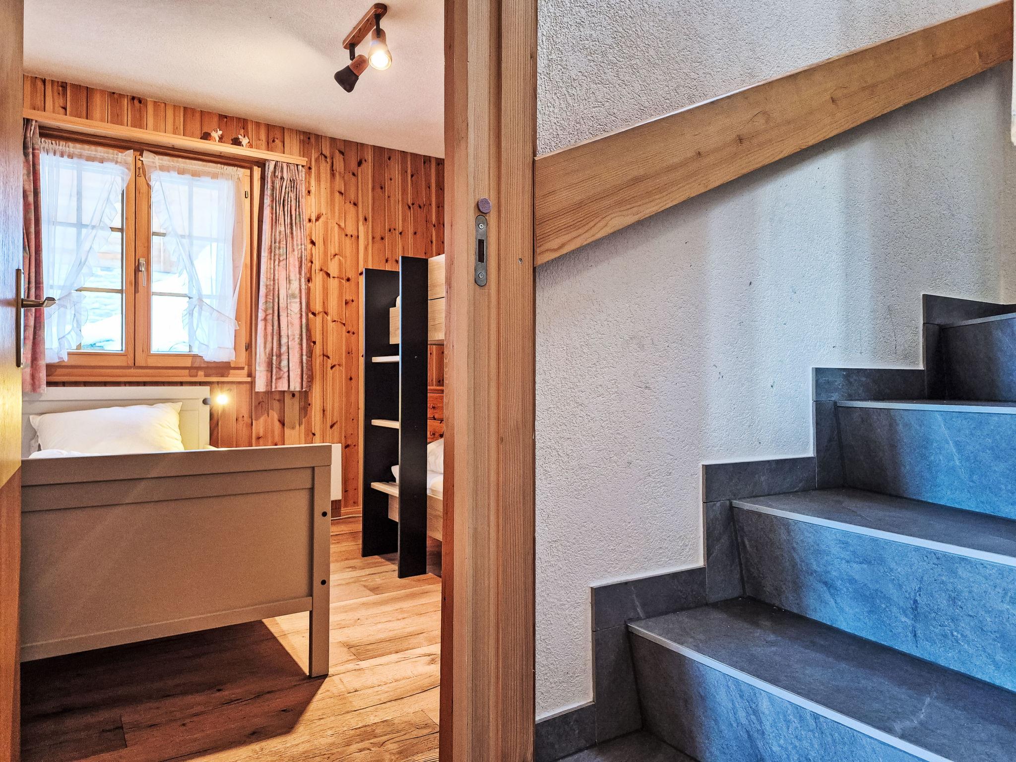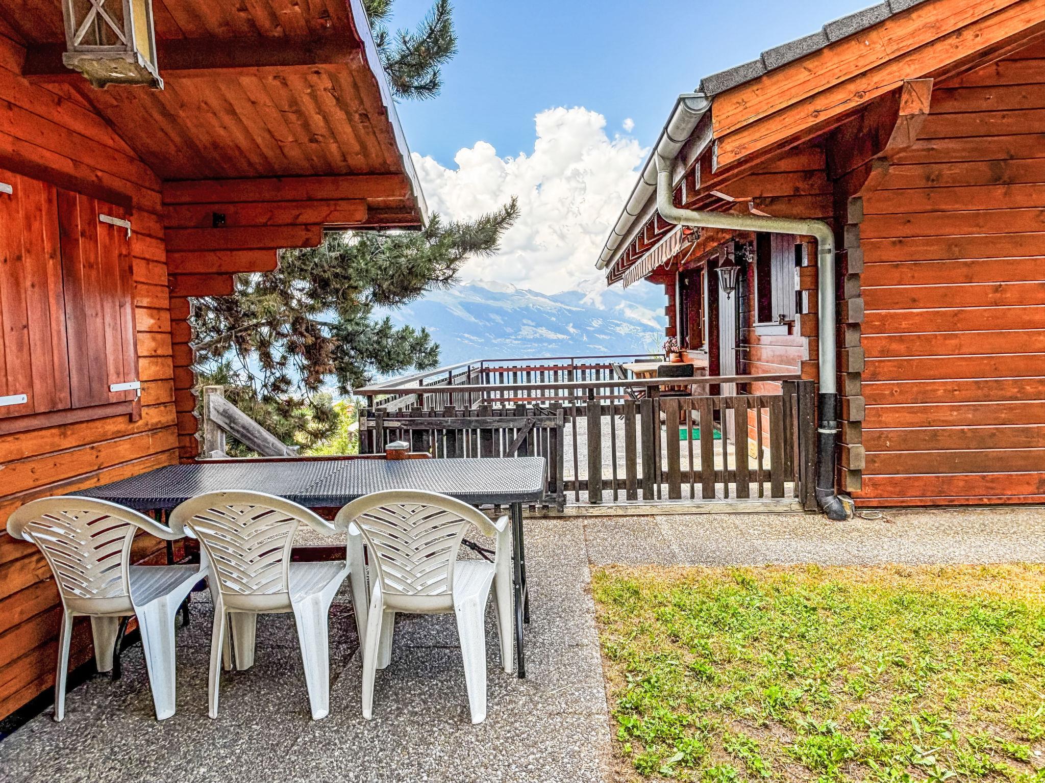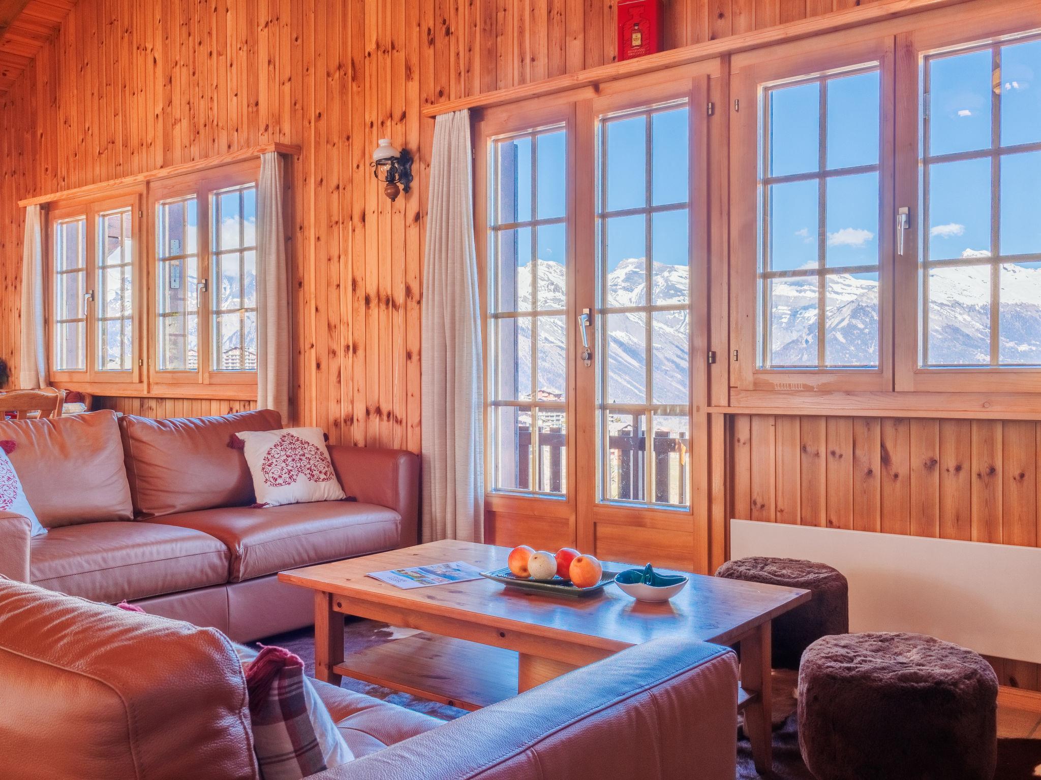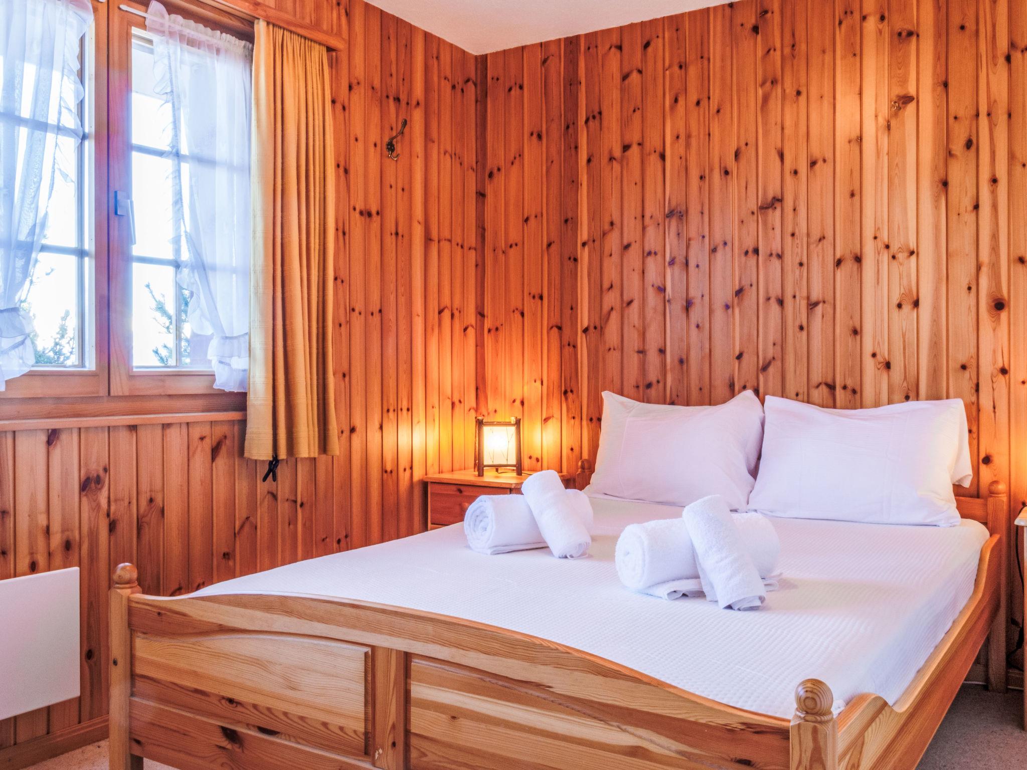 "Panorama des Cimes", 5-Zimmer-Chalet 139 m2 auf 2 Stockwerken. Sehr komfortabel und schön eingerichtet: Eingang. Wohn-/Esszimmer mit offenem Kamin und Kabel-TV. Ausgang zum Balkon, zur Terrasse, Richtung Norden und Richtung Westen. Offene Küche (4 Kochplatten, Backofen, Geschirrspüler, Toaster, Wasserkocher, Mikrowelle, elektrische Kaffeemaschine, Kapseln für die Kaffeemaschine (nespresso) extra, Racletteofen, Fondue Set (Käse)). Sep. WC. Unteres Geschoss: 1 Kinderzimmer mit 1 x 2 Etagenbetten (90 cm, Länge 200 cm). 1 Zimmer mit 1 franz. Bett (160 cm, Länge 200 cm). 1 Zimmer mit 1 franz. Bett (160 cm, Länge 200 cm). Bad/WC, Dusche/WC. E-Heizung. Dachgeschoss: (Leiter) abgeschrägte kleine Galerie, Deckenhöhe 140 - 170 cm mit 2 Betten (90 cm, Länge 190 cm). Terrassenmöbel, Gartengrill, Liegestühle (4). Sehr schöne Panoramasicht auf die Berge, das Tal und die Ortschaft. Zur Verfügung: Waschmaschine, Wäschetrockner, Haartrockner. Internet (WLAN, gratis). Parkplatz (2 Autos). Bitte beachten: Nichtraucher-Unterkunft.