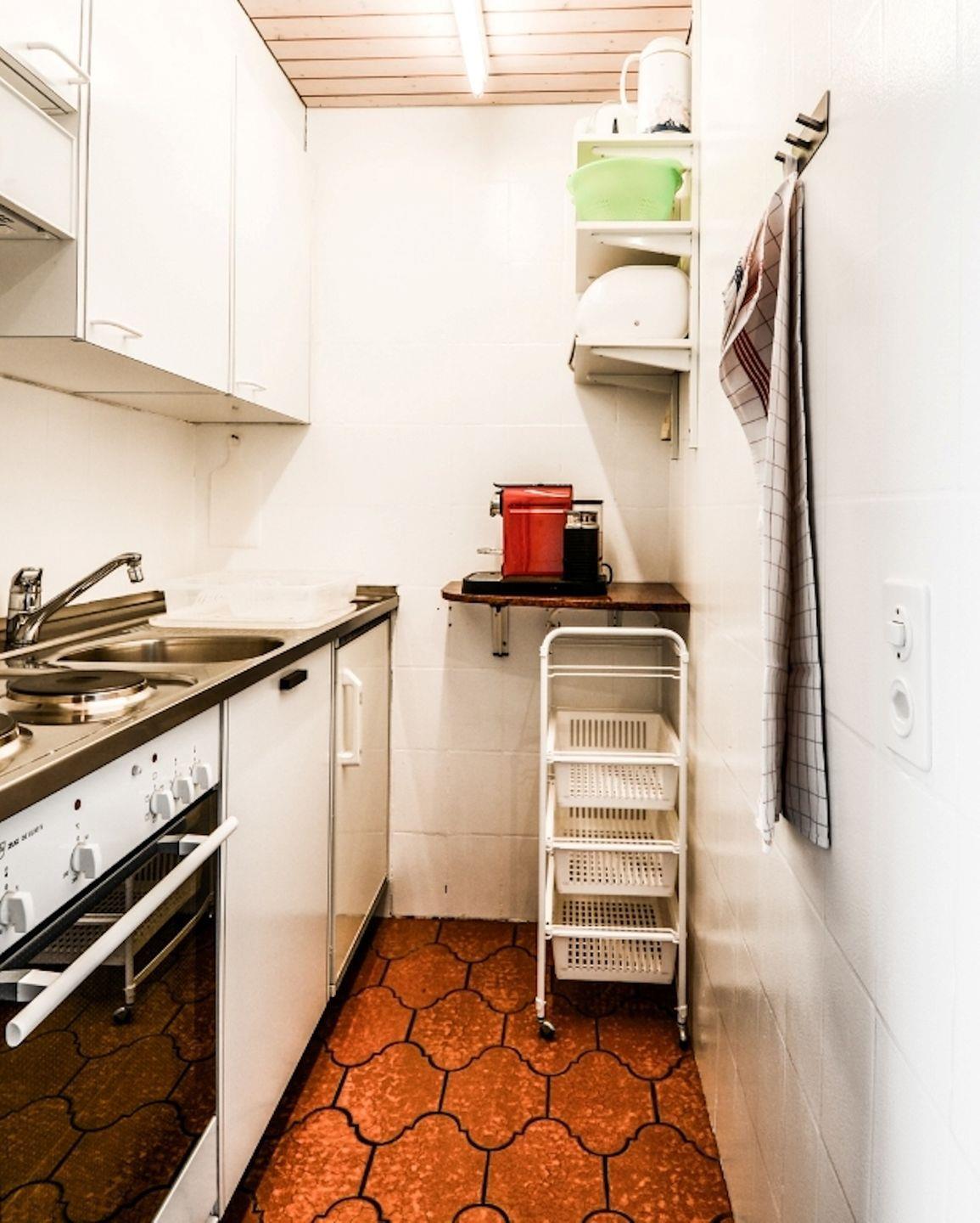 Küche mit Elektroherd, Backofen, Kühlschrank, Nespressomaschine.