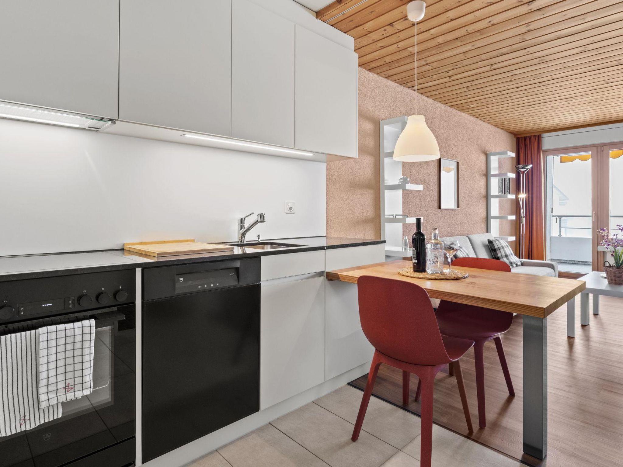 1,5 Zimmer-Ferienwohnung in einem Mehrfamilienhaus, offene Küche, Wohnzimmer mit 2 Schlafgelegenheiten, Bad mit Badewanne, gedeckter Balkon, Aussicht nach Westen.