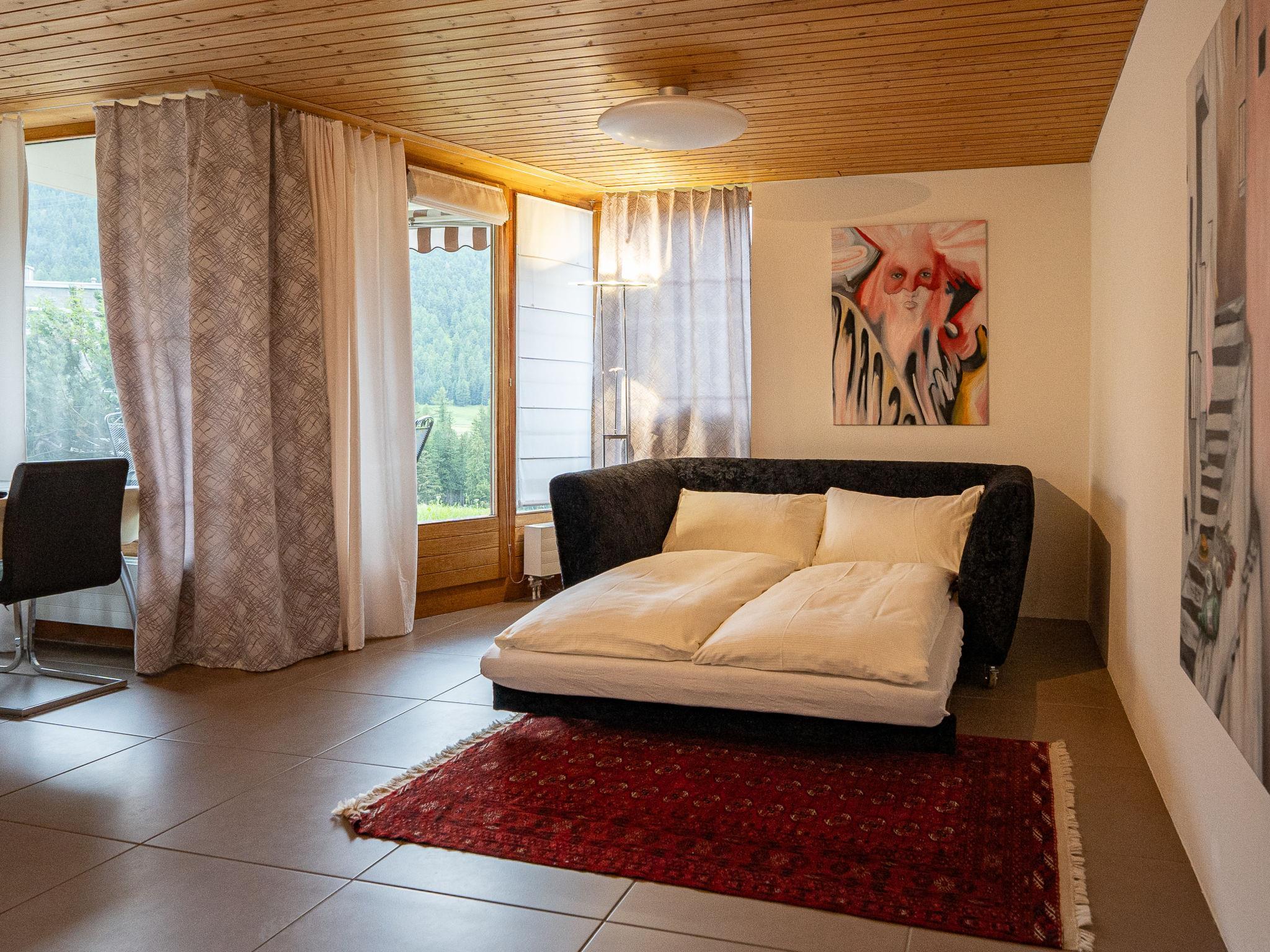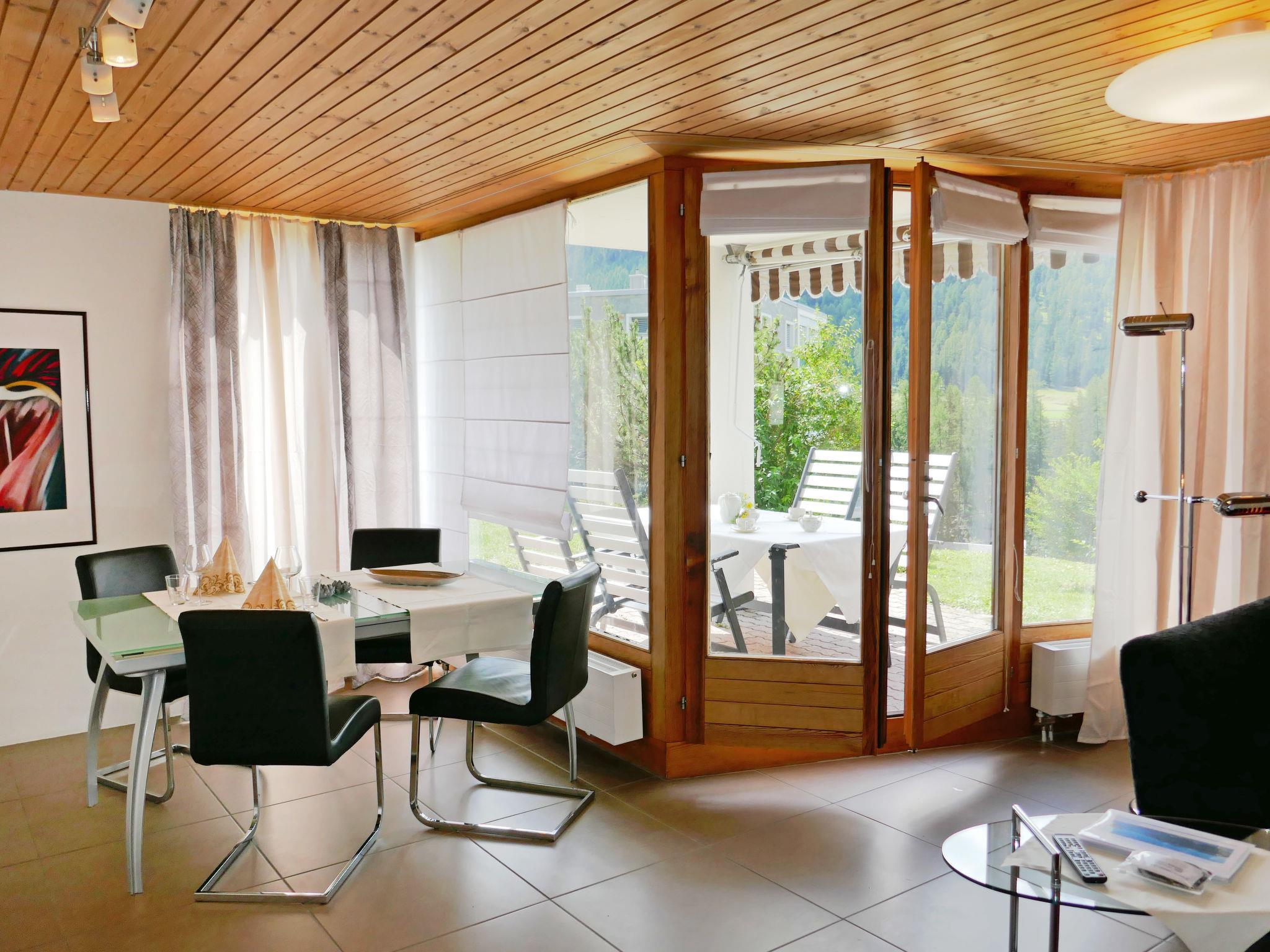 "Chesa Piz Cotschen 2", 2-Zimmer-Wohnung 45 m2, im Erdgeschoss. Hell, zweckmässig und modern eingerichtet: Wohn-/Esszimmer mit 1 Doppeldiwanbett (1 x 140 cm, Länge 200 cm) (2 Pers.), Esstisch und TV. Ausgang zum Gartensitzplatz, Richtung Süden. 1 Zimmer mit 1 Doppelbett. Küche (Backofen, Geschirrspüler, 4 Glaskeramikplatten, Toaster, Wasserkocher, elektrische Kaffeemaschine, Kapseln für die Kaffeemaschine (Nespresso) extra, Racletteofen, Fondue Set (Chinoise, Käse)). Bad/WC. Heizung. Grosser Gartensitzplatz. Terrassenmöbel. Schöne Sicht auf die Berge und die Landschaft. Zur Verfügung: Haartrockner. Internet (Wireless LAN, gratis). Garage Nr. W2 (parking lift), Höhe 150 cm, Breite 200 cm. Bitte beachten: Nichtraucher-Unterkunft, Nichtraucher-Haus. - ACHTUNG: grössere Fahrzeuge müssen in einem gebührenpflichtigen öffentlichen Parkplatz im Ort parkiert werden.