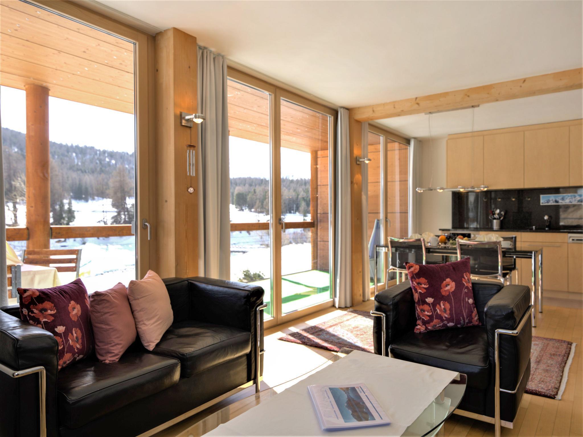 "Chesa Lej", 3-Zimmer-Wohnung 88 m2. Hell, komfortabel und modern eingerichtet: offenes Wohn-/Esszimmer mit Schwedenofen, TV, Radio und DVD. Ausgang zum Balkon, Richtung Süden. 1 Zimmer mit 1 Doppelbett (2 x 90 cm, Länge 200 cm). 1 Zimmer mit 2 Betten (90 cm, Länge 200 cm). Wohnküche (Backofen, Geschirrspüler, 4 Glaskeramikplatten, Toaster, Wasserkocher, elektrische Kaffeemaschine, Racletteofen, Fondue Set (Chinoise, Käse)). Bad/WC, Dusche/WC. Bodenheizung. Holzdielenboden. Balkon 14 m2. Balkonmöbel. Sehr schöne Sicht auf die Berge und die Landschaft. Zur Verfügung: Waschmaschine, Wäschetrockner, Bügeleisen, Haartrockner. Internet (Wireless LAN, gratis). Parkplatz Nr. M2 (überdacht), Höhe 210 cm, Breite 215 cm. Bitte beachten: nicht geeignet für Kinder unter 12 Jahren. Nichtraucher-Unterkunft, Nichtraucher-Haus. Kein Fahrstuhl. :E-Piano, wenig Schrankfläche, Zweibettzimmer verfügt nur über ein kleines Fenster.