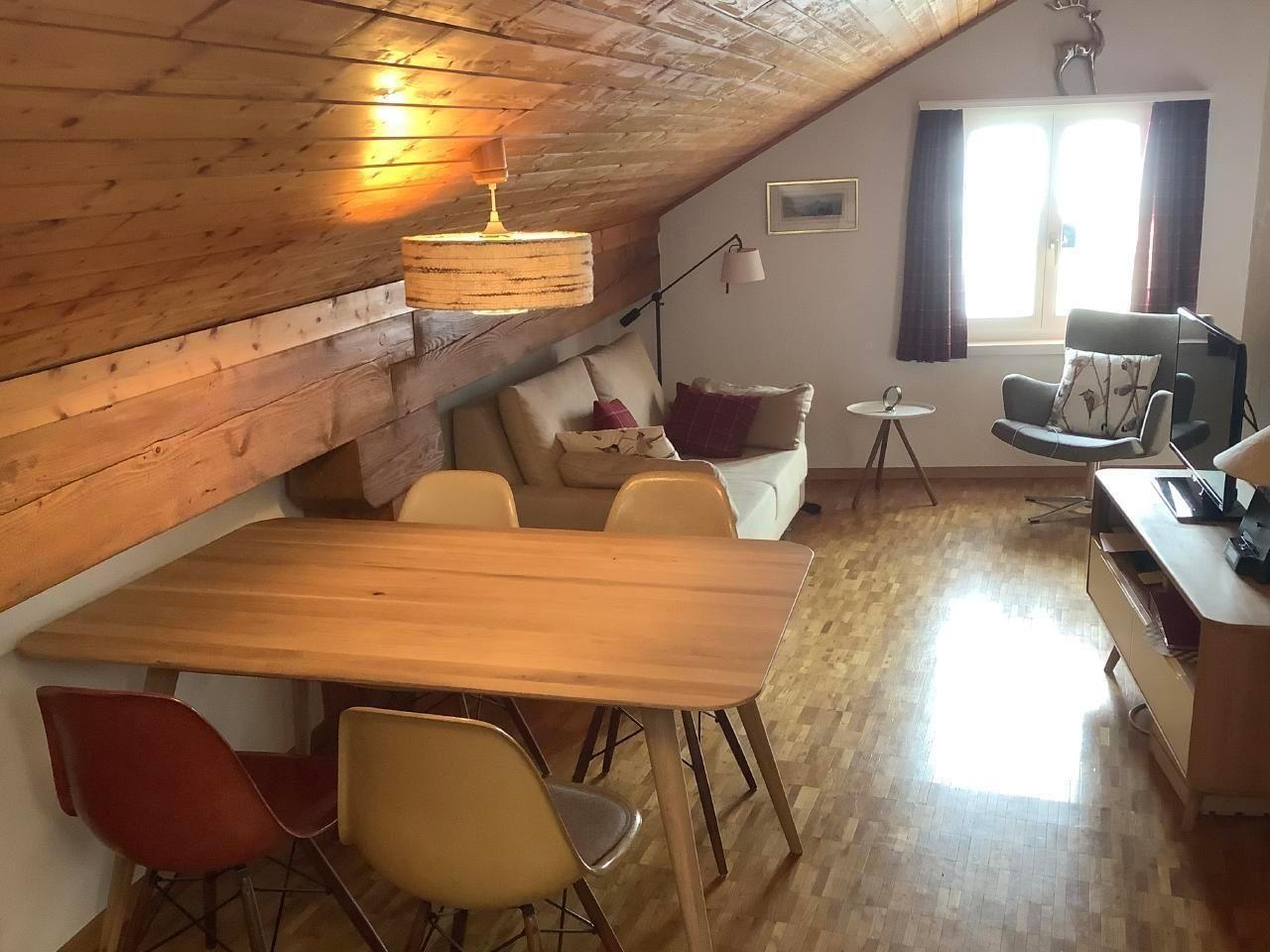 Ruhig gelegene 1,5 Zimmerwohnung (44m2) im 3. Stock (kein Lift) an sonniger Lage mit Sicht aufs Dorf und die Berge (Piz Palü). Das Wohnzimmer ist mit Swisscom TV (IPTV), Internet, DVD-Player und Radio ausgestattet. Neue, komfortable Einbauküche (2015) mit Abwaschmaschine und Backofen. Die Küche ist gut ausgestattet z.B. mit Fondue Caquelon und Raclette-Ofen.