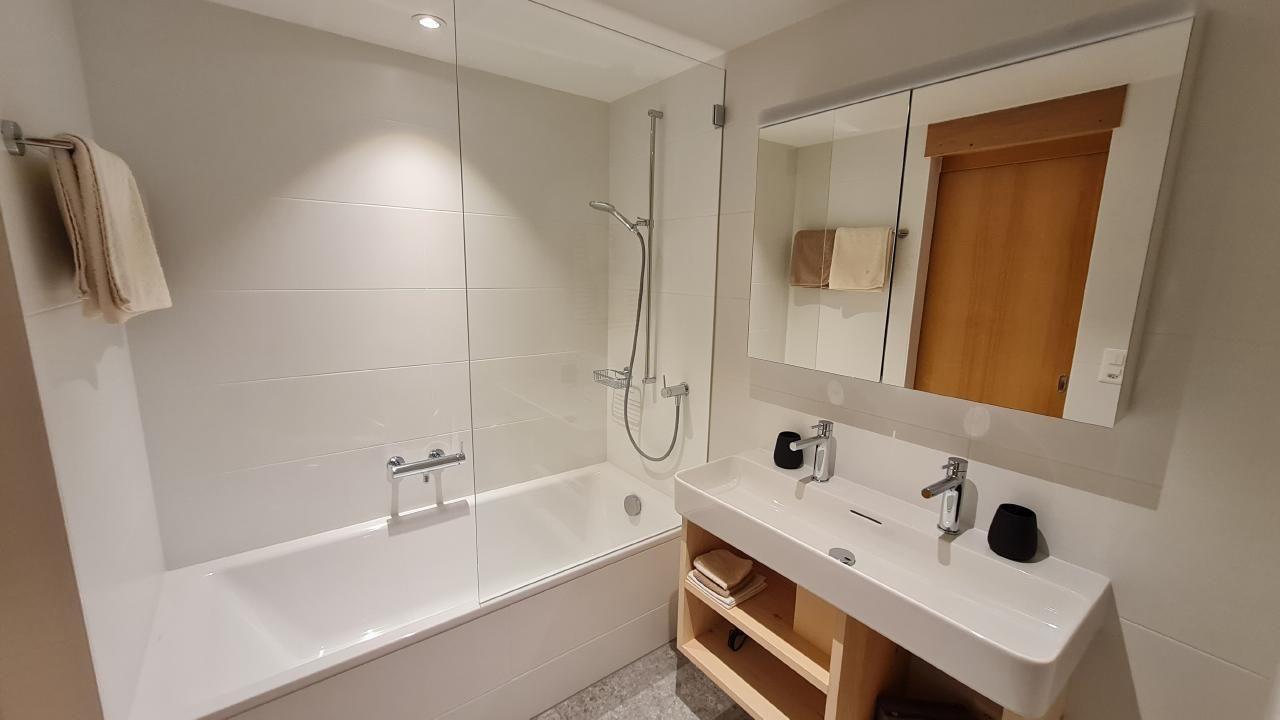 Betten angezogen. Grosse Badezimmer mit Bad oder Dusche. Jede Wohnung hat einen eigenen Balkon zur Südseite.