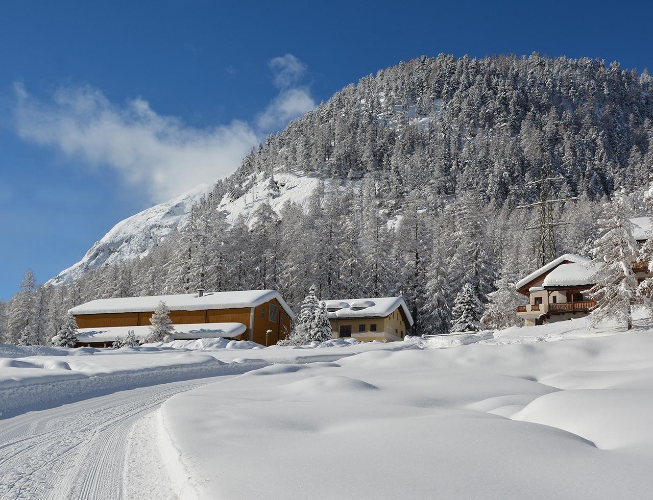 Die Wohnung befindet sich im ersten Stock der Chesa Formel. Das Gebäude liegt am Waldrand direkt am Eingang zum Val Roseg. In den kälteren Monaten ist es nicht ungewöhnlich, dass man im angrenzenden Wald einige Wildtiere zu Gesicht bekommt.