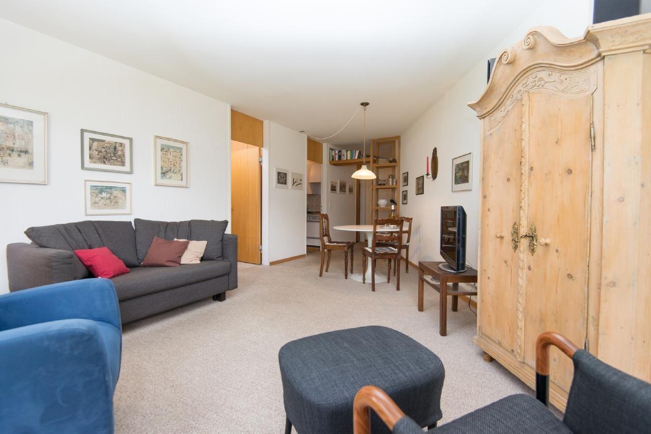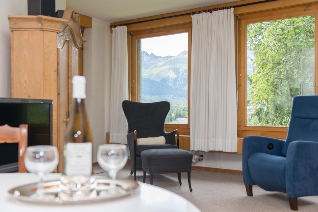 Gemütliche 2-Zimmerwohnung (54m2) mit Südwestbalkon in Haus mit gehobenem Standard. Sehr ruhig am Dorfrand gelegen mit Aussicht auf die Engadiner Bergwelt. Wohnzimmer mit SAT-TV, Radio. Separate Küche mit Geschirrspüler, Backofen, Kaffeemaschine.