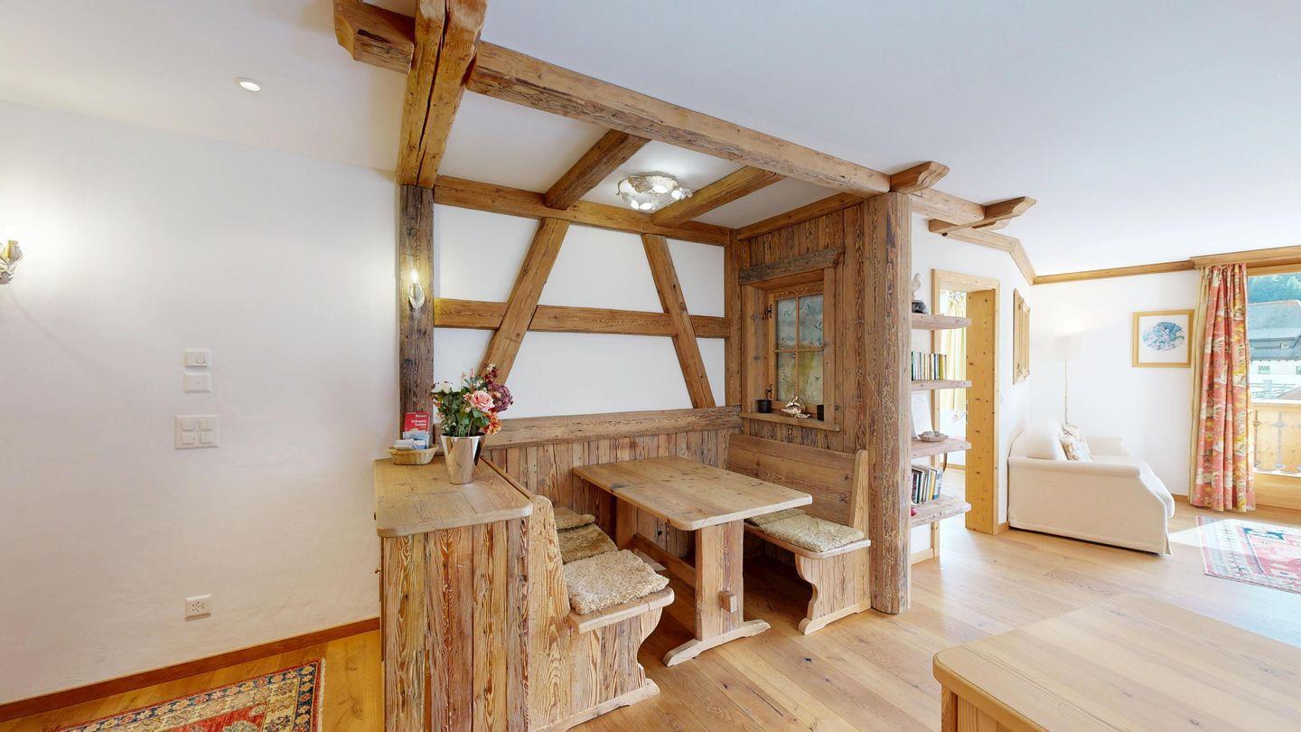 Die Wohnung ist mit viel Holz im Chalet-Stil ausgestattet und mit ausgewählten Materialien und Möbeln eingerichtet.