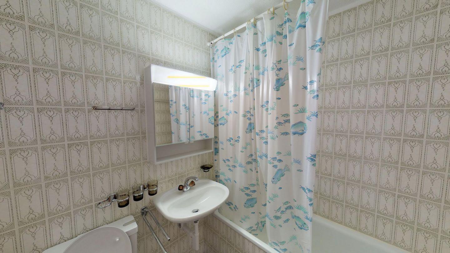 Die zweckmässige Wohnung hat ein Wohnzimmer mit Sofa und Fernseher sowie eine Eckbank mit Esstisch. Nebenan finden Sie die geschlossene und komplett ausgestattete Küche. Die Wohnung verfügt über ein Schlafzimmer mit Doppelbett sowie ein Badezimmer mit Badewanne. Im Wohnzimmer steht ein Sofabett zur Verfügung, welches für Kinder geeignet ist. Die Wohnung befindet sich im Erdgeschoss eines Mehrfamilienhauses. Zu den öffentlich zugänglichen Räumen zählen eine Waschküche mit Trockner, sowie einen Velo- und Skiraum. Ein Garagenparkplatz ist inbegriffen (Achtung: der Garagenparkplatz kann nicht mit grösseren Fahrzeugen wie SUV's genutzt werden, auch tiefergelegte Autos wie Audi S4, 3er BMW eignen sich nicht für den Platz).