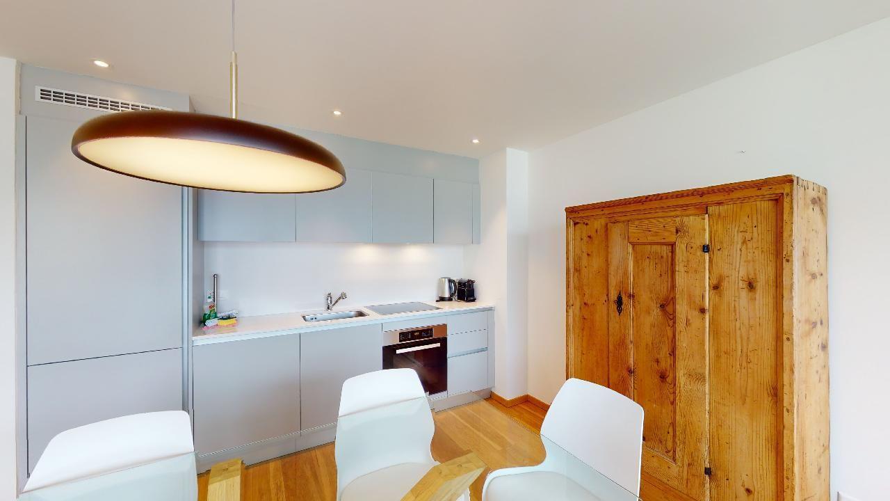Die Ferienwohnung verfügt über ein Wohn- und Esszimmer mit offener Küche. Die Küche ist mit modernsten Geräten ausgestattet und komplett eingerichtet. Ein Esstisch für 6 Personen steht zur Verfügung und von der Küche gelangen Sie auf den Balkon mit einer wunderschönen Aussicht in Richtung Piz Padella und Corviglia. Das Wohnzimmer hat zwei Sofas und ein Fernseher. Sie finden ein Schlafzimmer mit einem Doppelbett und En-Suite Badezimmer mit begehbarer Dusche. Das zweite Schlafzimmer verfügt über zwei Einzelbetten. Es steht ein weiteres Badezimmer mit Dusche zur Verfügung. Die Wohnung verfügt über einen Skiraum sowie eine private Waschküche. Ebenfalls gehört zur Wohnung ein Garagenparkplatz.