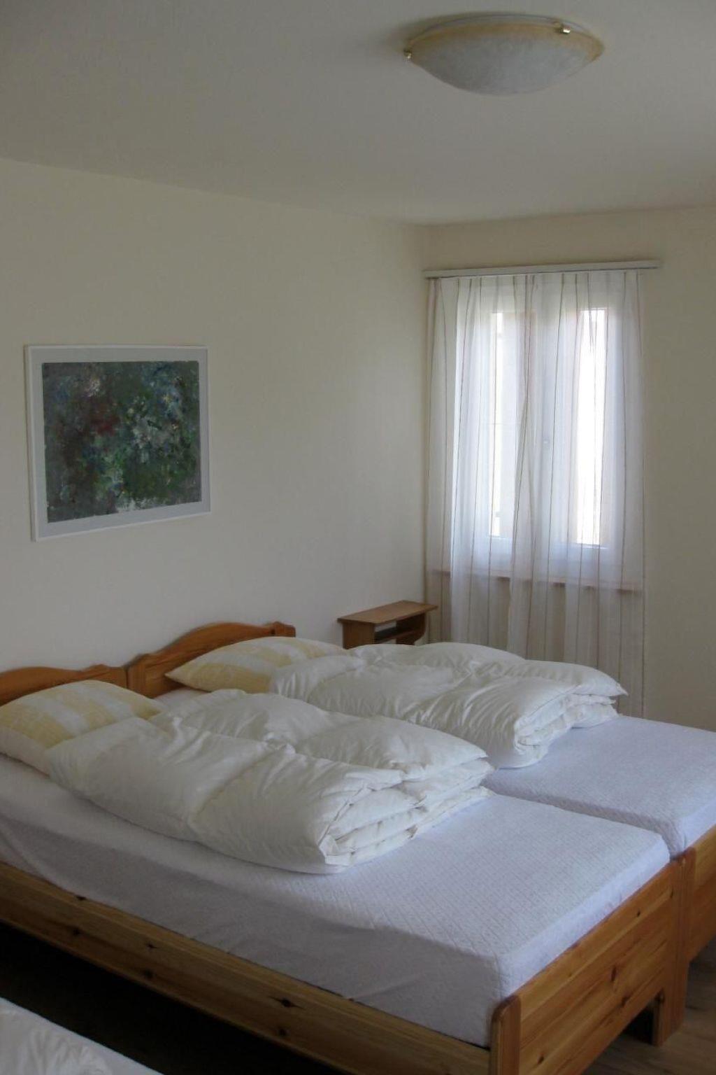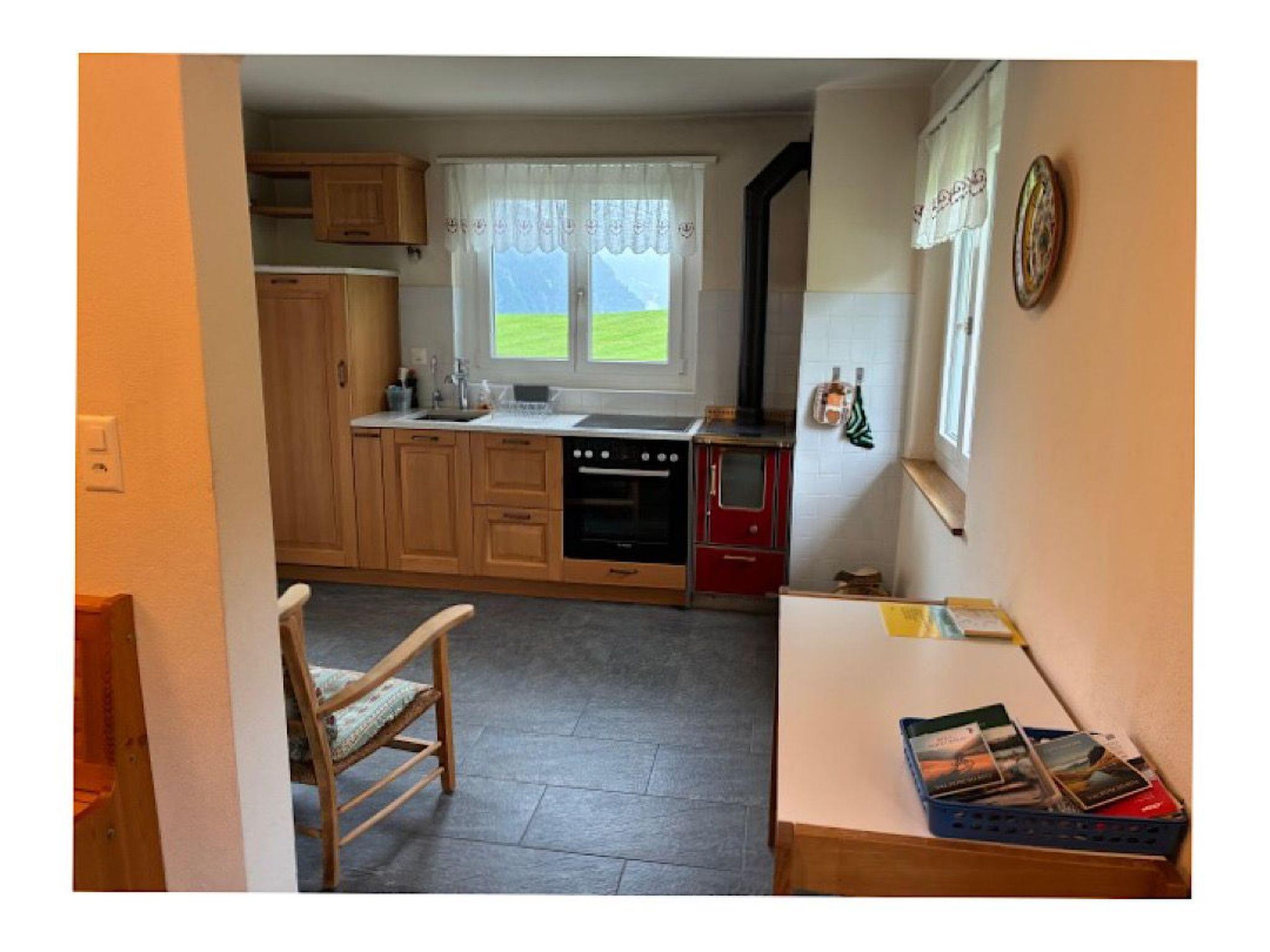 Die Innenausstattung der sorgfältig renovierten Wohnung im ersten Stock verbindet modernen Komfort mit traditionellem Charme und ist direkt von der Außenwiese zugänglich. Sie bietet zwei gemütliche Schlafzimmer und ein Wohnesszimmer, das mit einer renovierten Küche ausgestattet ist. Hier finden Gäste neben einem Holz- und Elektroherd auch einen Kühlschrank. Ein neues Badezimmer mit Dusche, Boiler, WC und Waschmaschine sowie elektrische Heizungen und ein Holzofen sorgen das ganze Jahr über für behagliche Wärme.