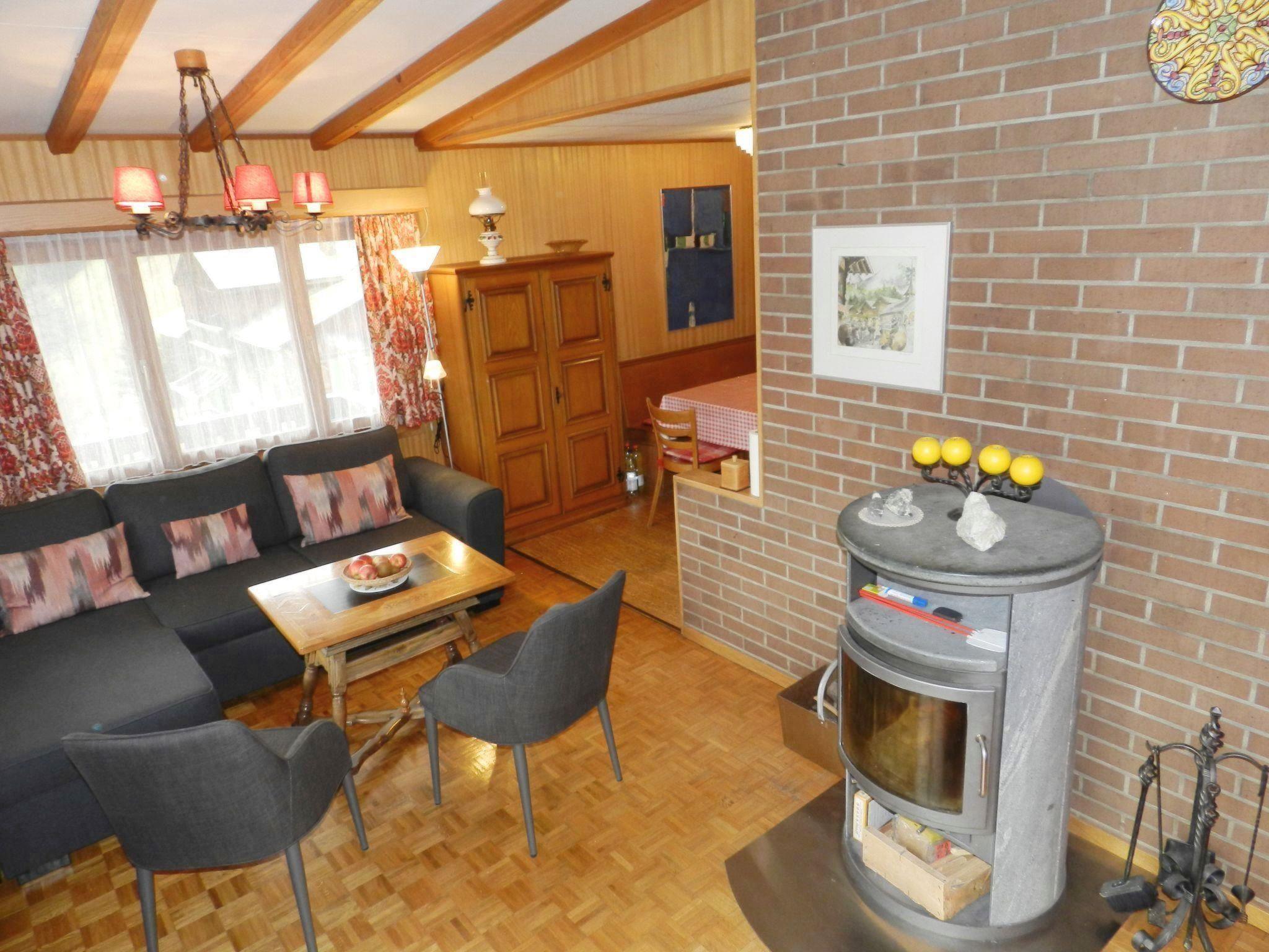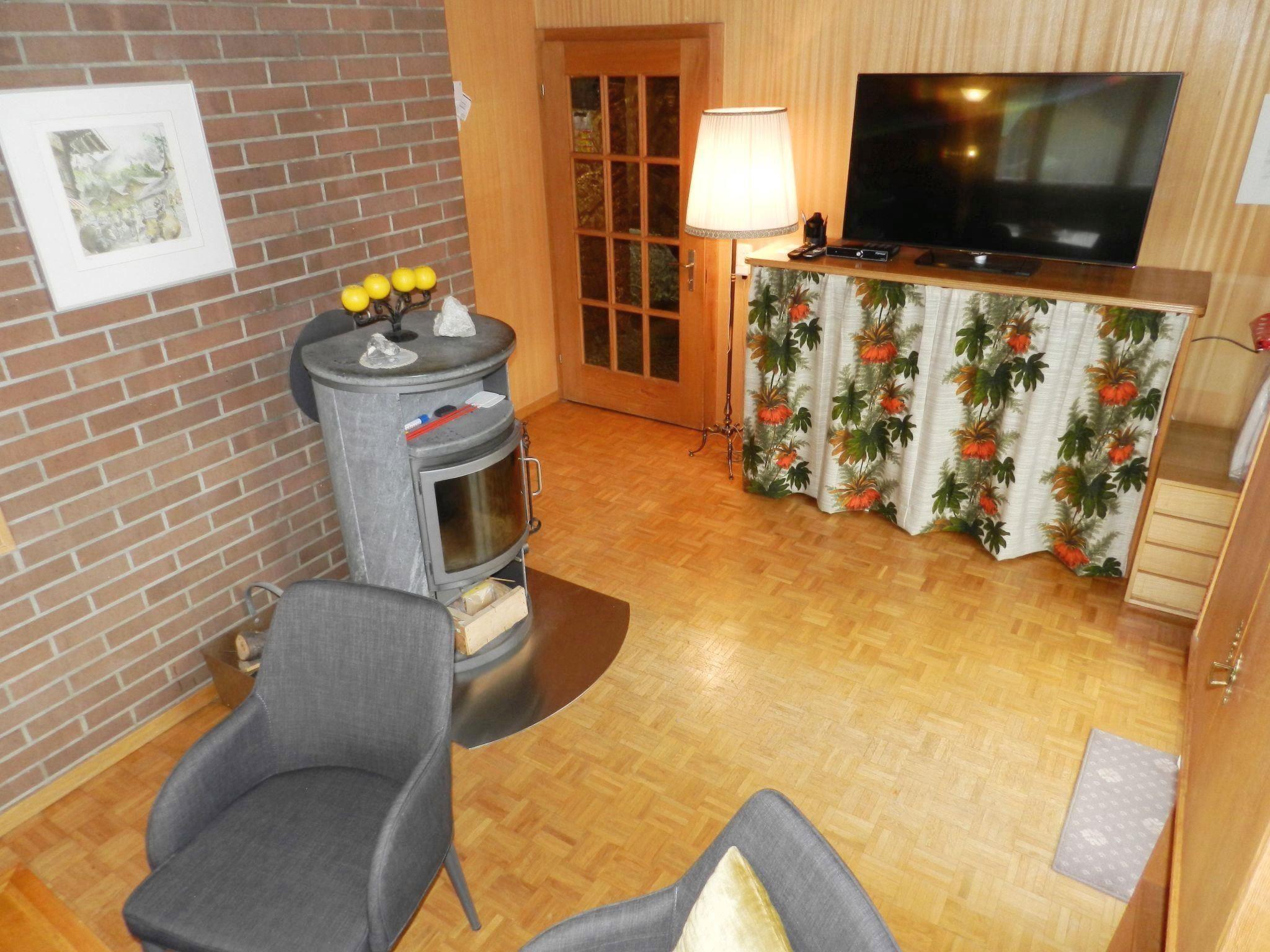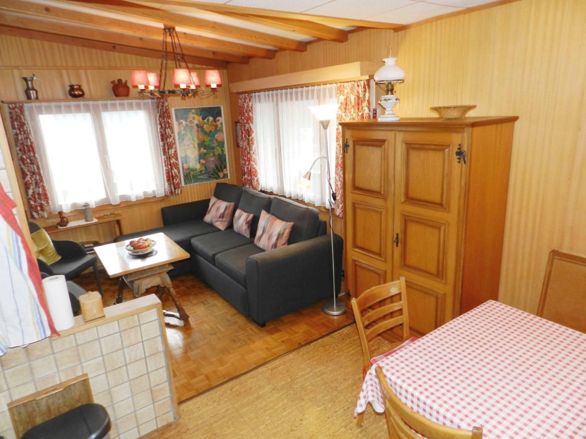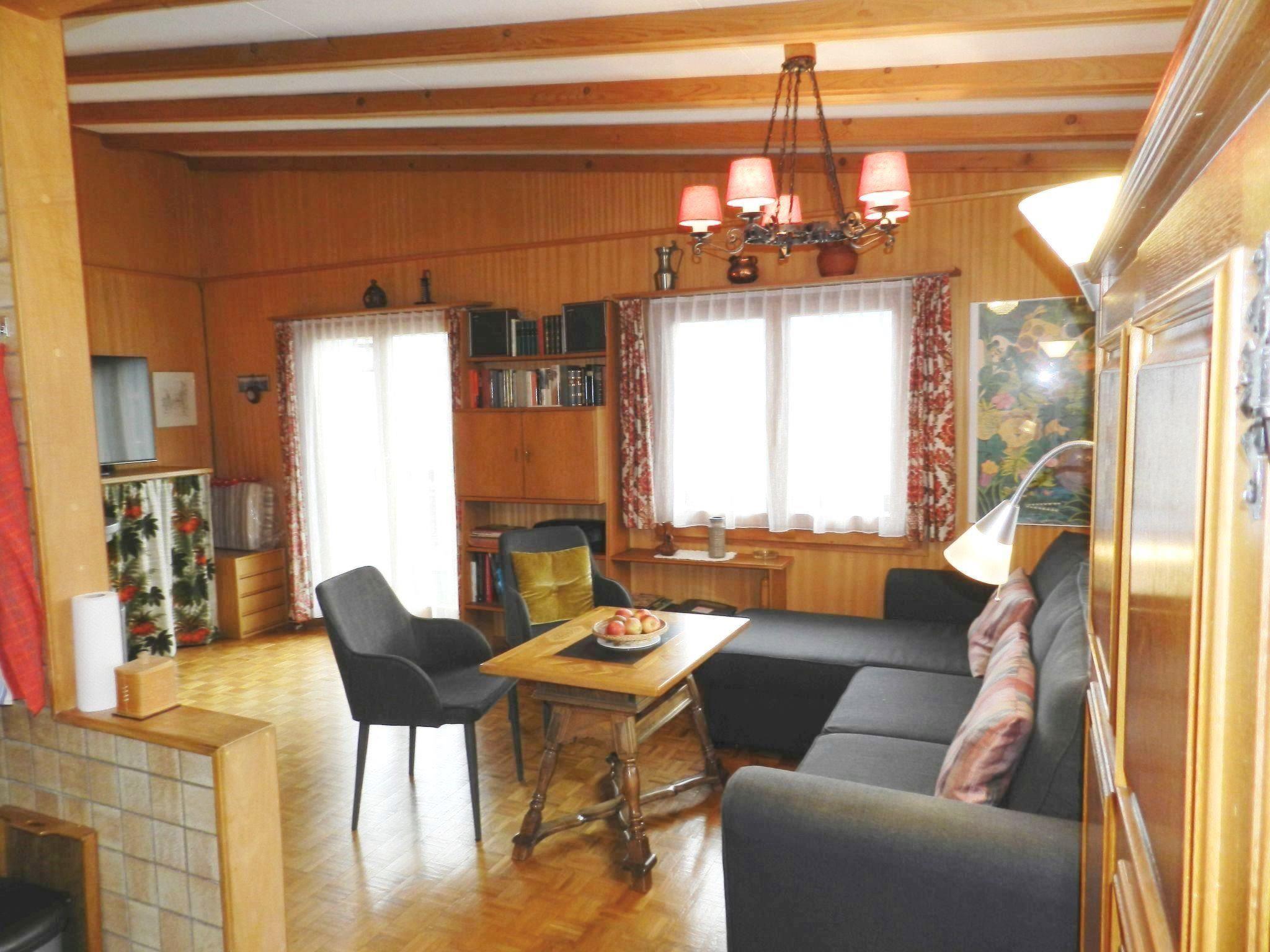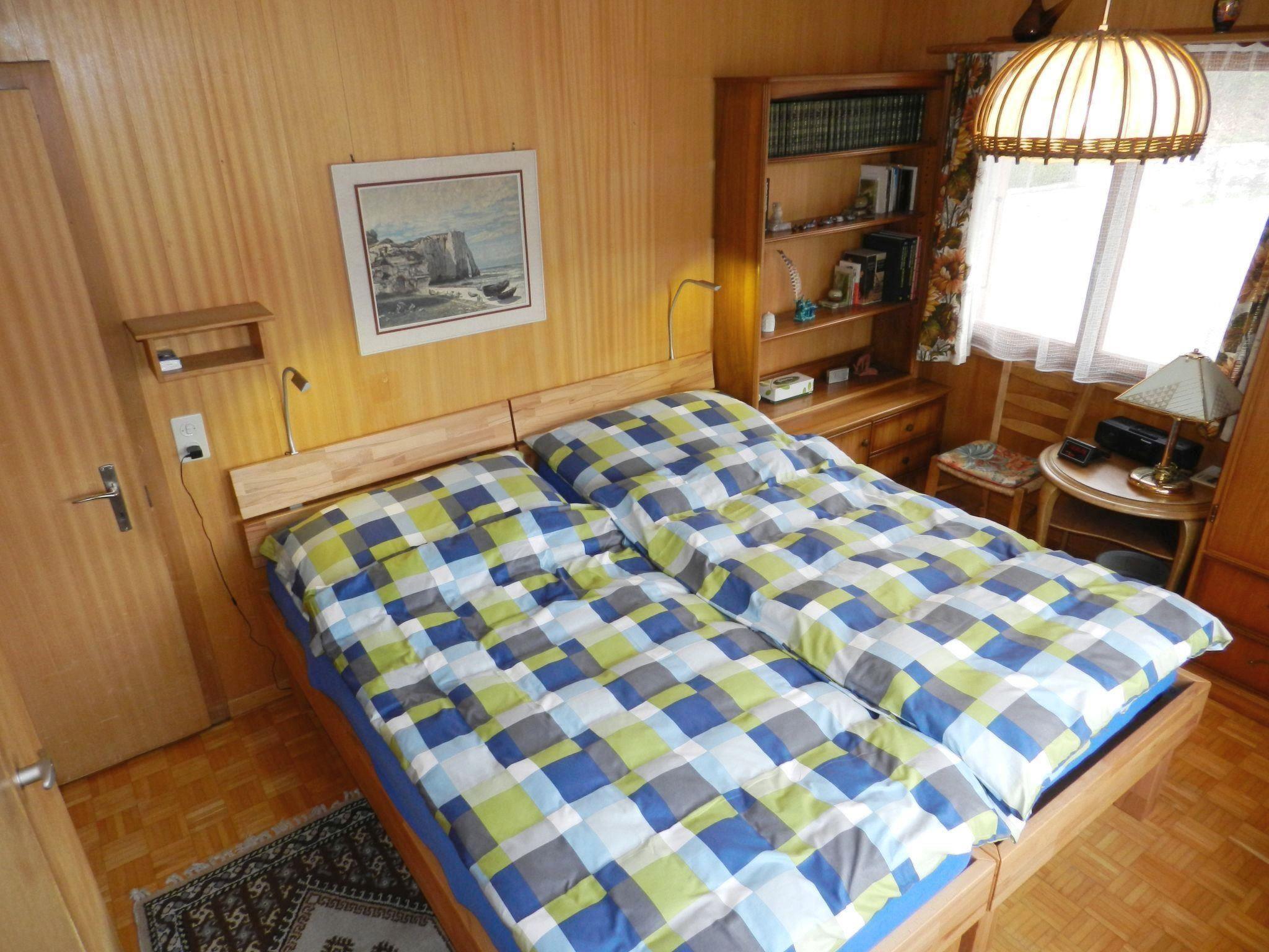 Wohn-/Esszimmer mit Sofa (Bettsofa 140x200cm), Schwedenofen, TV, Esstisch und offener Küche (u.a. ausgestattet mit Backofen, Geschirrspüler, Kühlschrank mit Gefrierfach, Kapsel-Kaffeemaschine (Delizio) sowie Fondue- und Raclette-Set). 1 Schlafzimmer mit 2 zusammengeschobenen Einzelbetten (2x90x200cm). 1 Schlafzimmer mit 2 Einzelbetten (je 90x190cm). 1 Badezimmer mit Badewanne/WC und kombinierter Waschmaschine/Wäschetrockner. WiFi.
