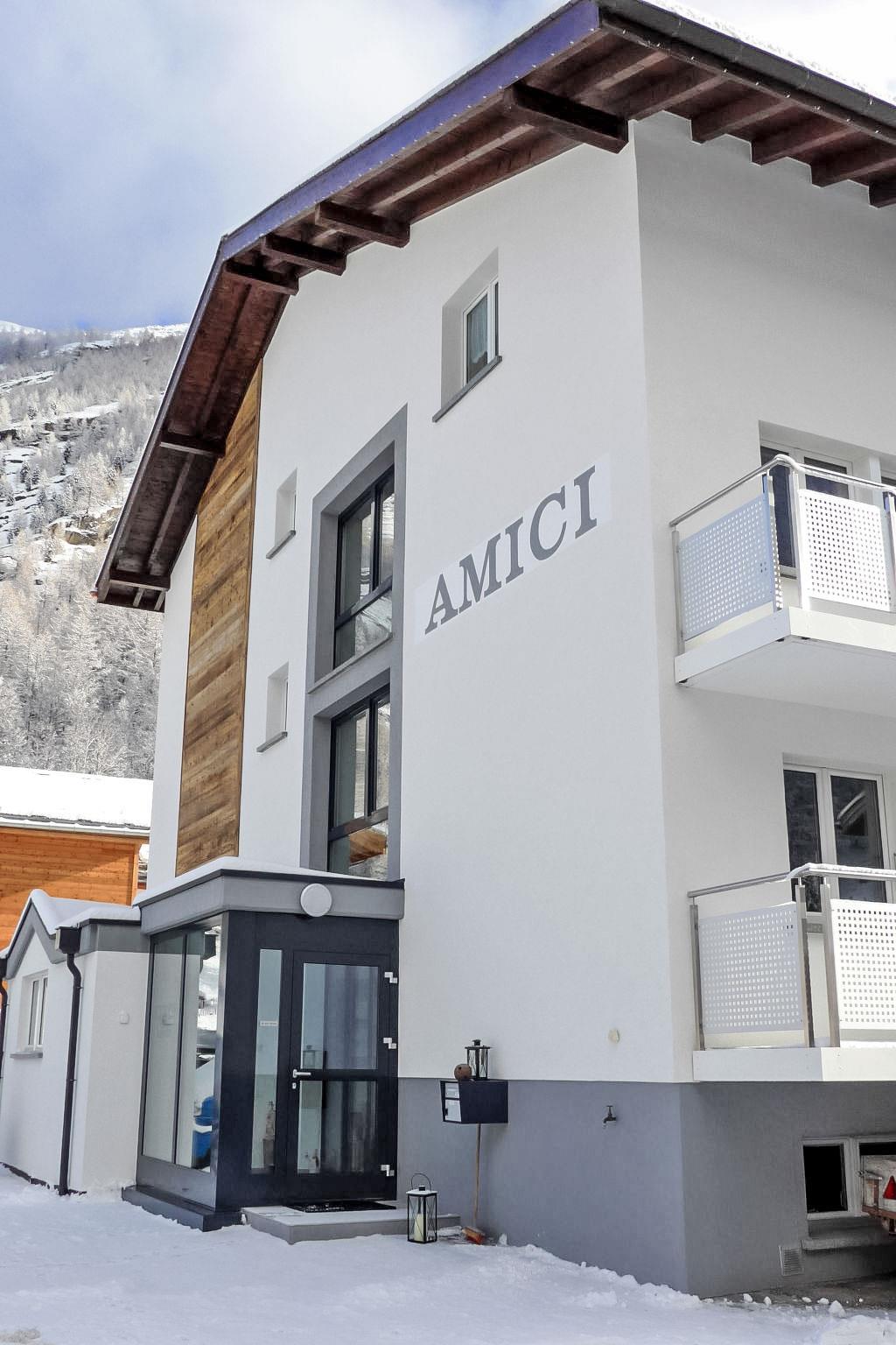 Appartementhaus "Amici", 1'590 m.ü.M., auf 4 Stockwerken. Ausserhalb des Ortes, 1.5 km vom Zentrum von Saas Grund, ruhige, sonnige Lage, 1.5 km vom Skigebiet. Zur Mitbenutzung: Liegewiese. Grill, Kinderspielplatz (Rutschbahn, Schaukel, Sandkasten). Im Hause: Skiraum, Zentralheizung, Waschmaschine, Wäschetrockner (zur Mitbenutzung, extra). Zufahrt bis zum Haus. Parkplatz beim Haus. Einkaufsgeschäft 1.5 km, Bushaltestelle 100 m. Luftseilbahn 1.5 km, Gondelbahn 1.5 km, Skisportanlagen 1.5 km, Skipisten 1.5 km, Skischule 1.5 km, Langlaufloipe 50 m, Eisfeld 1.5 km. Bitte beachten: Der Besitzer wohnt auf dem gleichen Grundstück. Weitere Unterkünfte sind buchbar. Bitte beachten: Nichtraucher-Haus. Mit der SaastalCard erhält man diverse Ermässigungen bei den Bergbahnen sowie gratis regionale Busse im Saastal. 1 Parkplatz pro Wohnung inbegriffen, jeder zusätzliche Parkplatz (CHF 5.00/Tag) NUR nach Rücksprache und Verfügbarkeit.
