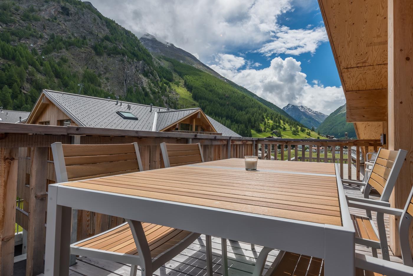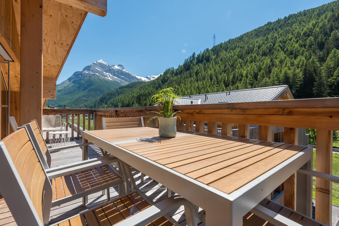 Terrasse oder Balkon (jeweils teilüberdacht) mit Mobiliar.
