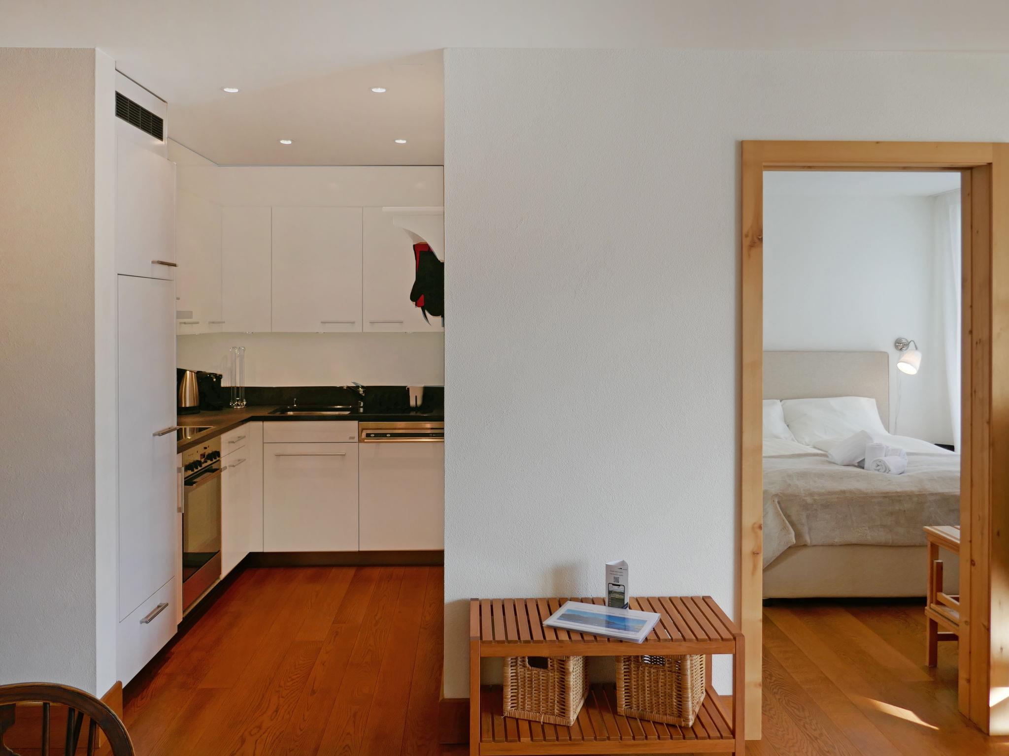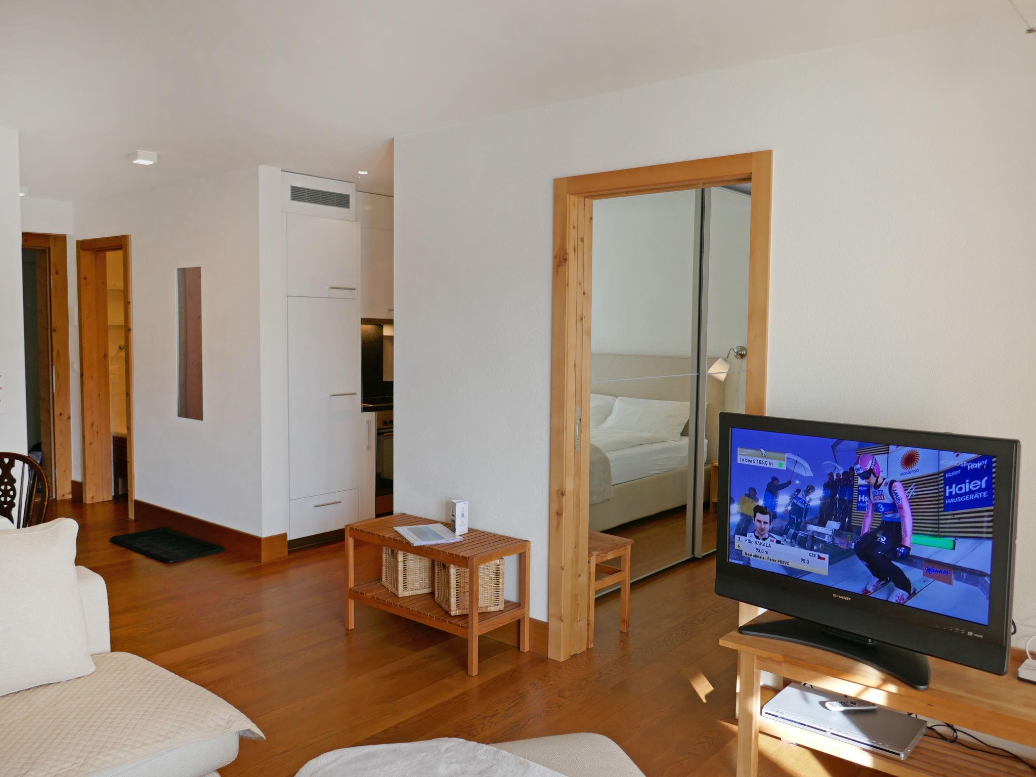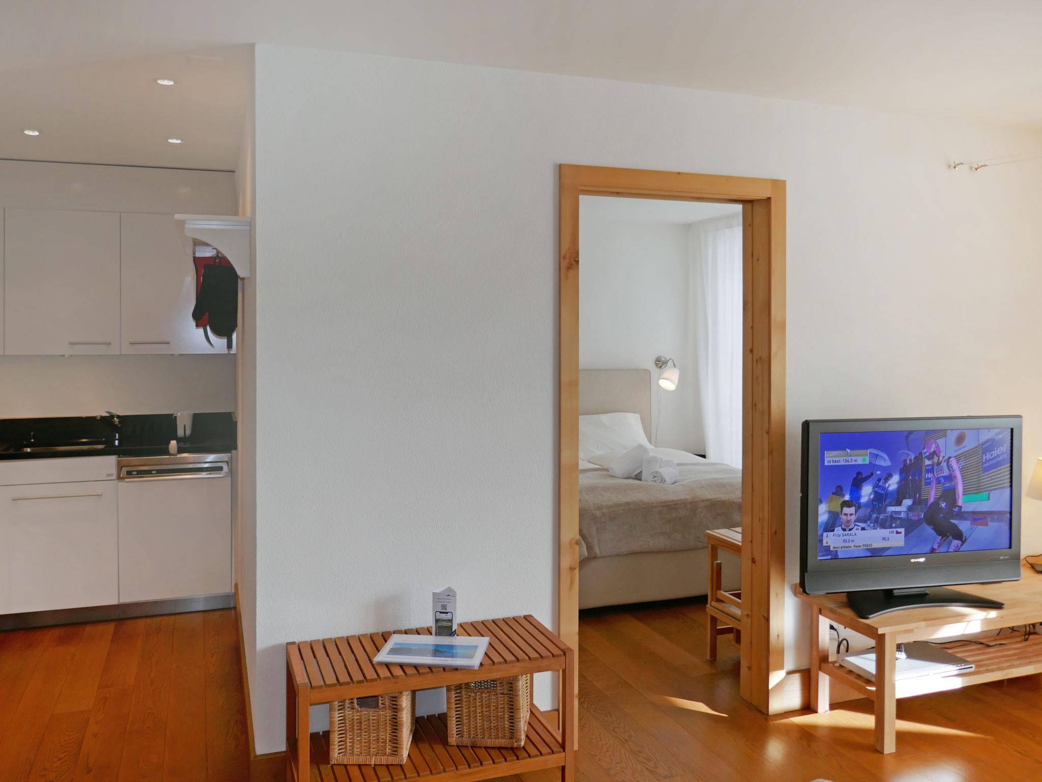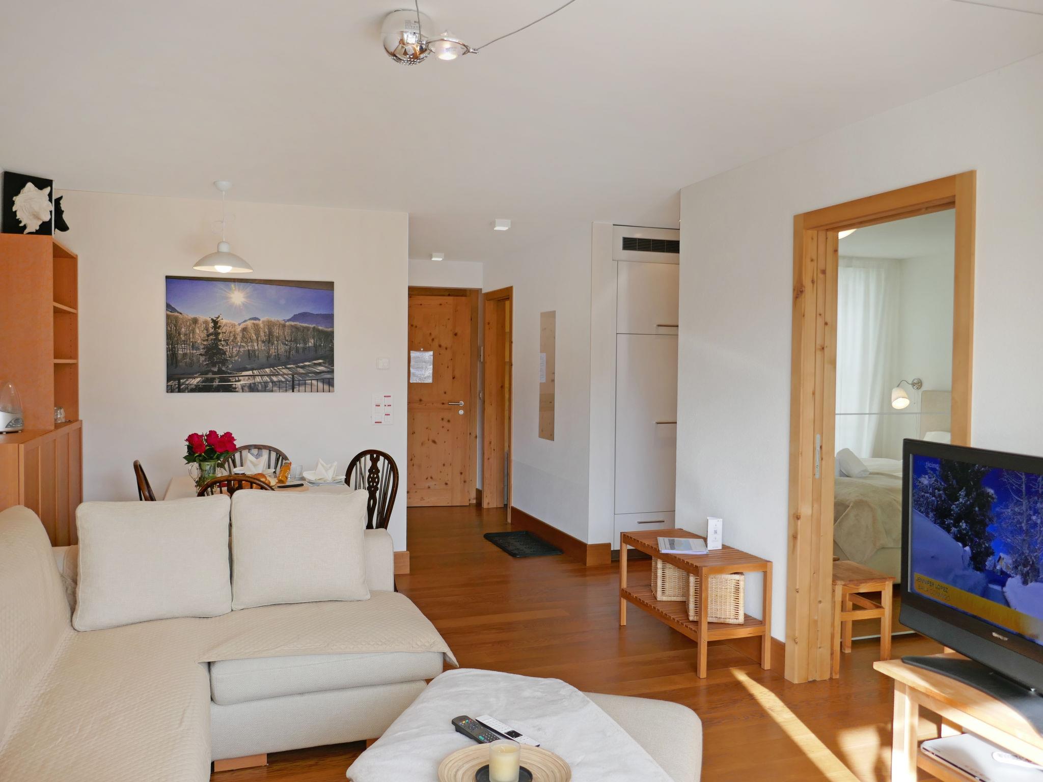 "Chesa San Bastiaun B5", 2-Zimmer-Wohnung 45 m2 im 1. Stock. Geschmackvoll und gemütlich eingerichtet: offenes Wohn-/Esszimmer mit Panoramafenster mit Esstisch und TV (Flachbildschirm), DVD. Ausgang zum Balkon. 1 Zimmer mit Panoramafenster mit 1 franz. Bett (1 x 160 cm, Länge 200 cm). Kleine, offene Küche (Backofen, Geschirrspüler, 4 Glaskeramikplatten, Toaster, Wasserkocher, elektrische Kaffeemaschine, Kapseln für die Kaffeemaschine (Nespresso) extra, Racletteofen). Bad/Bidet/WC. Fussbodenheizung. Parkettboden. Balkonmöbel. Sehr schöne Sicht auf die Landschaft und den Fluss. Zur Verfügung: Haartrockner. Internet (Wireless LAN, gratis). Garage Nr. B5 auf dem Grundstück (1 Auto), Höhe 230 cm, Breite 250 cm. Bitte beachten: Nichtraucher-Unterkunft, Nichtraucher-Haus.
